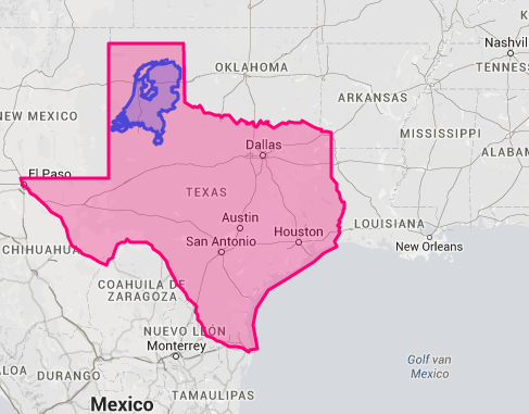 Nederland vergelijkbaar met Texas.Onze ronde begint in Houston en we rijden dan via o.a. Dallas, Fort Worth, Amarillo, Alamorgordo, Carlsbad, Fort Davis, Big Bend National Park, Del Rio, San Antonio, Fredericksburg en Austin weer terug naar Houston. We zijn 20 dagen onderweg geweest. De route was ongeveer 5300 km.