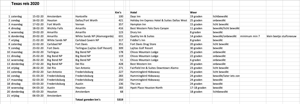 We kennen elkaar niet, maar ik verheug me nu al op jullie verslag vanuit Texas, want wij plannen voor oktober / november dit jaar nagenoeg hetzelfde rondje. Dus ik ben heel benieuwd naar jullie ervaringen. Heel veel plezier alvast!
