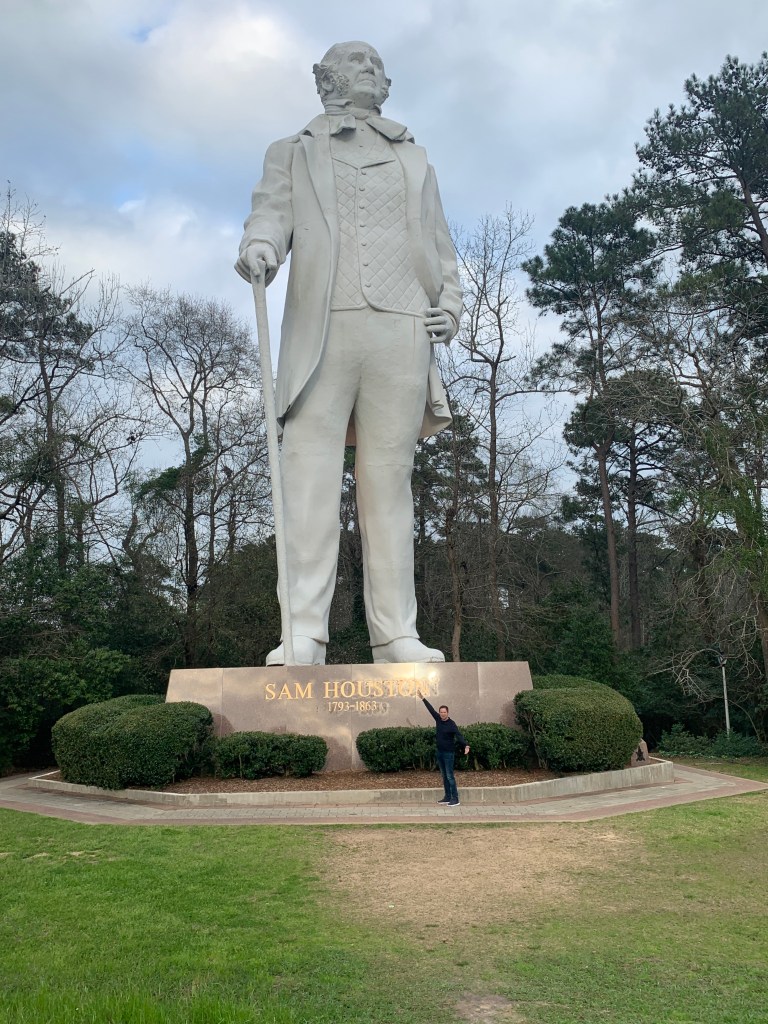 Net voor Huntsville gaan we de snelweg af om even bij het standbeeld van Sam Houston te kijken. Er is een Visitor Center, vanaf daar loop je via een pad binnen enkele minuten naar het beeld. Het beeld zie je niet over het hoofd, het is ongeveer 20 meter hoog. Vanaf de snelweg I45 kun je het beeld ook goed zien. Sam Houston was president van Texas, toen de staat nog onafhankelijk was. De stad Houston is naar hem vernoemd.
