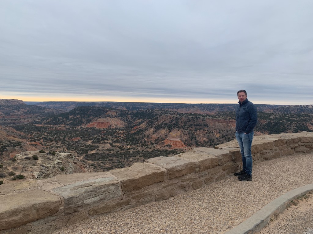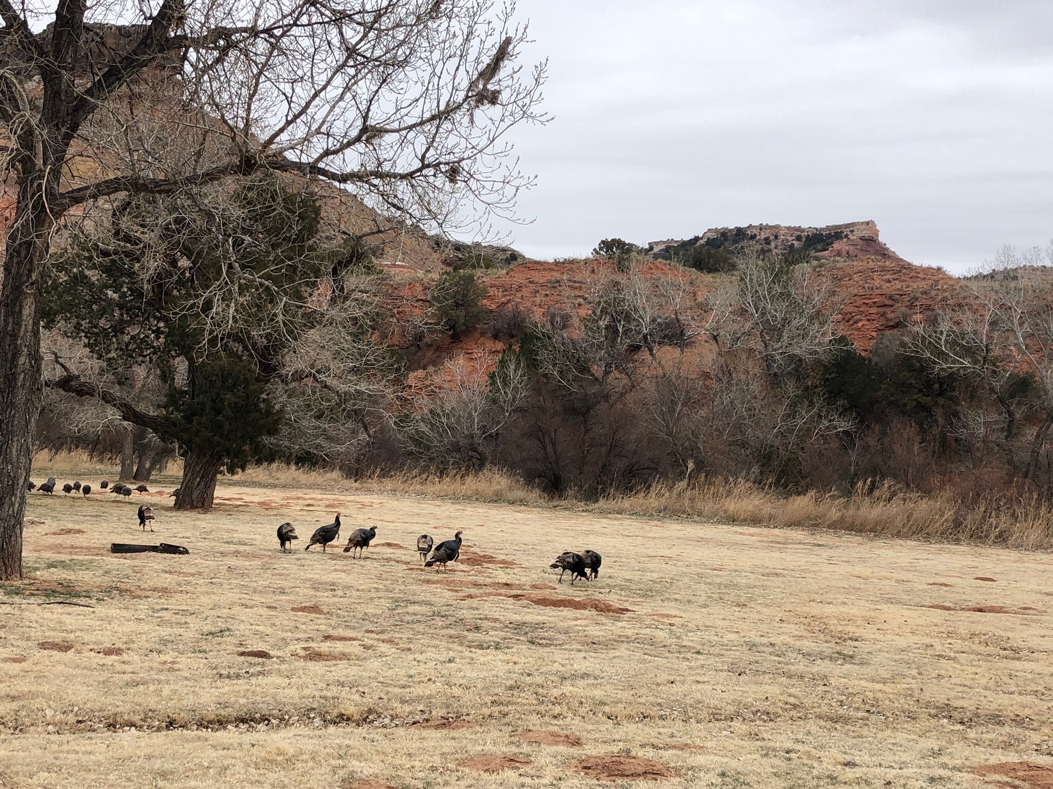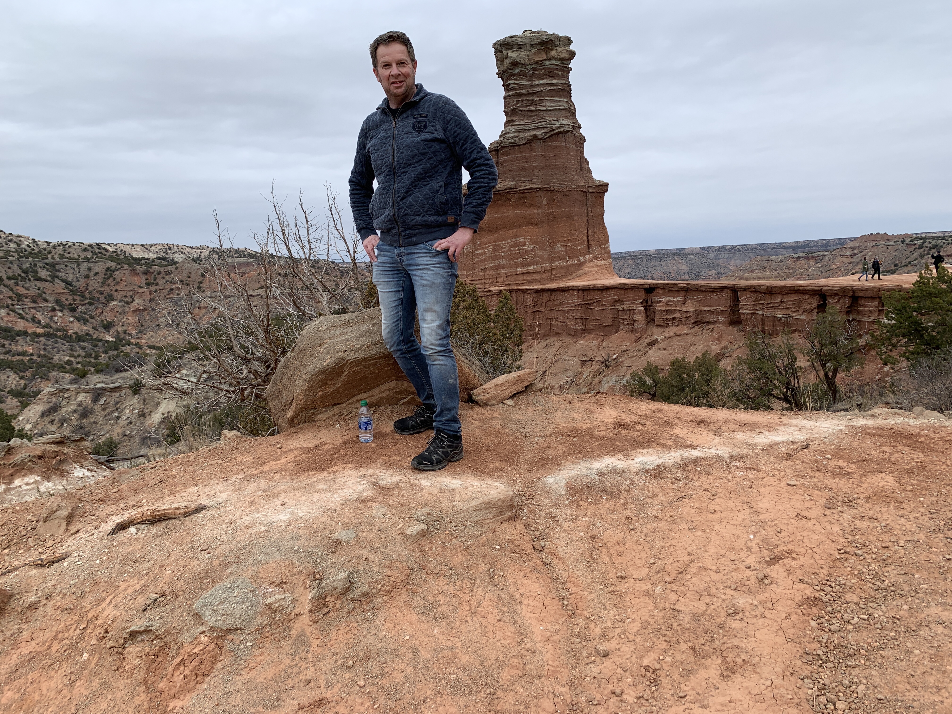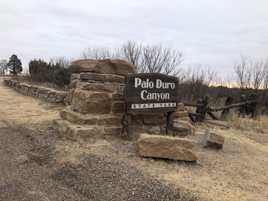 Om 10 uur zijn we vertrokken uit het hotel. Buiten is het maar 1 graad, koud dus. Dit maal geen lange rit. We hoeven nu alleen de weg maar uit te rijden en dan komen we bij het Palo Duro Canyon State Park. Enige is dat je dan wel de goeie kant moet oprijden, dat deden we dus niet. Toen de weg ophield bij een kruising kwamen we erachter dat we de verkeerde kant op waren gegaan. Dus omdraaien en de goeie kant op. Eerst een heel stuk over de vlakte en dan in eens doemt de Palo Duro Canyon op. Om half 11 komen we aan in het park.