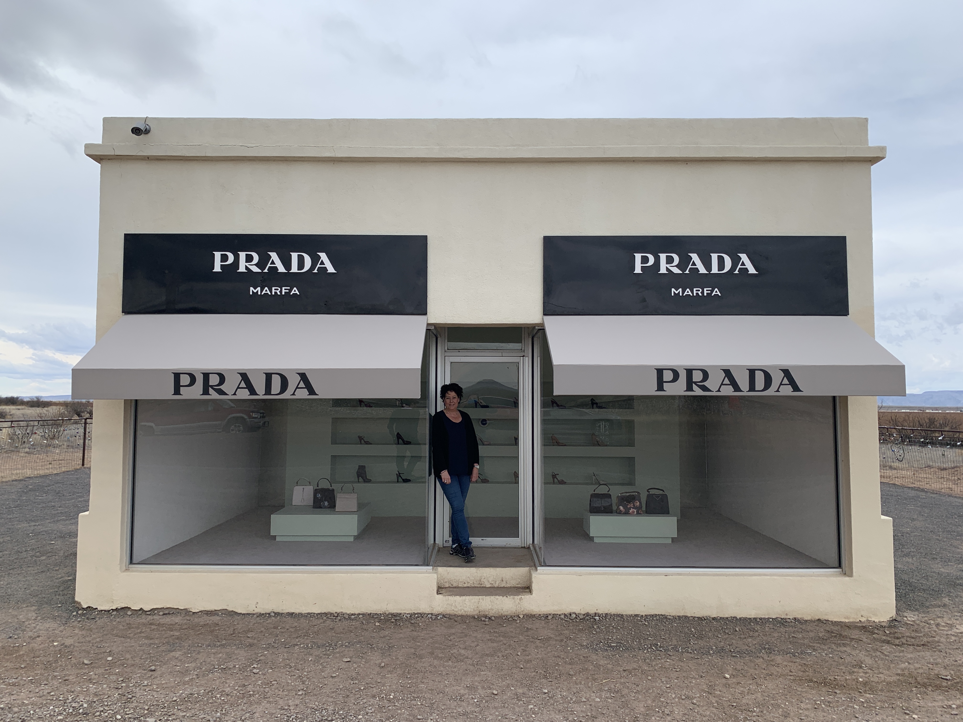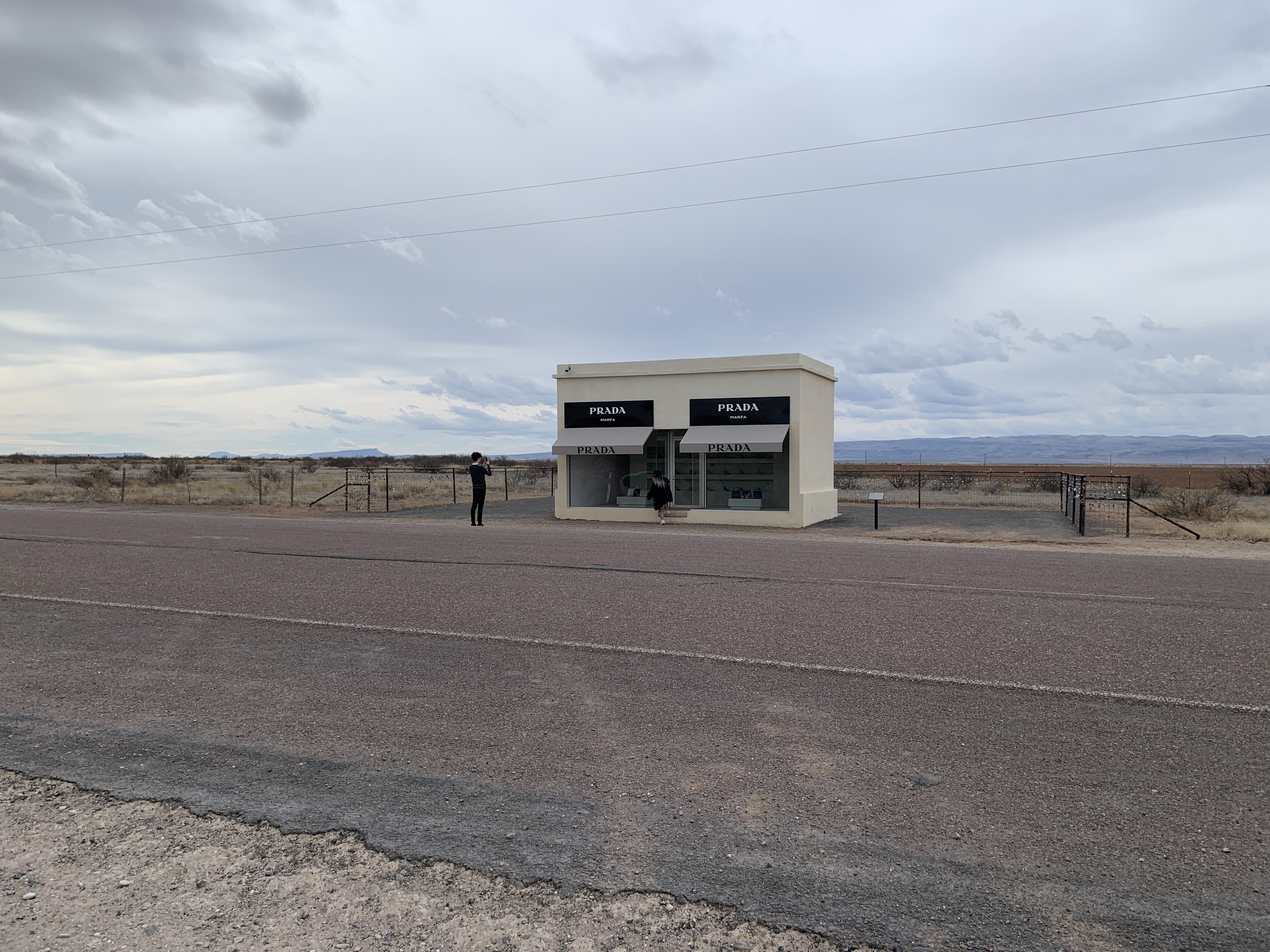 Net voorbij Valentine staat in de middle of nowhere zowaar een showroom van Prada. In de showroom worden schoenen en tasjes geshowd. Het is een erg fotogeniek plek. Een showroom met daarom heen de kale uitgestrekte vlakte. Aan de hek rondom het gebouw zijn door bezoekers slotjes gehangen.