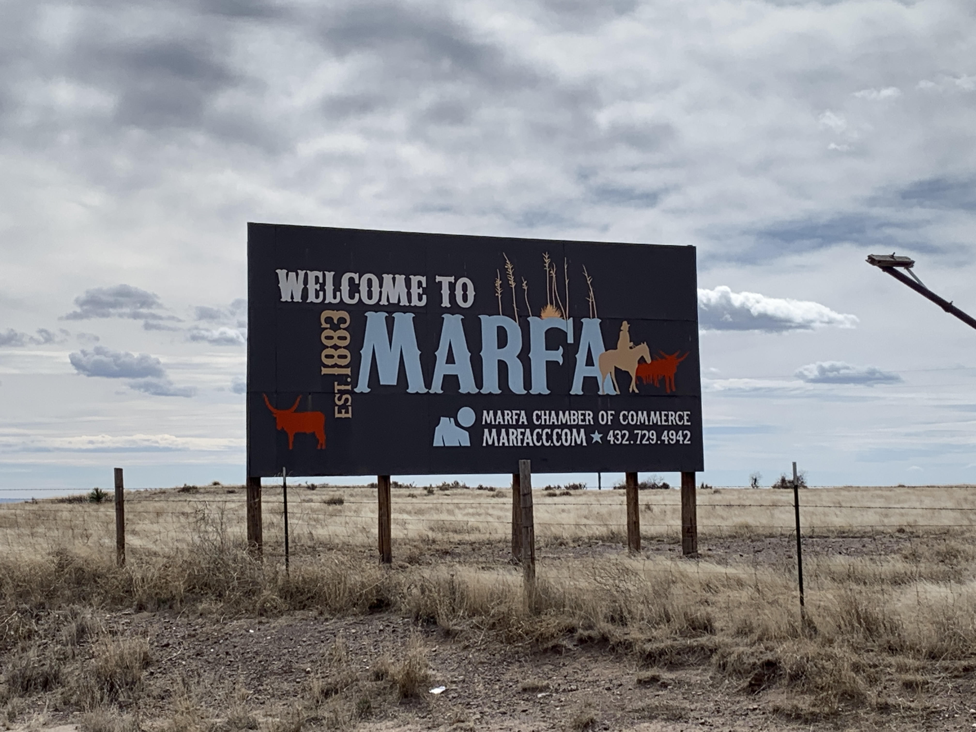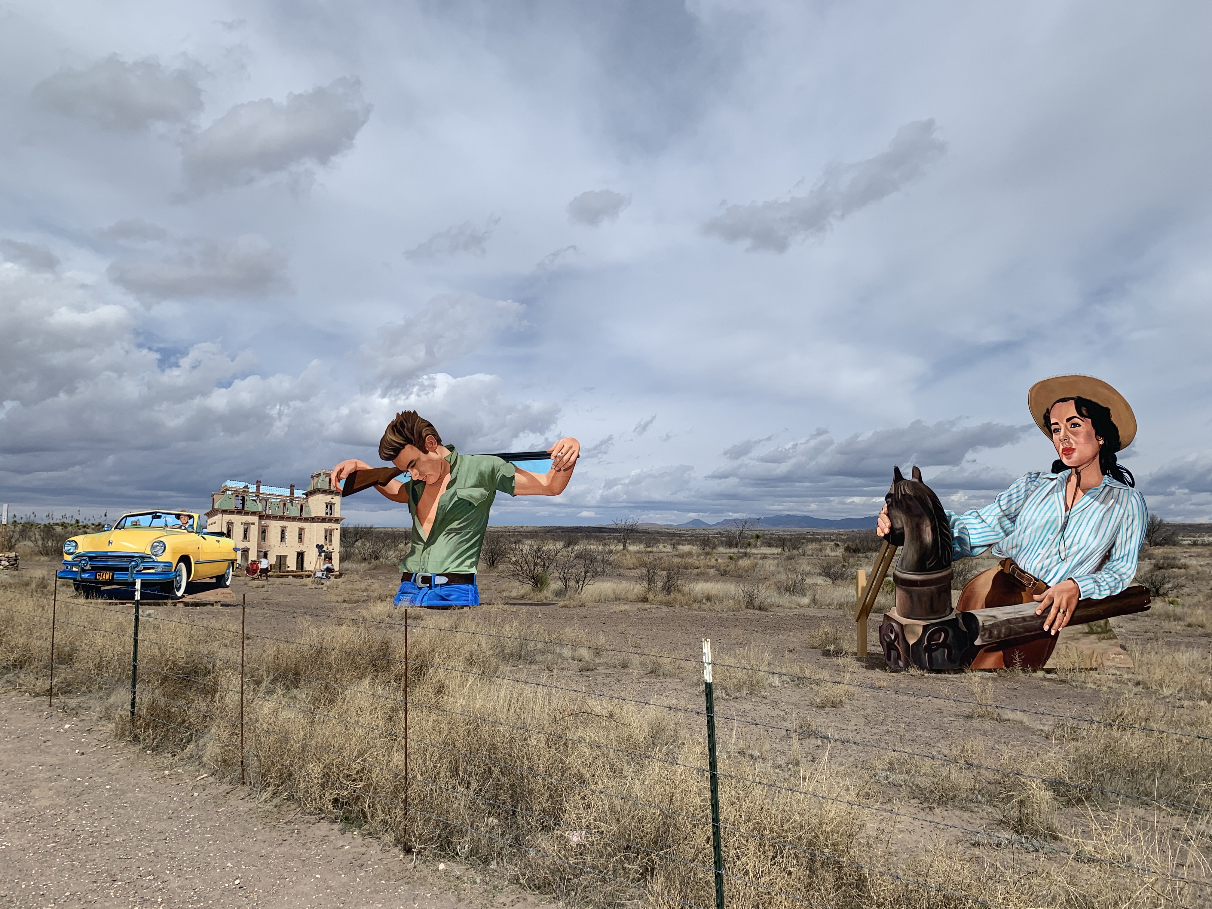 We gaan weer terug via Valentine naar Marfa. Enkele kilometers voor Marfa zien we een soort decor van een filmset. Deze staan langs de weg in het open veld. Het is de filmset met maquettes van o.a. filmacteur James Dean en filmactrice Elisabeth Taylor. De film Giant is in de omgeving van Marfa opgenomen.