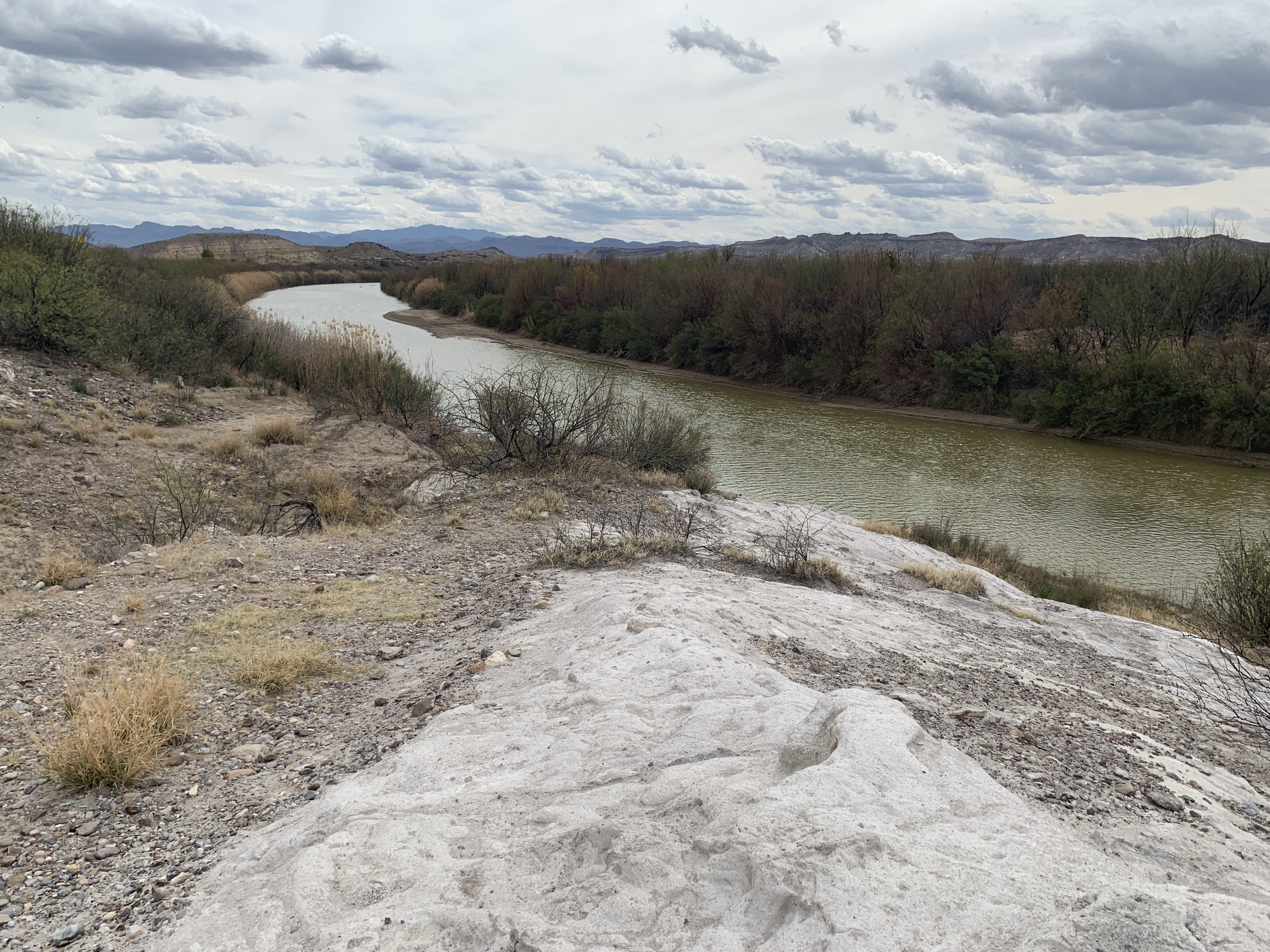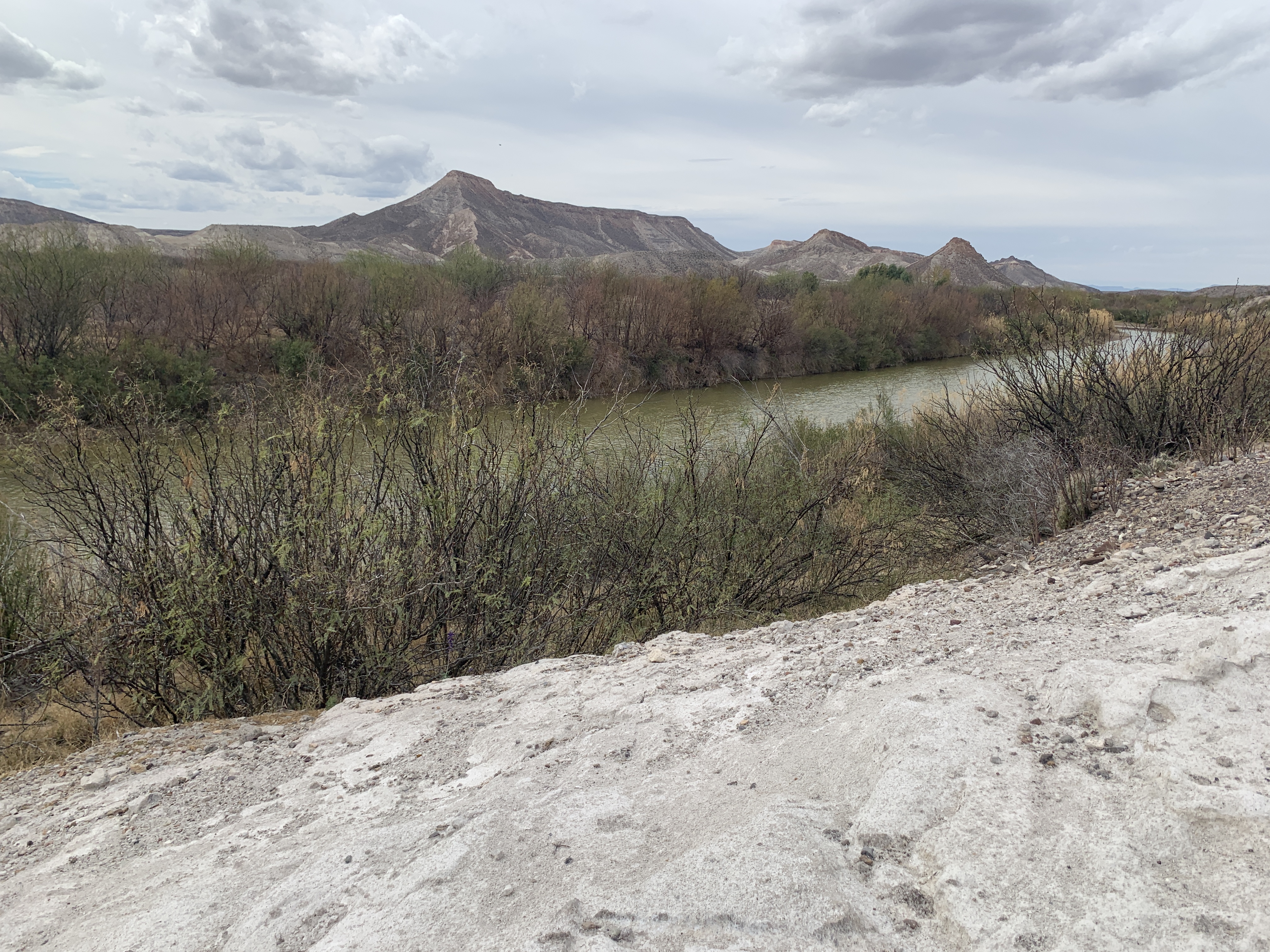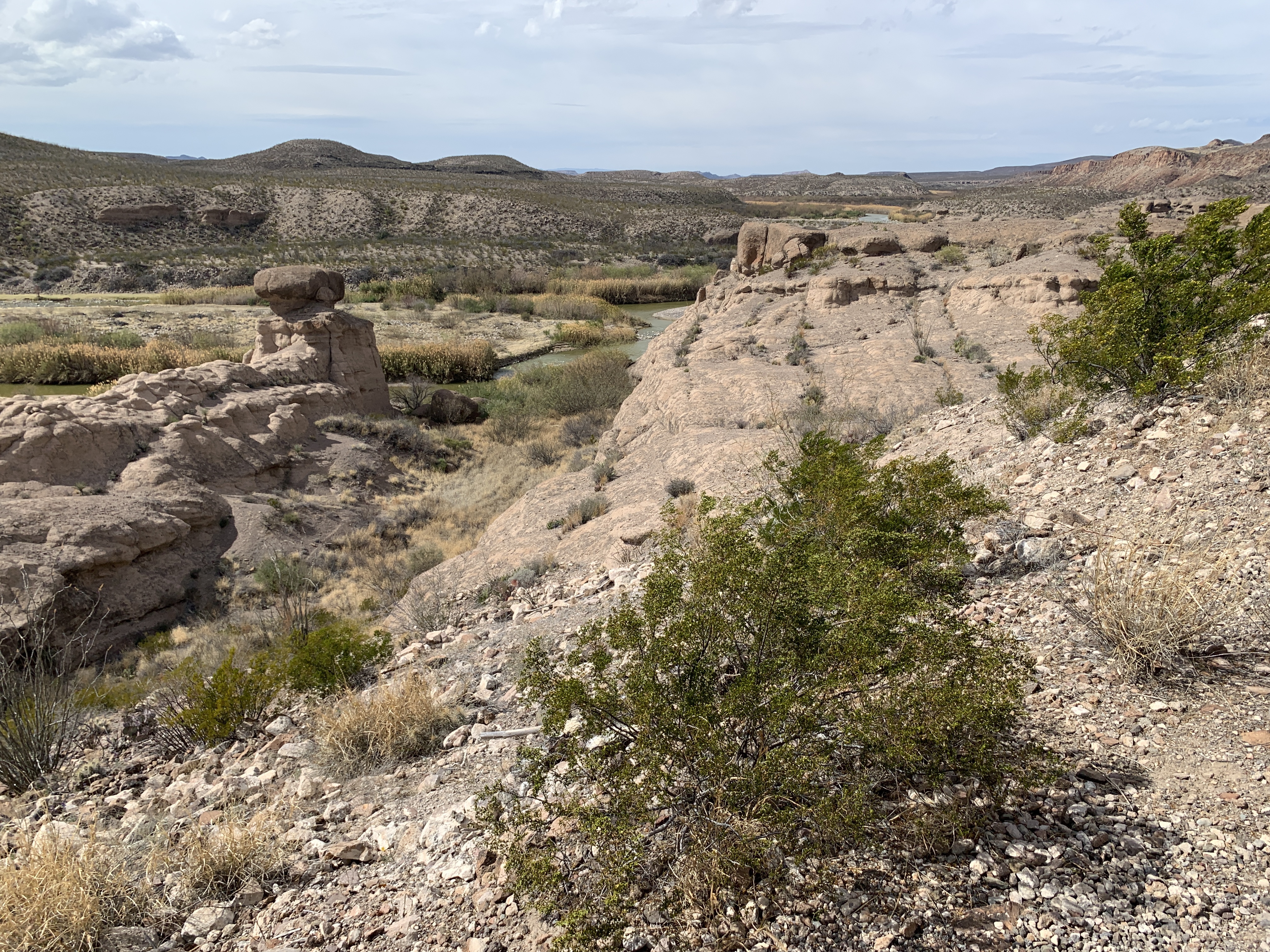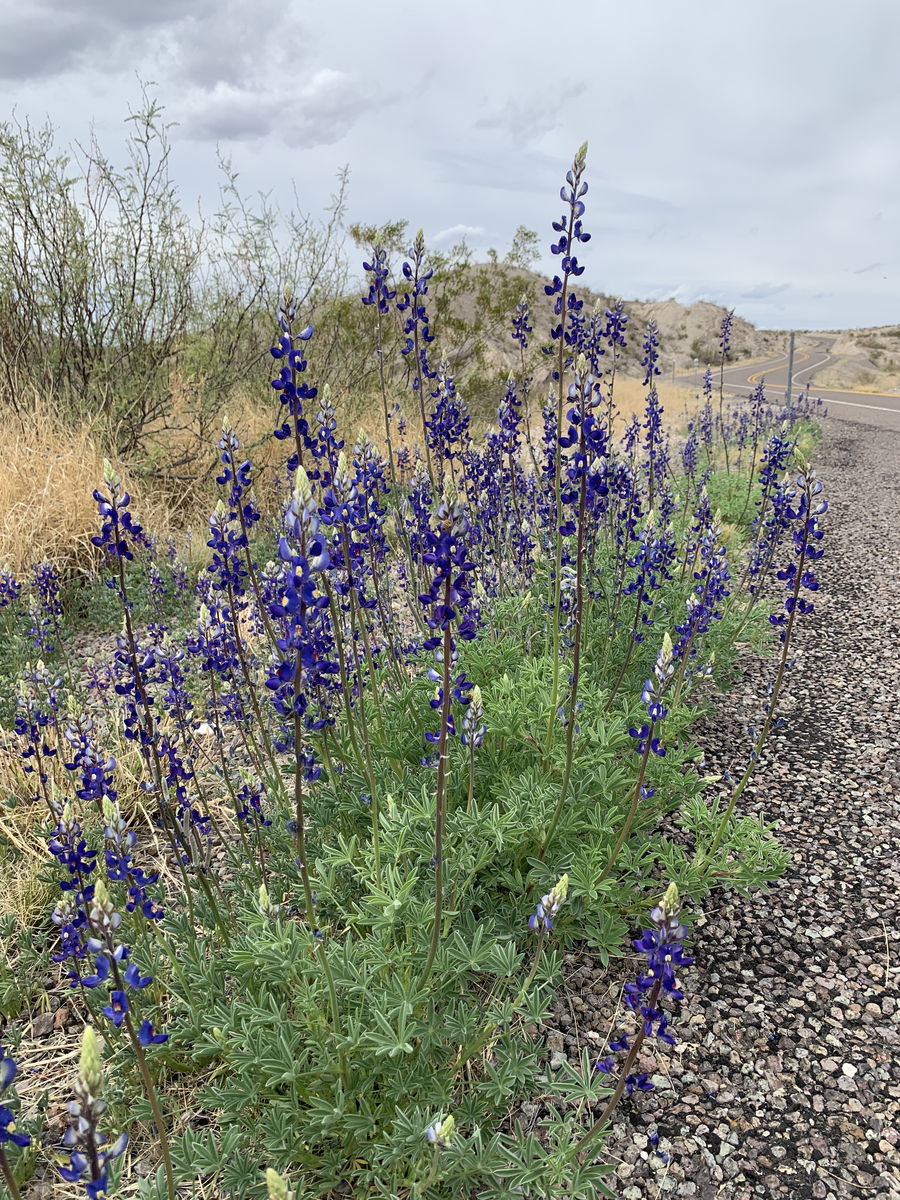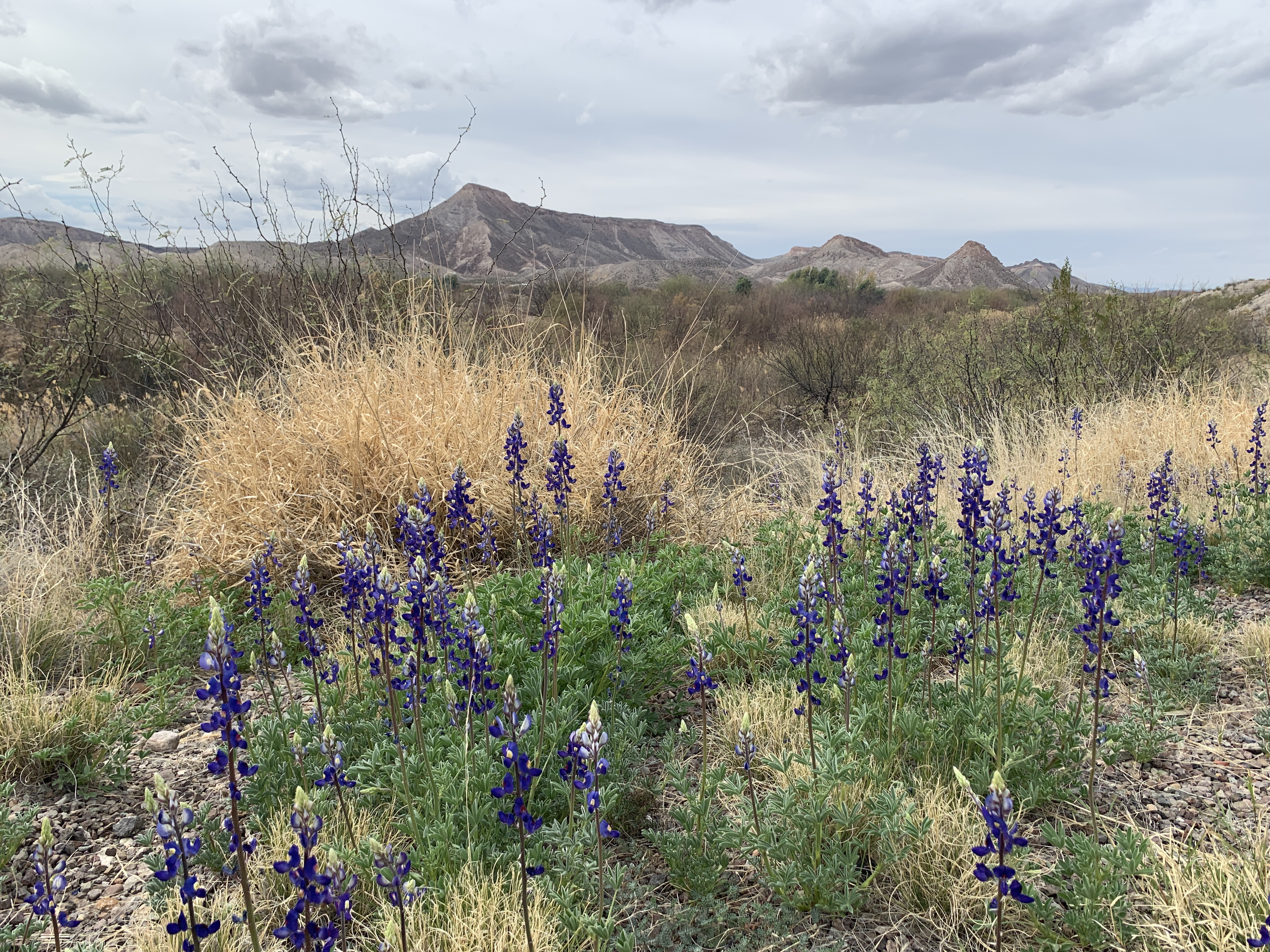 Vanaf Marfa gaan we Highway 67 op. Het is een erg mooie route. We passeren het plaatsje Shafter en zetten later op de Highway 67 de daling in naar het plaatsje Presidio. Dit ligt aan de Mexicaanse grens. We zijn daar om 13.00 uur. Bij een supermarkt met tankstation, tanken we de auto vol. Dan zetten we om 13.45 uur de weg in richting Lajitas. Het duurt niet lang en we zien de rivier de Rio Grande liggen. We stoppen en maken foto’s. Aan de overkant van de rivier ligt Mexico. Langs de weg zien we veel blauwe bloemen.