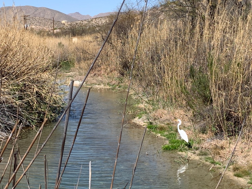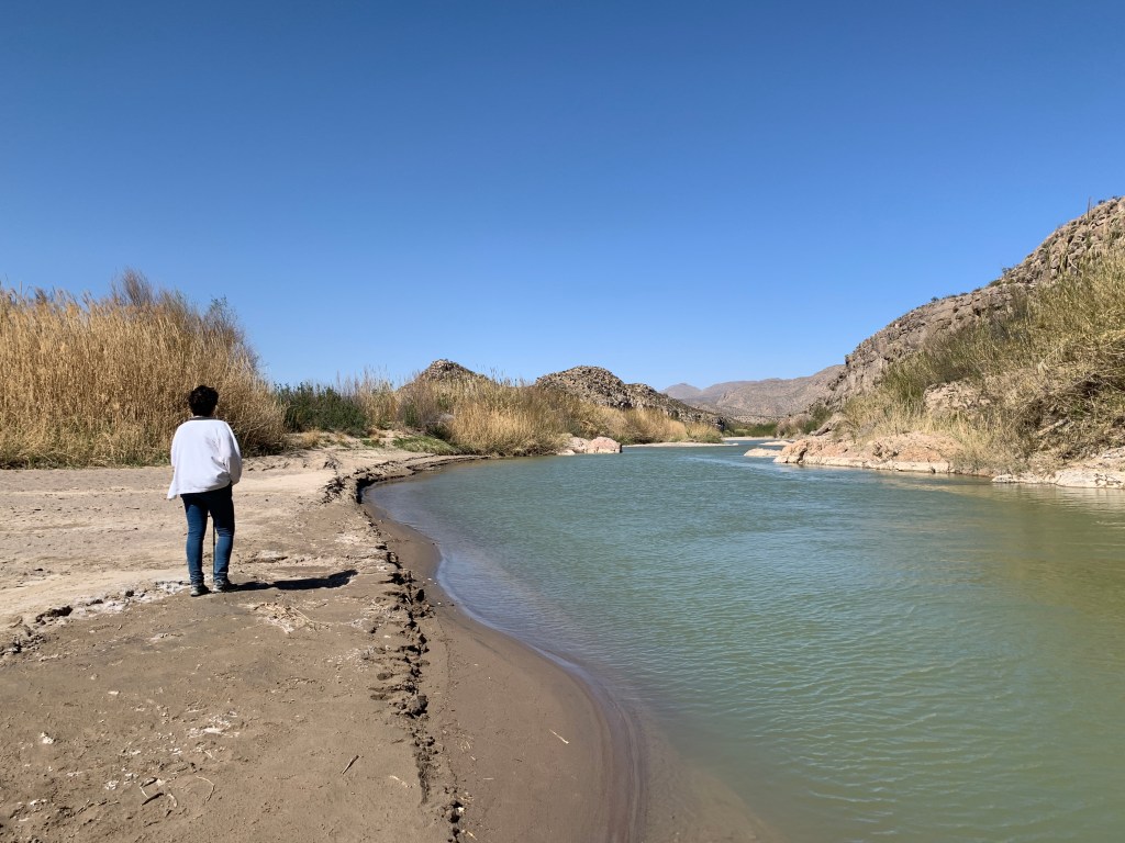 We lopen de trail terug en gaan de spurtrail in. Een pad loopt naar de oever van de Rio Grande. We rusten uit aan de rivier.