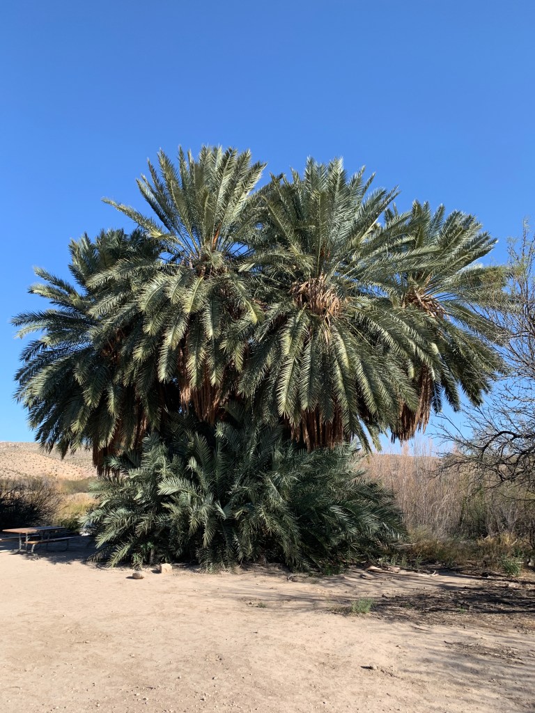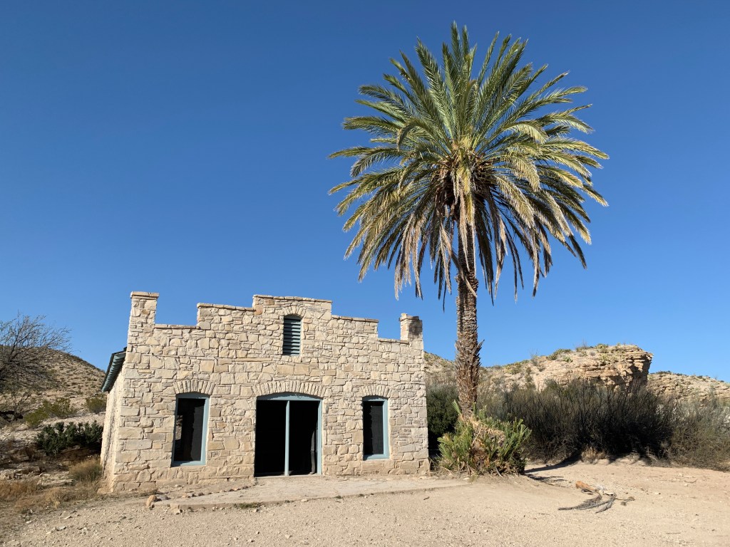 We gaan verder richting Chisos Basin. We rijden dus weer richting onze lodge. We slaan nog 1 keer af en vervolgen de gravelroad, de Hot Spring Road. Een slechte weg en op het eind heel smal. Hij is 2 mile lang. We rijden door een nauwe canyon naar het punt waar de Tornillo Creek en de Rio Grande bij elkaar komen. Aan de creek (riviertje) liggen diverse warmwaterbronnen (hot Springs). Vroeger in 1909 runde hier iemand nog een badhuis. Er staan mooie, vervallen gebouwen die aan die tijd herinneren. Zoals een oude winkel met een prachtige palmboom erbij.