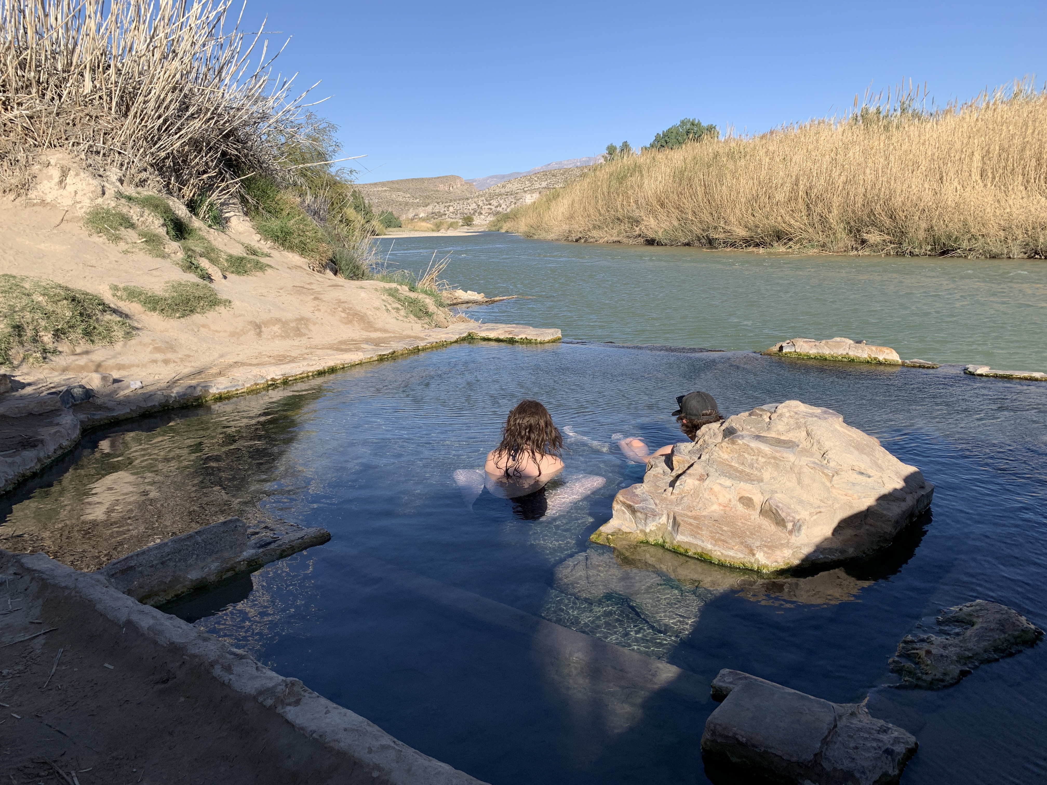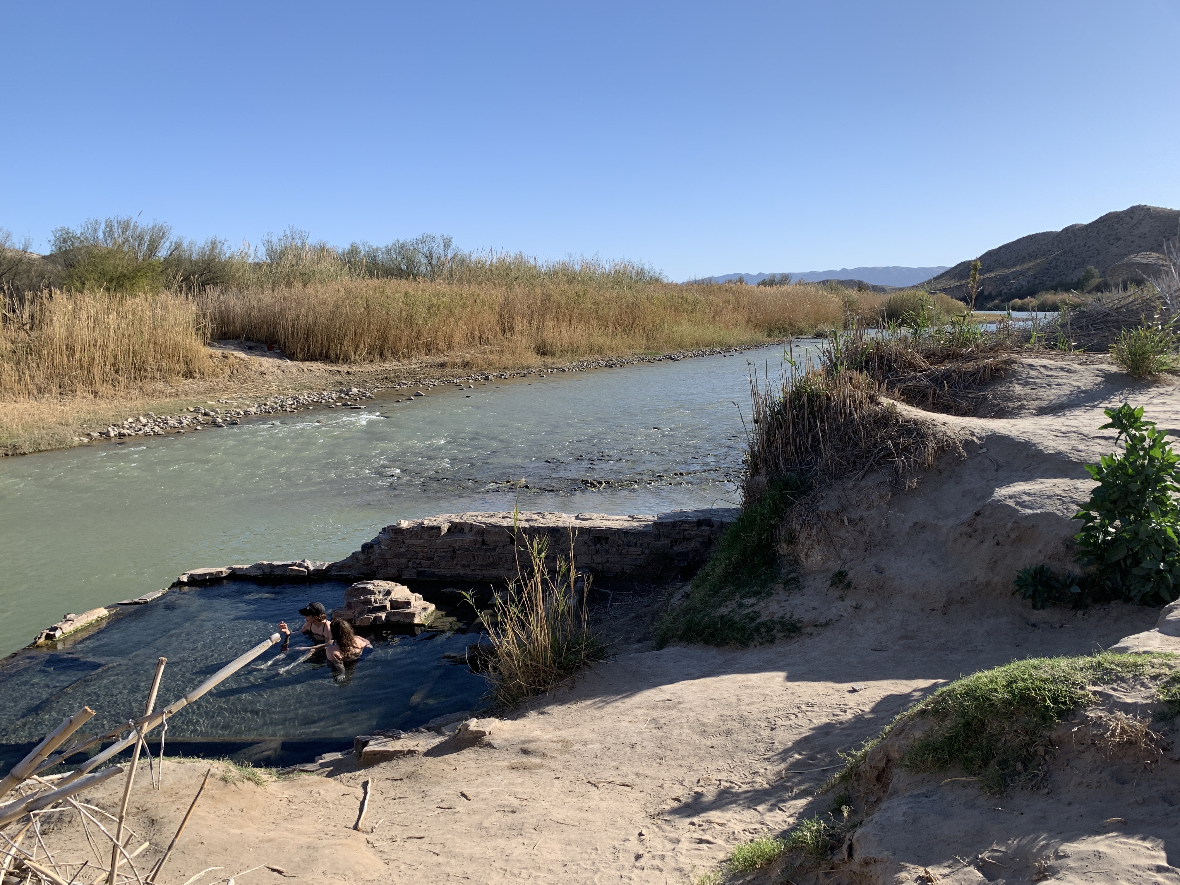 Een pad voert naar een Hot Spring die aan de Rio Grande ligt. Die gaan we lopen. Even later komen we bij de Hot Spring aan. Twee dames staan voor ons model in de Hot Spring. Het water is ca. 37 graden.