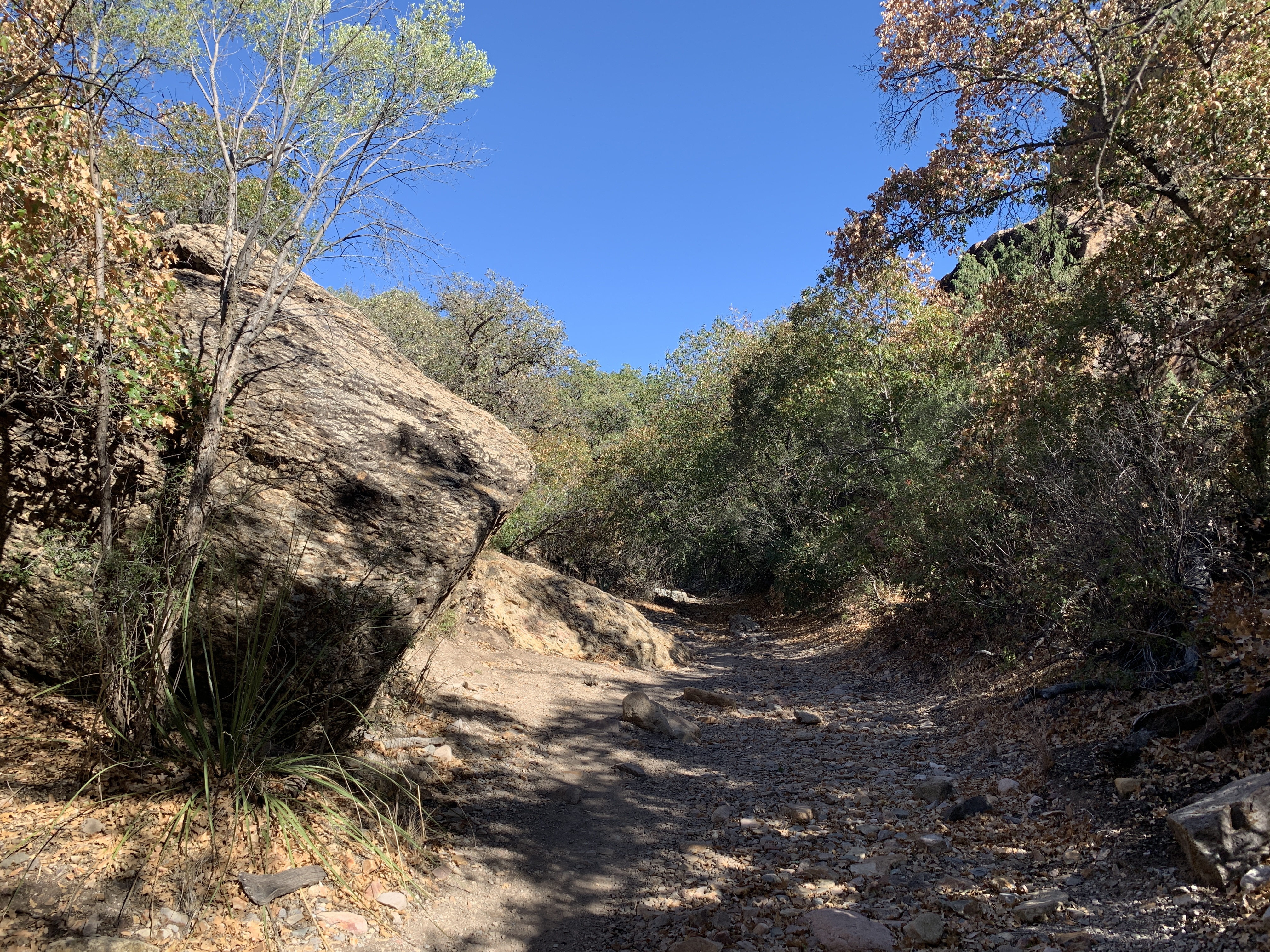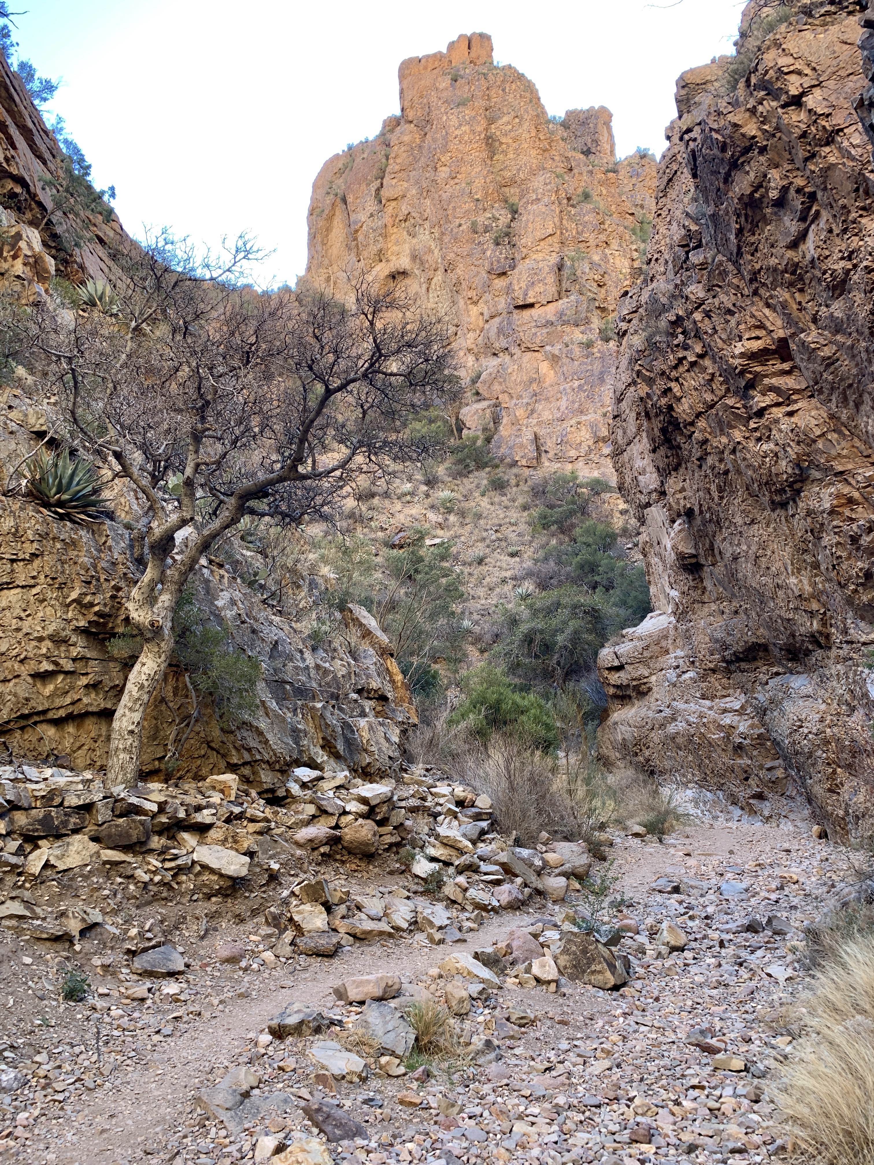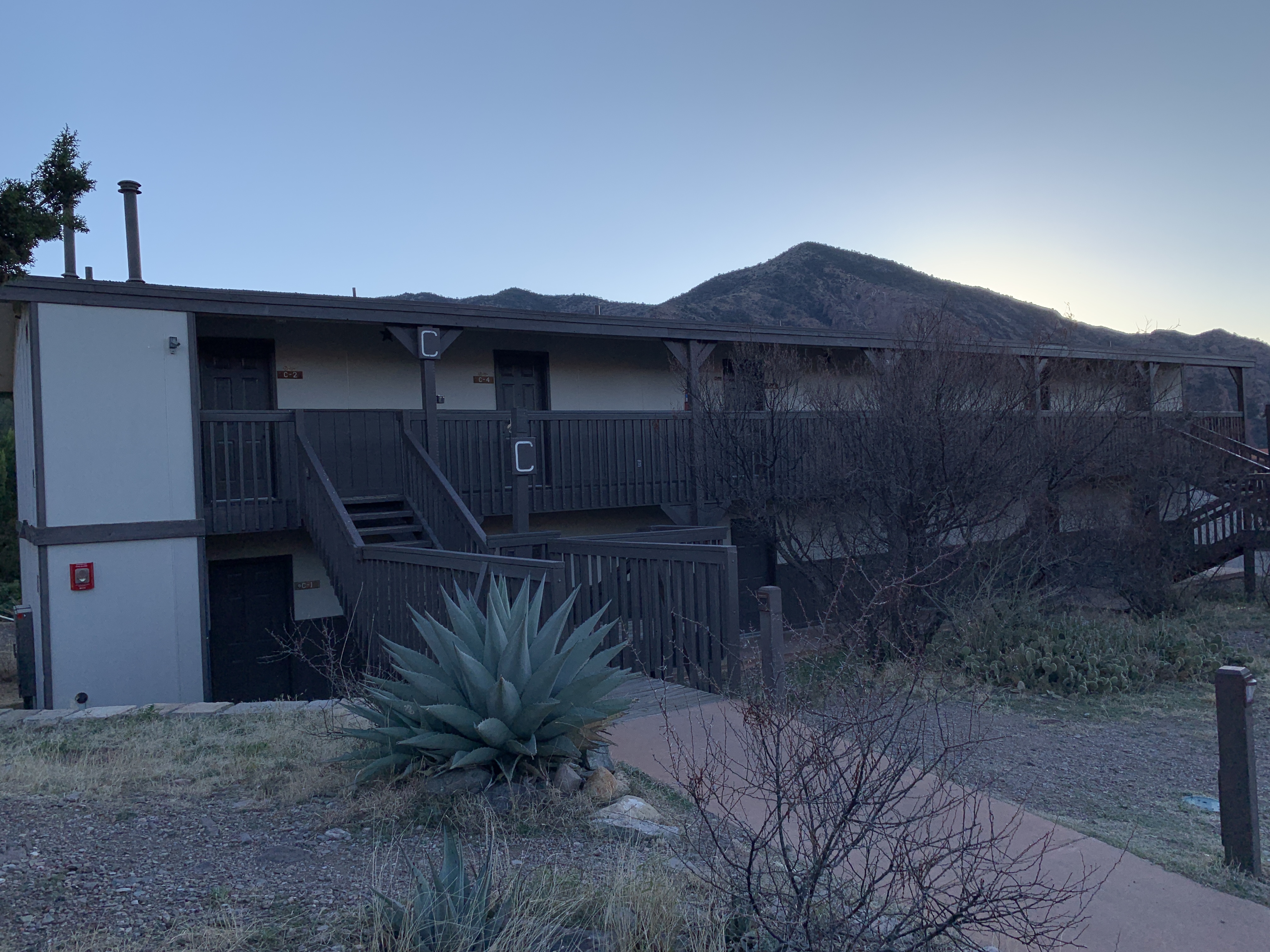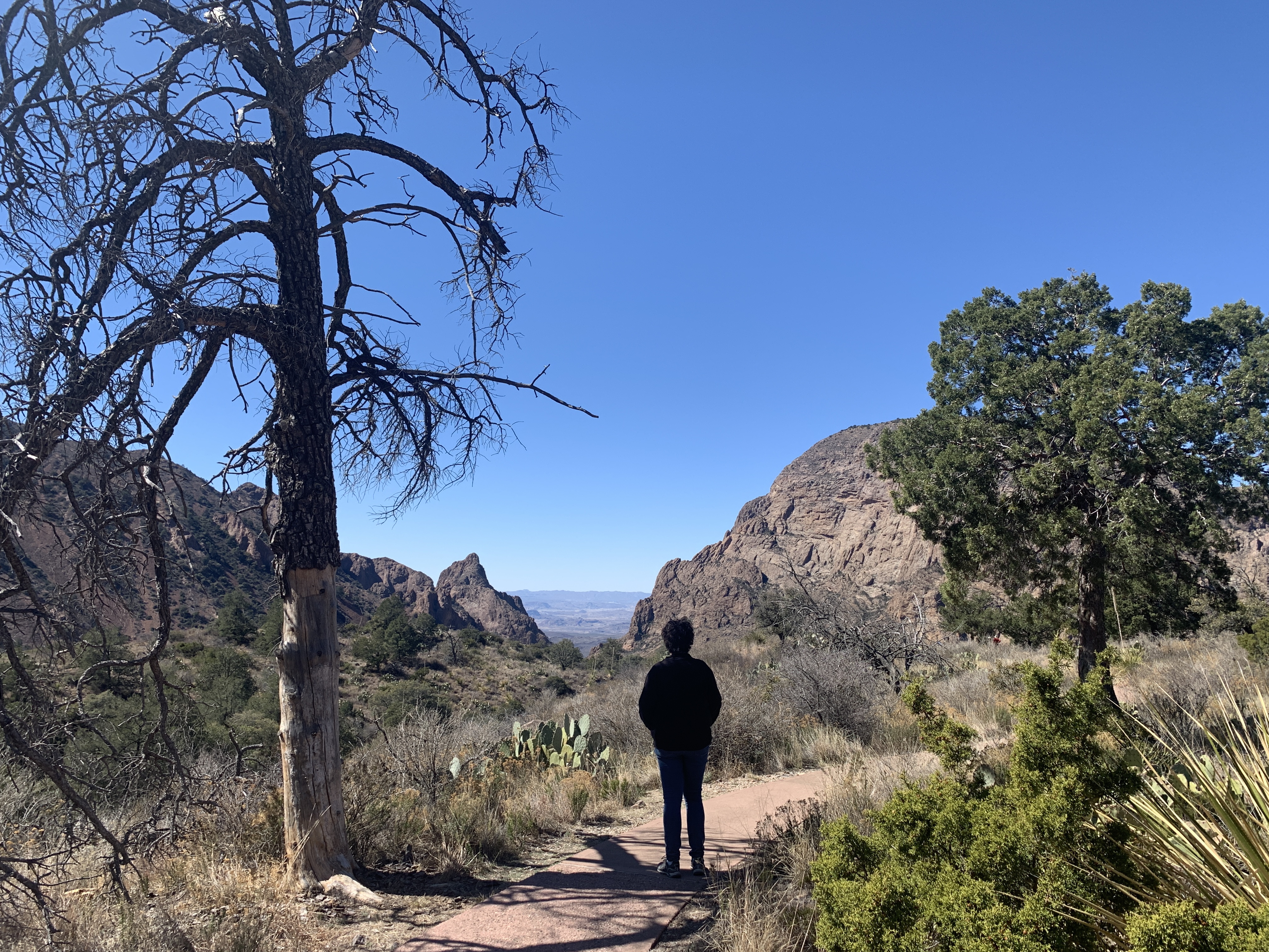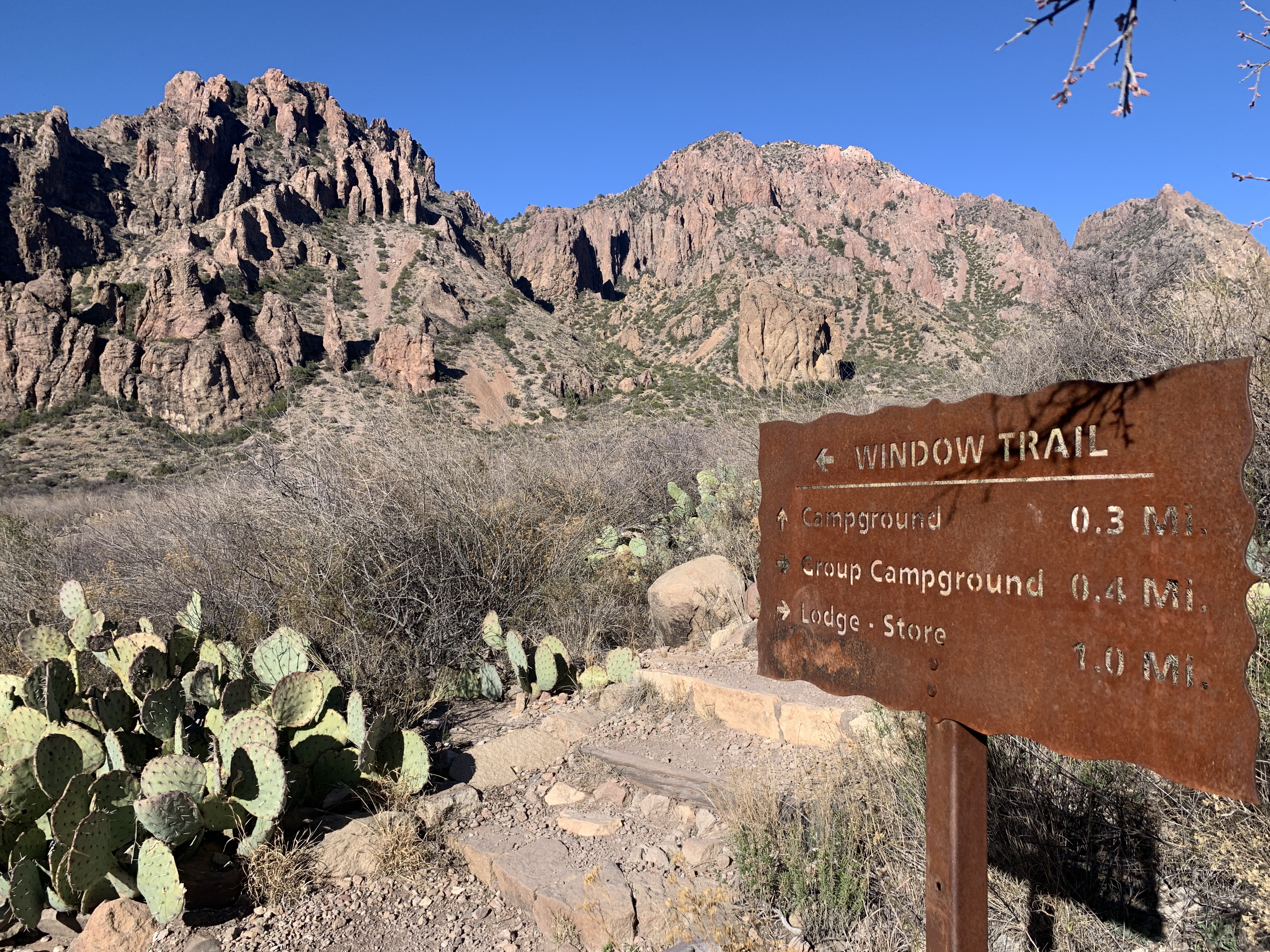We gaan na de wandeling naar onze lodge. Ingrid blijft in de lodge en Harry gaat nog de Window trail doen. Deze trail is heen en terug, 9.4 km. De wandeling daalt helemaal af het dal in. Daar loop je door begroeiing, een stuk bos met uitzichten op de hoge bergtoppen van Chisos Basin.