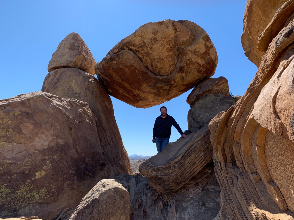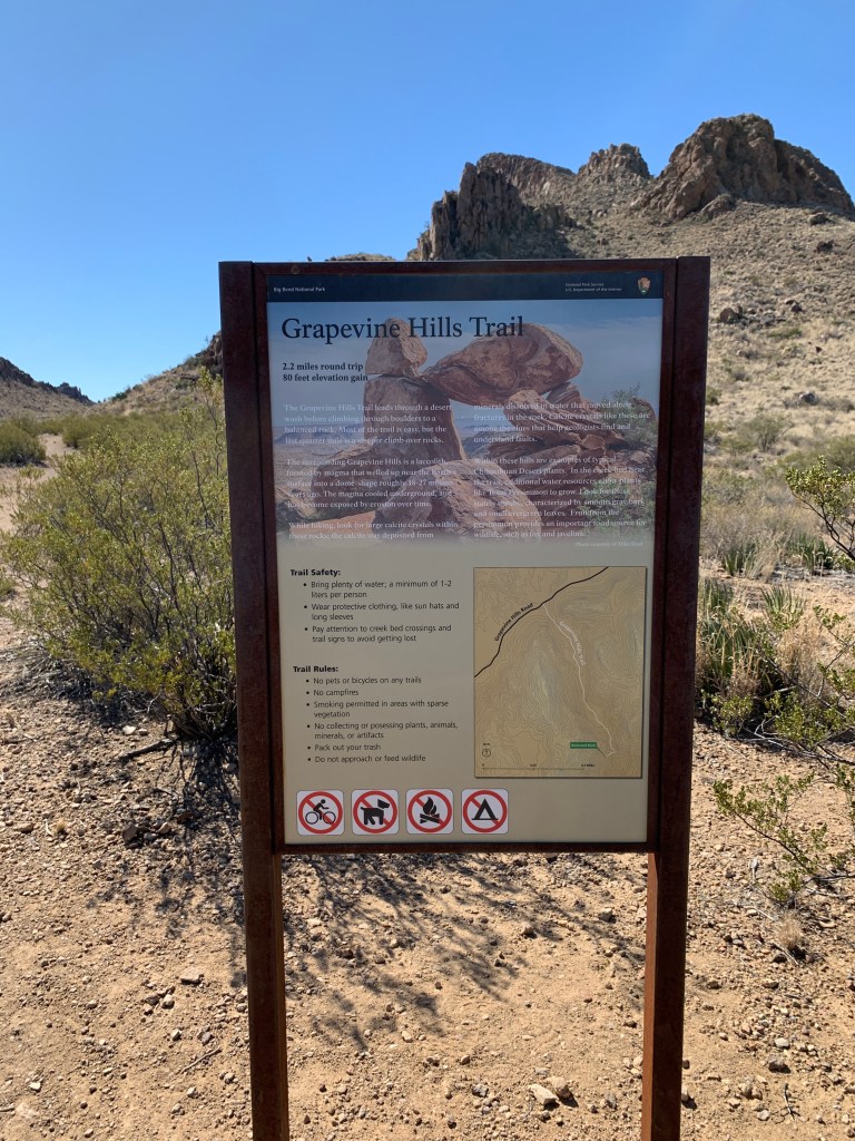 Rond 10.15 uur gaan we een stukje rijden. We rijden de Chisos Basin road uit en slaan linksaf de weg in richting Lajitas. Even verder gaan we al rechts de Grapevine Hills Road in. Dit is een witte gravel/stenen weg die 12.4 km lang is en naar de parkeerplaats van de Grapevine Hills Trail loopt. In het begin rijdt de weg nog aardig, maar de laatste km’s is het hobbel de bobbel. Onderweg tijdens de 30 minuten die we over de weg rijden schiet er op eens een coyote de weg over. Mooi om te zien. Als we er zijn parkeren we de auto op de parkeerplaats. Deze is bijna vol. De trail is 3.2 km. Heen en terug. Op het einde moet je flink klimmen om bij de zogenaamde Balanced Rock te komen. Hoe dat gaat zien we later.
