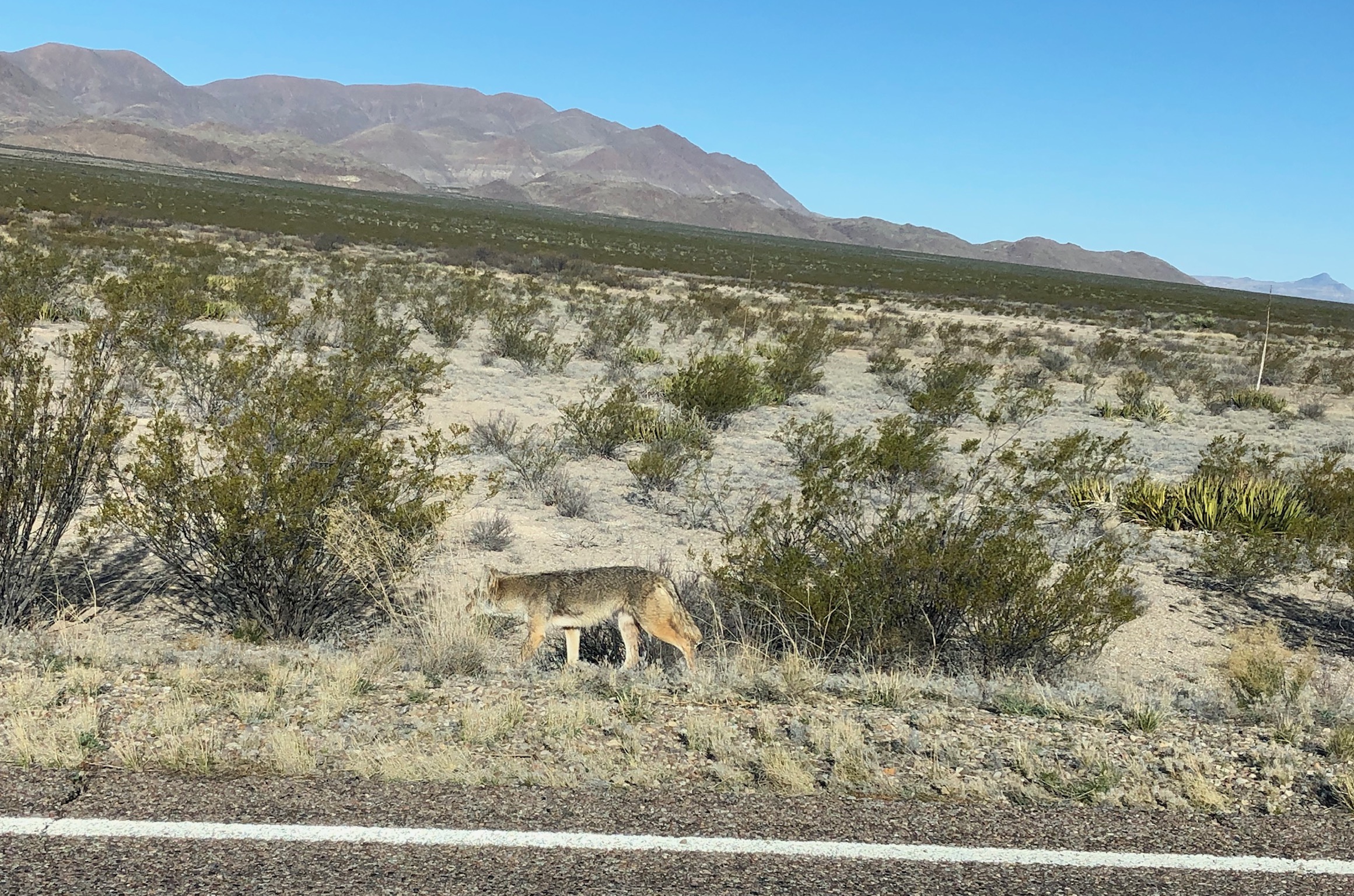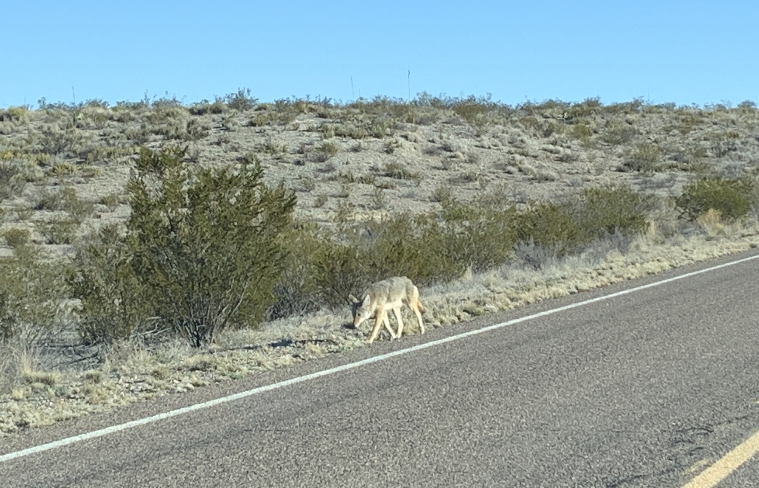 We rijden via de 385 weg rond half 10 het park uit en gaan naar het plaatsje Marathon. Onderweg loopt er nog een coyote langs de weg. We zetten de auto stil. Heel rustig loopt hij langs de auto.