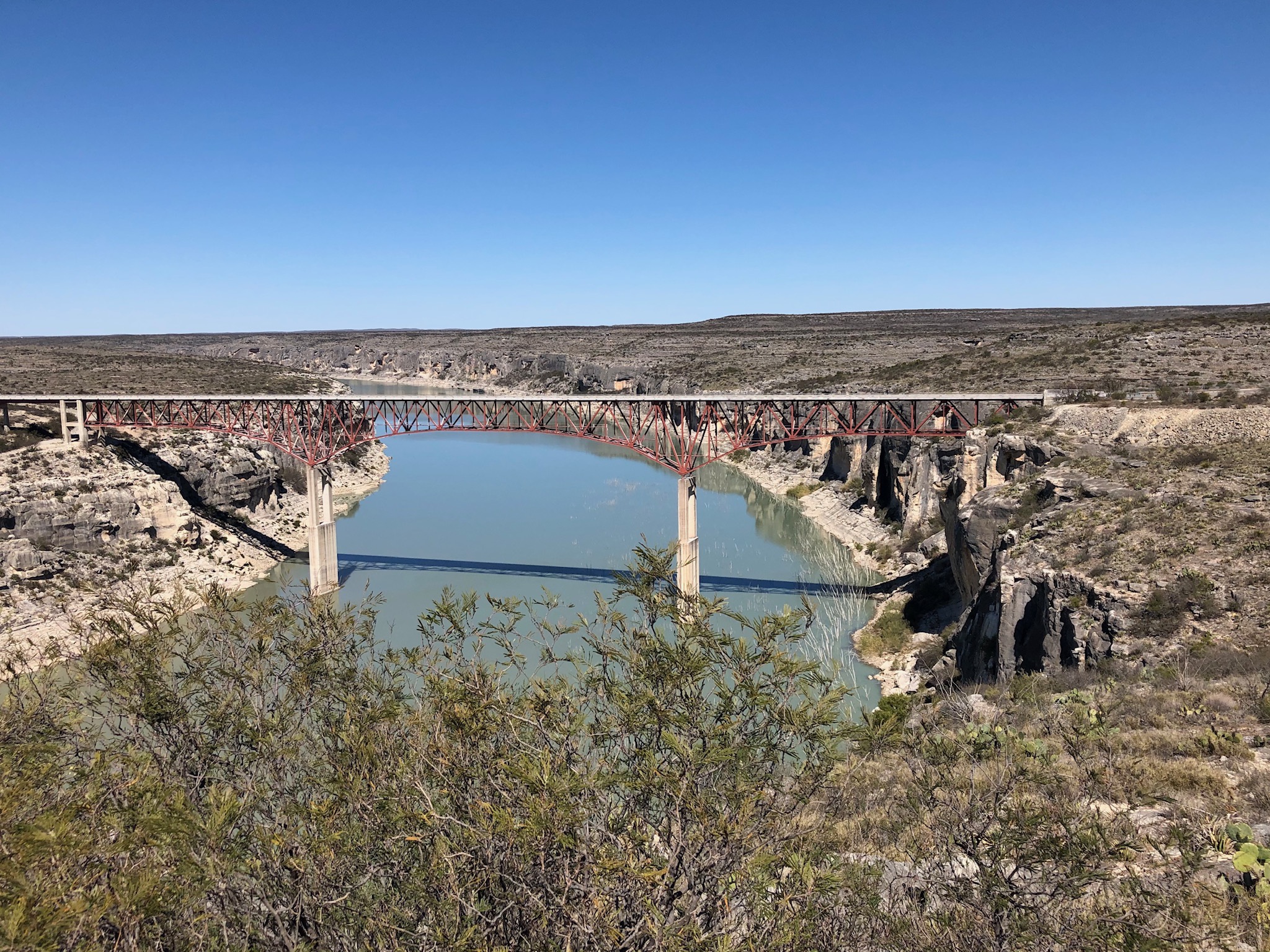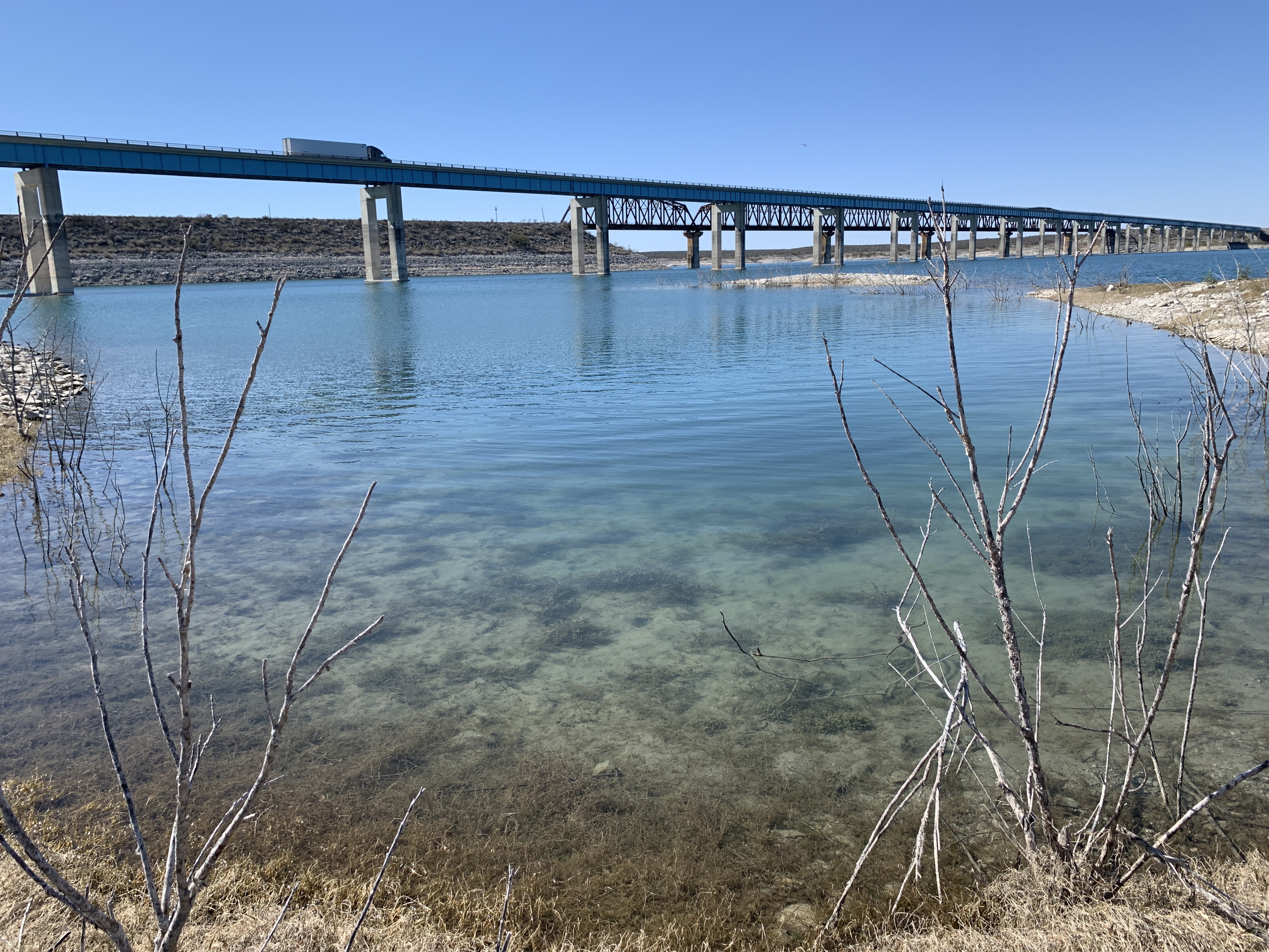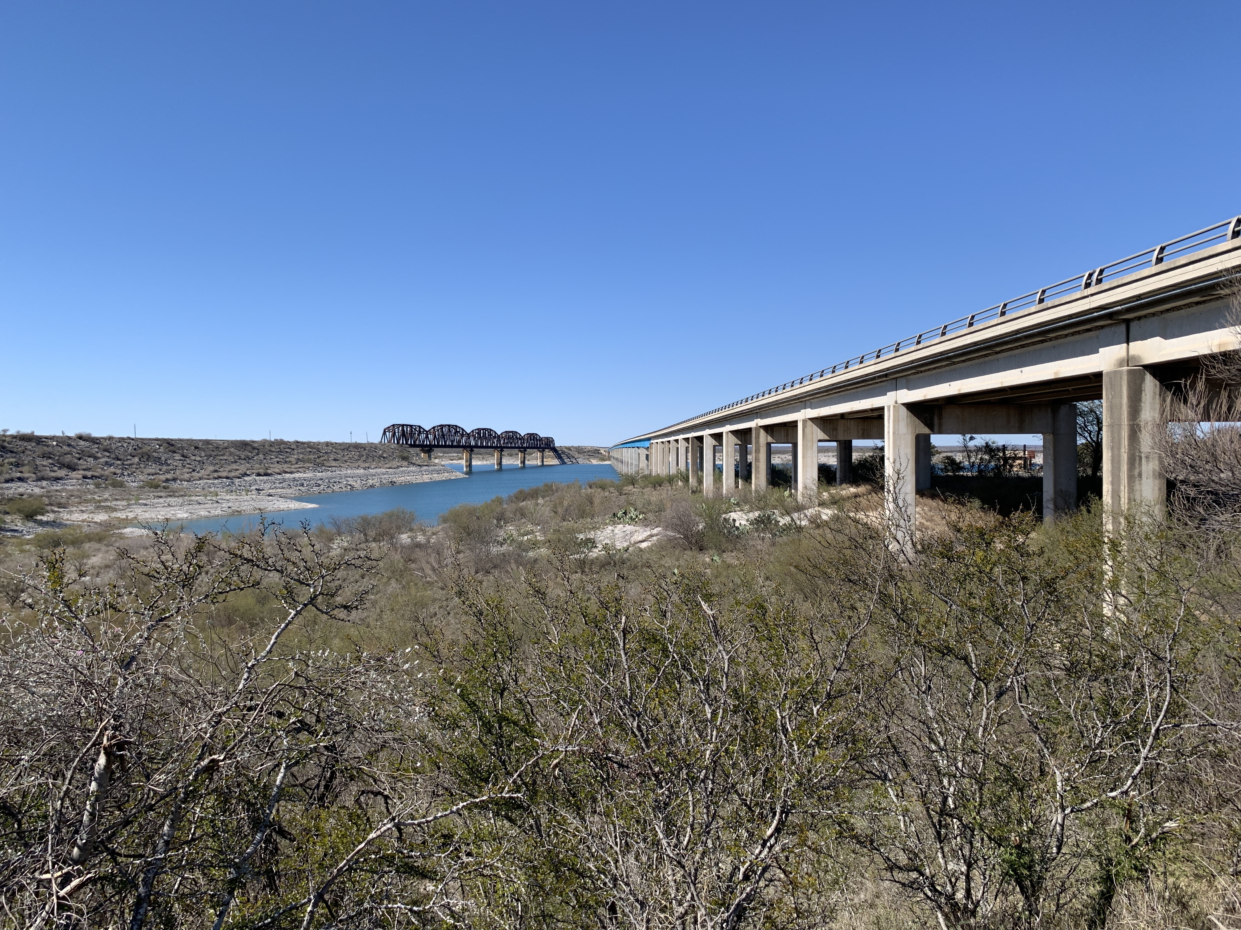 Verderop rijden we een grote brug over. Deze gaat over Lake Amistad. Er zijn 2 bruggen, 1 autobrug en 1 spoorbrug. We slaan de weg naar Lake Amistad Governors Landing in en rijden onder de autobrug door. Bij de picknickplaats heb je een mooi overzicht op de bruggen en het meer.