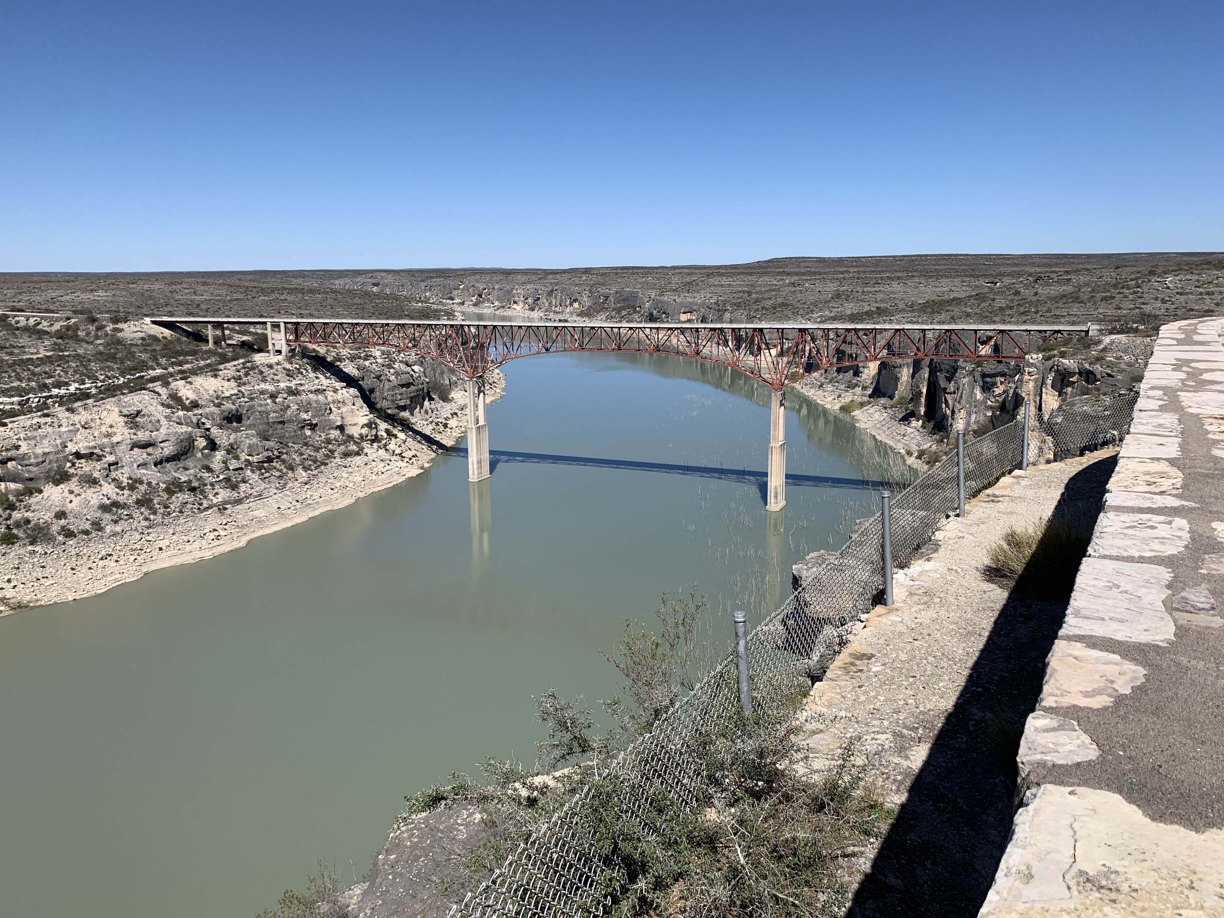We rijden de brug over de Pecos River. Deze loopt door een mooie canyon. We rijden direct na de brug rechtsaf naar een picknickplaats met mooi uitzicht over de stalen brug en de rivier. De brug is 84 meter hoog.