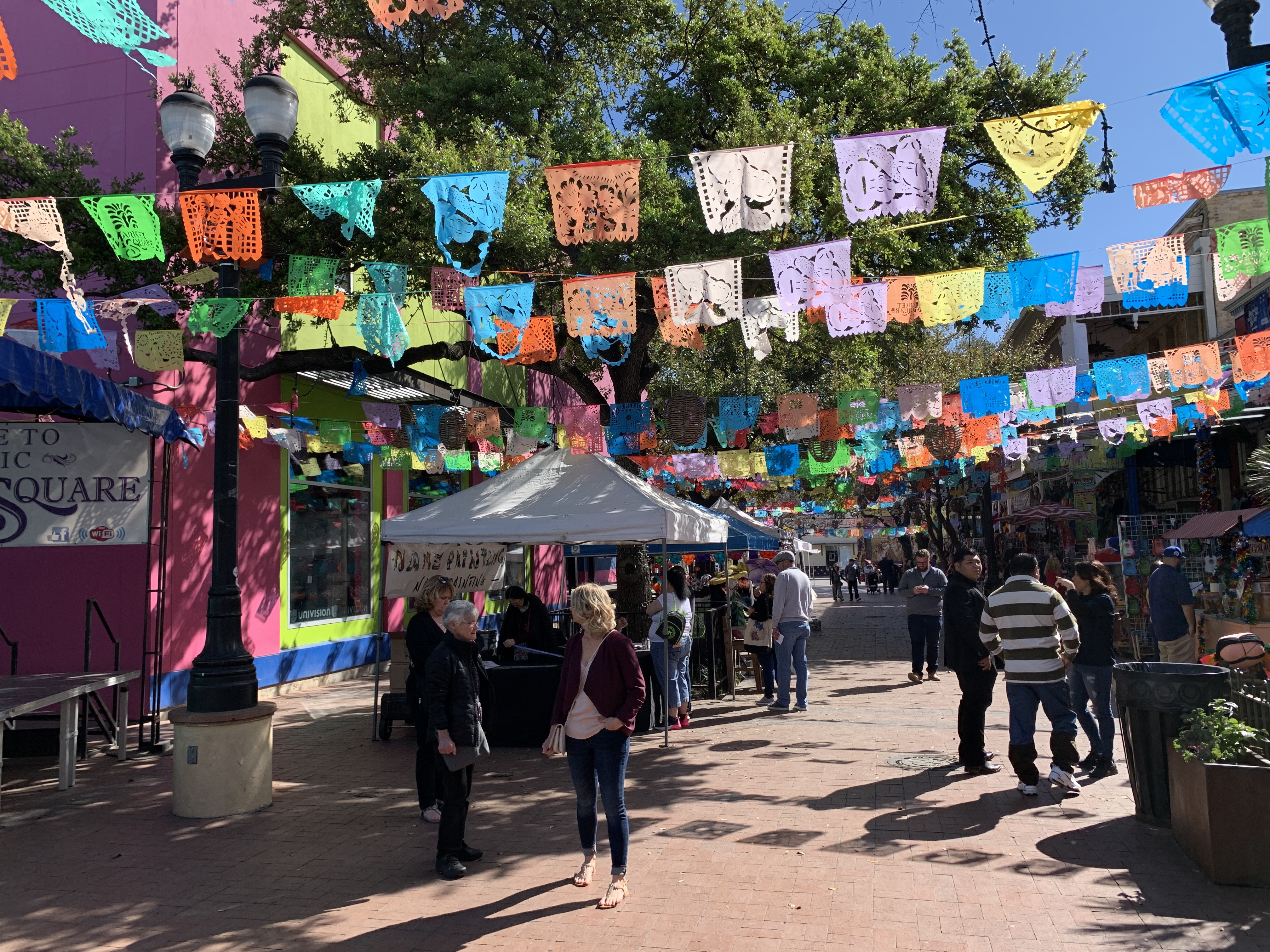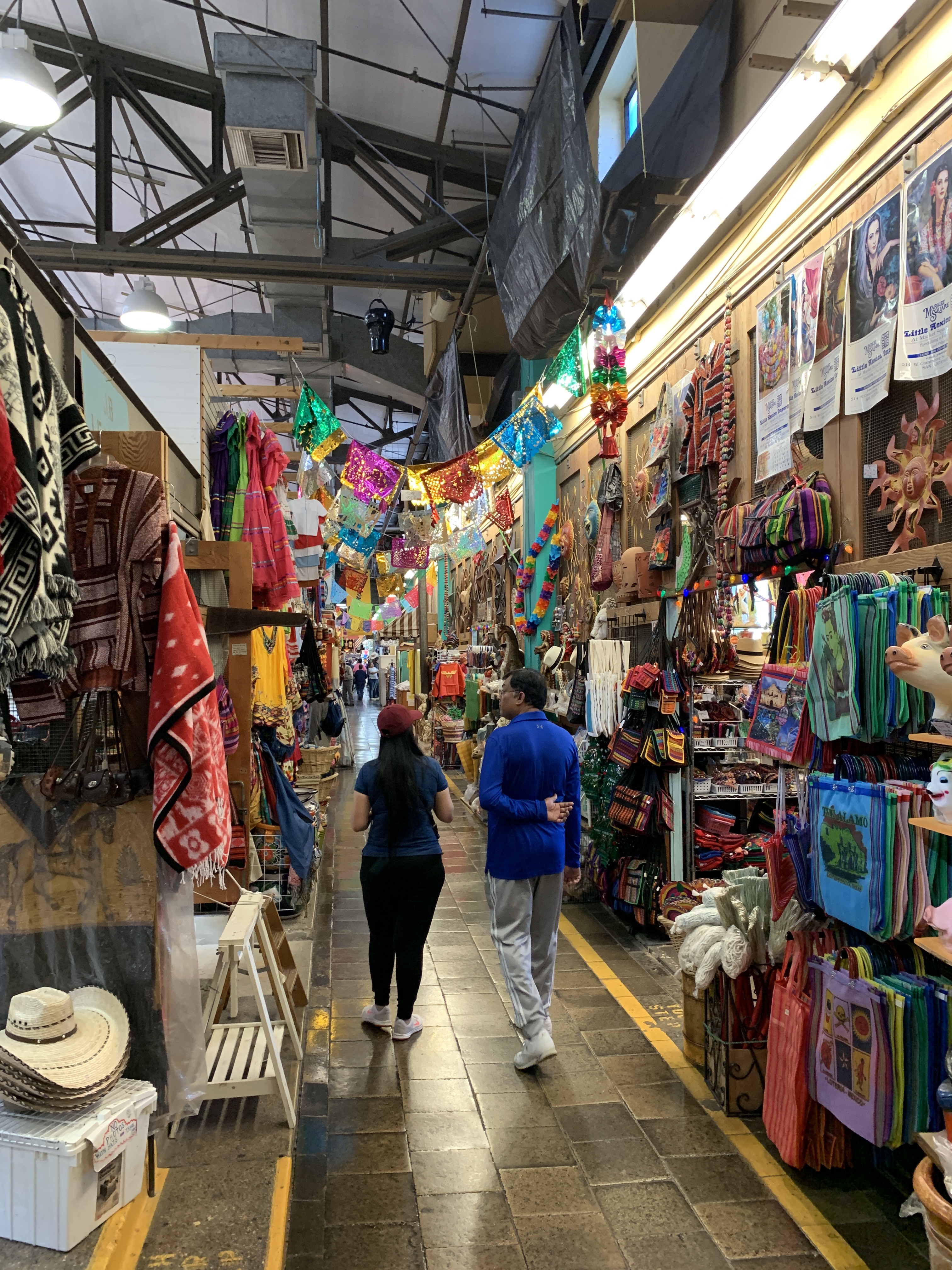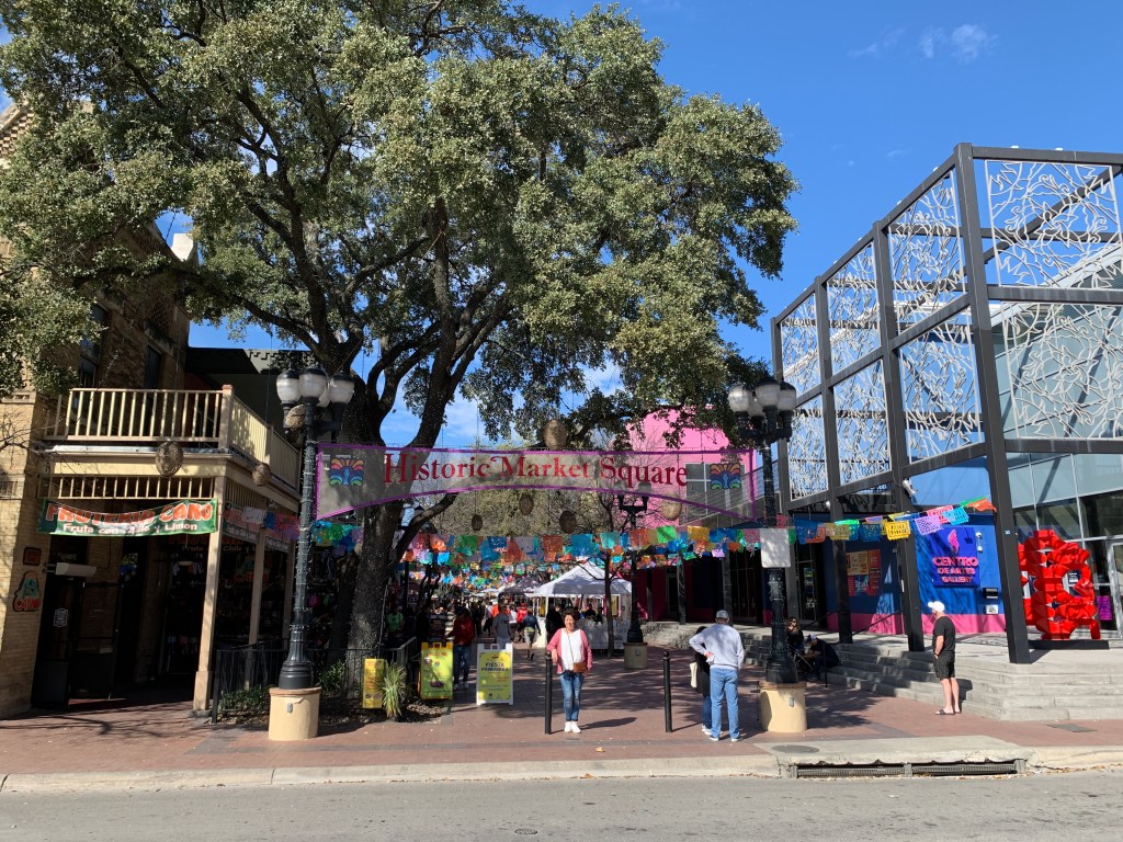 We rijden met de auto naar Market Square, een Mexicaanse marktplein in San Antonio met kleurrijke restaurantjes en winkeltjes.