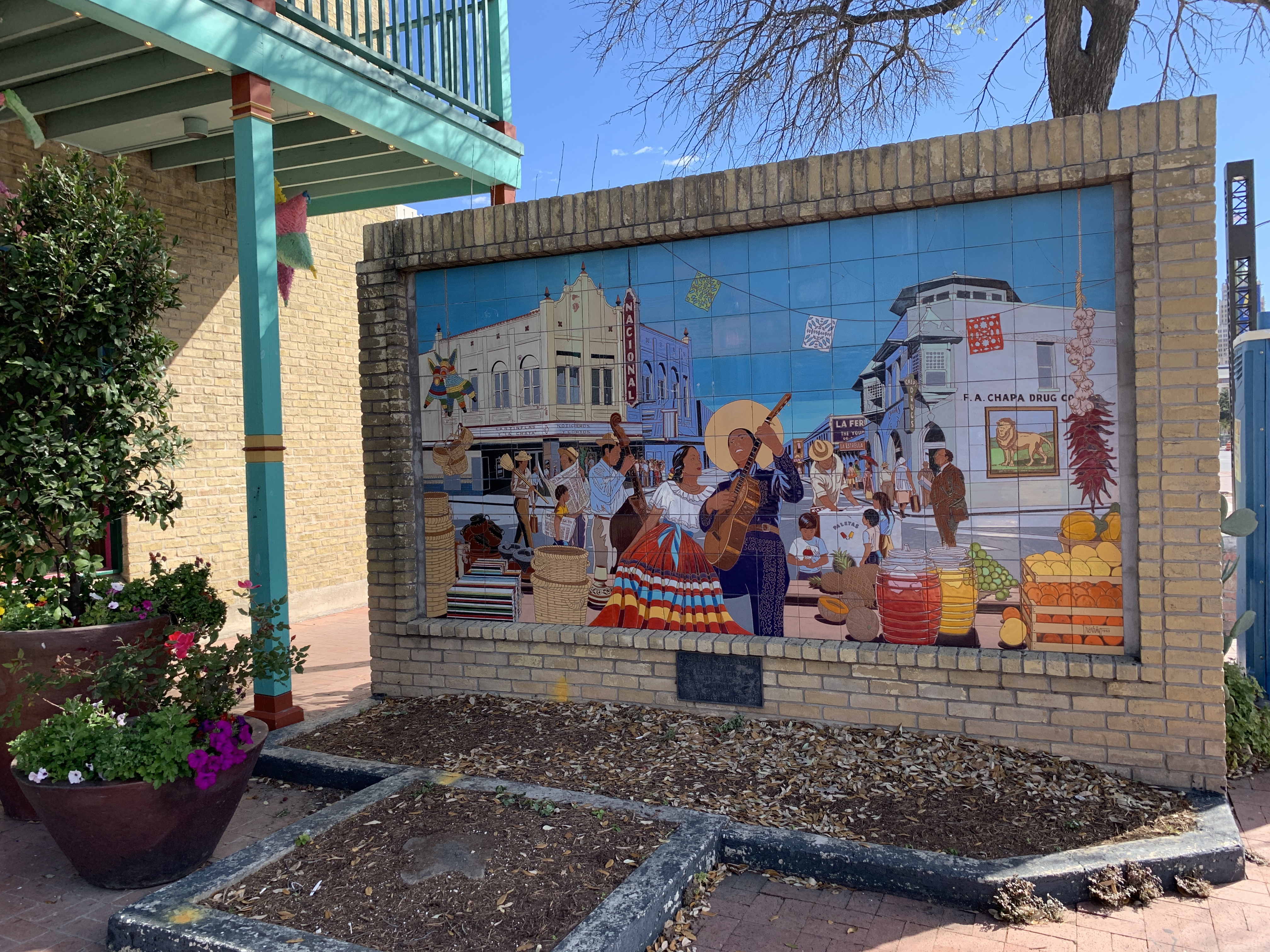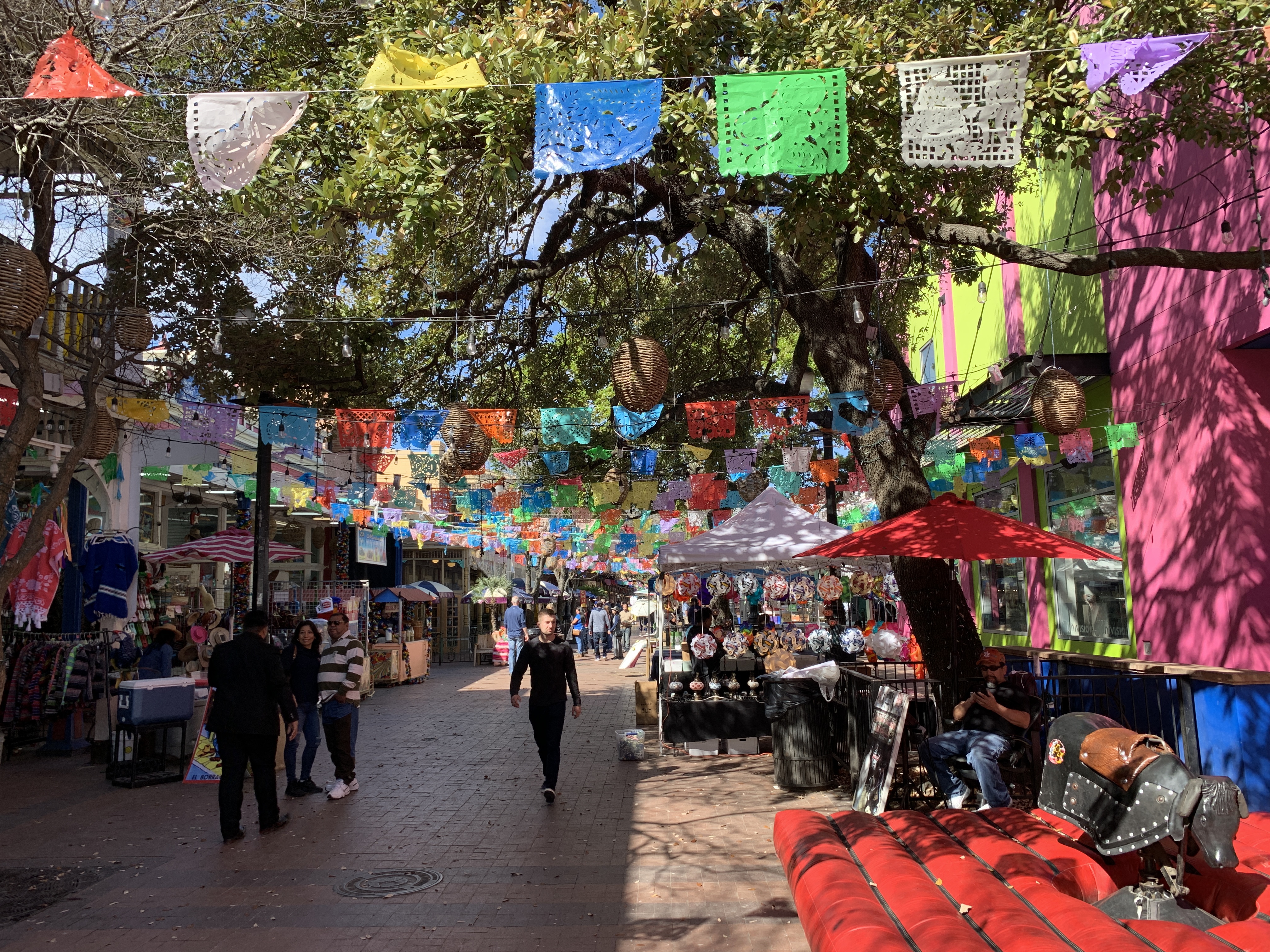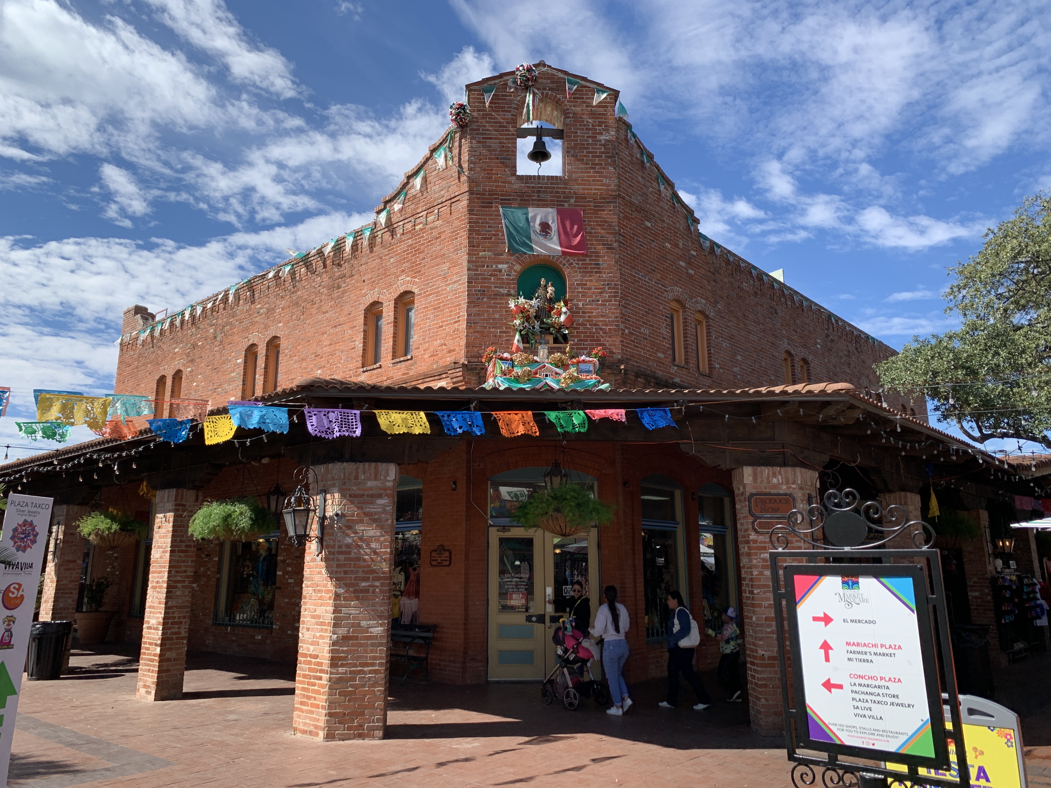 We rijden met de auto naar Market Square, een Mexicaanse marktplein in San Antonio met kleurrijke restaurantjes en winkeltjes.