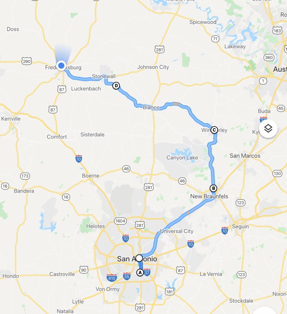 We rijden door Hill Country, een heuvelachtig, bosrijk gebied, met riviertjes en kleine dorpjes. Verder is Hill Country bekend van de wijn en zijn er ook wat perzikboomgaarden. De laatste twee vooral in de buurt van Fredericksburg. Vroeger zaten in dit deel veel Duitse immigranten vandaar de vaak Duitse benamingen van de plaatsjes.