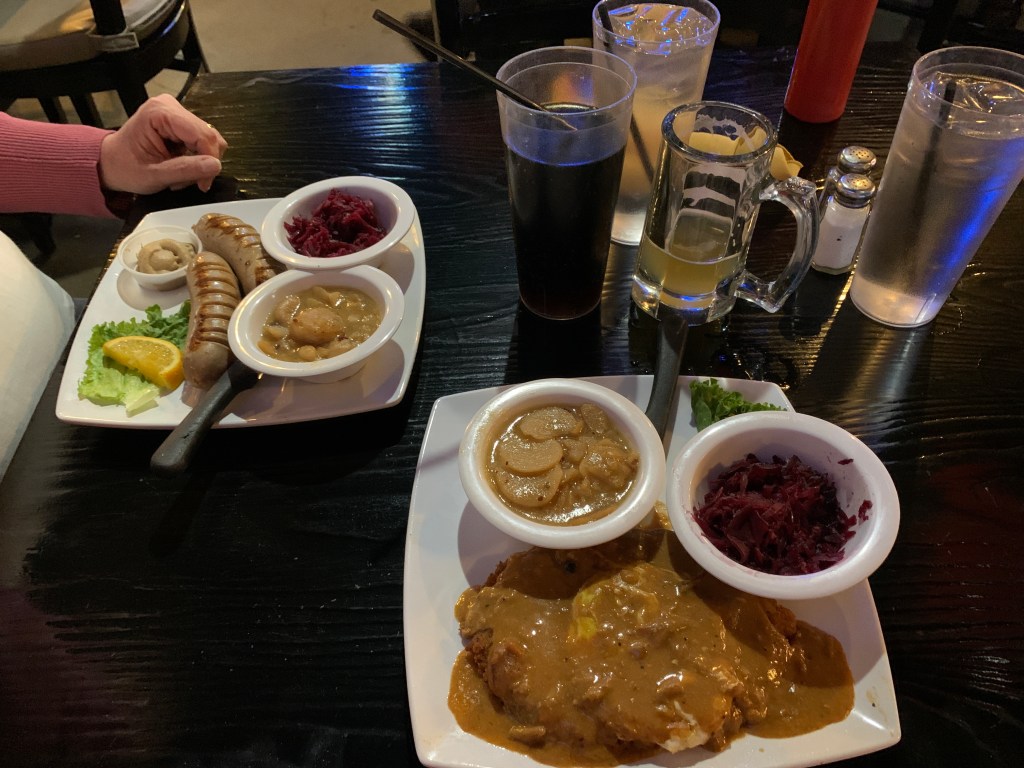 We gaan later eten in het centrum van Fredericksburg. We gaan eten bij Cultures Gril. Op zijn Duits nemen we een Bratwurst en een Schnitzel. Wij prefereren toch liever Amerikaans eten.