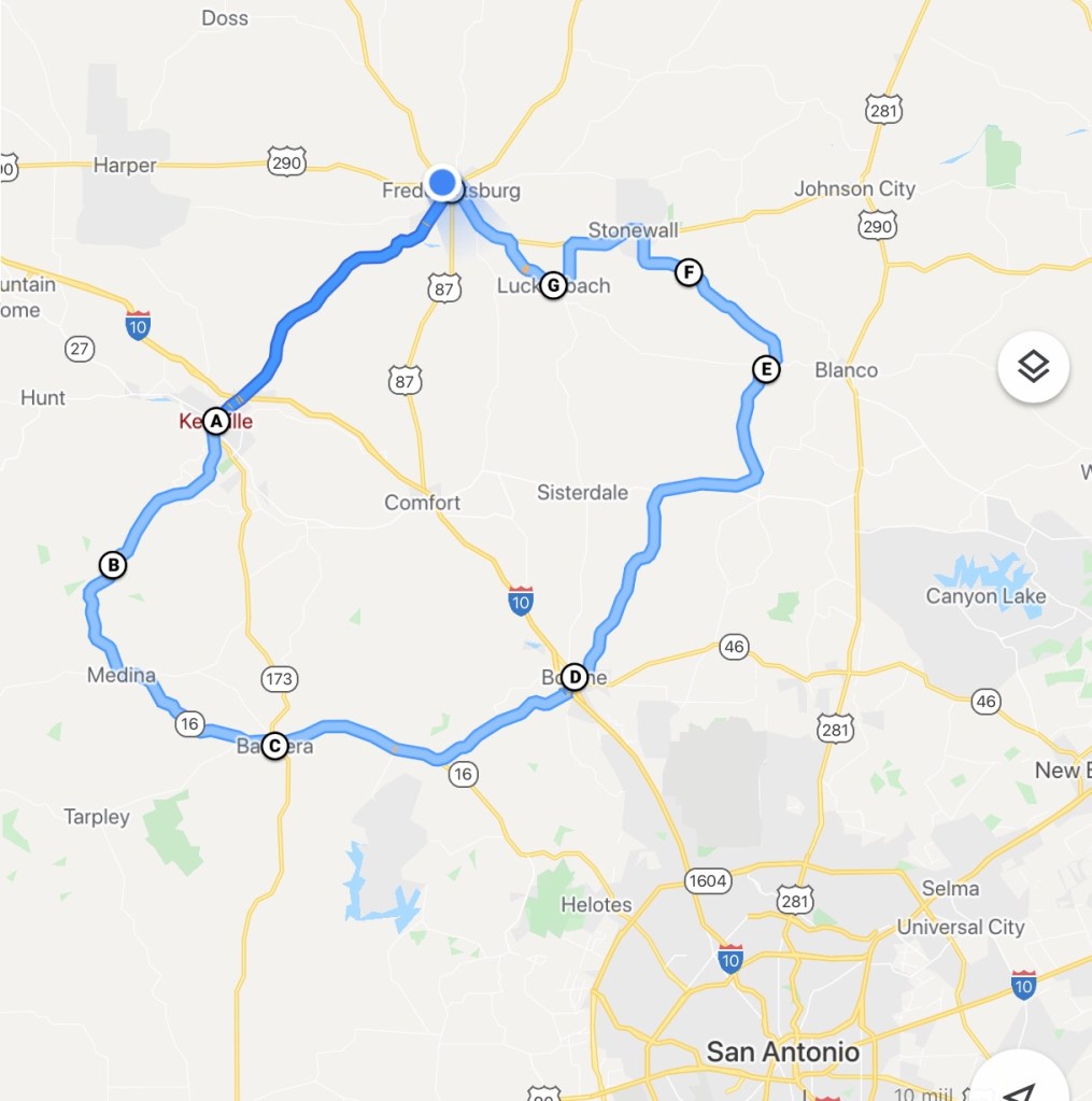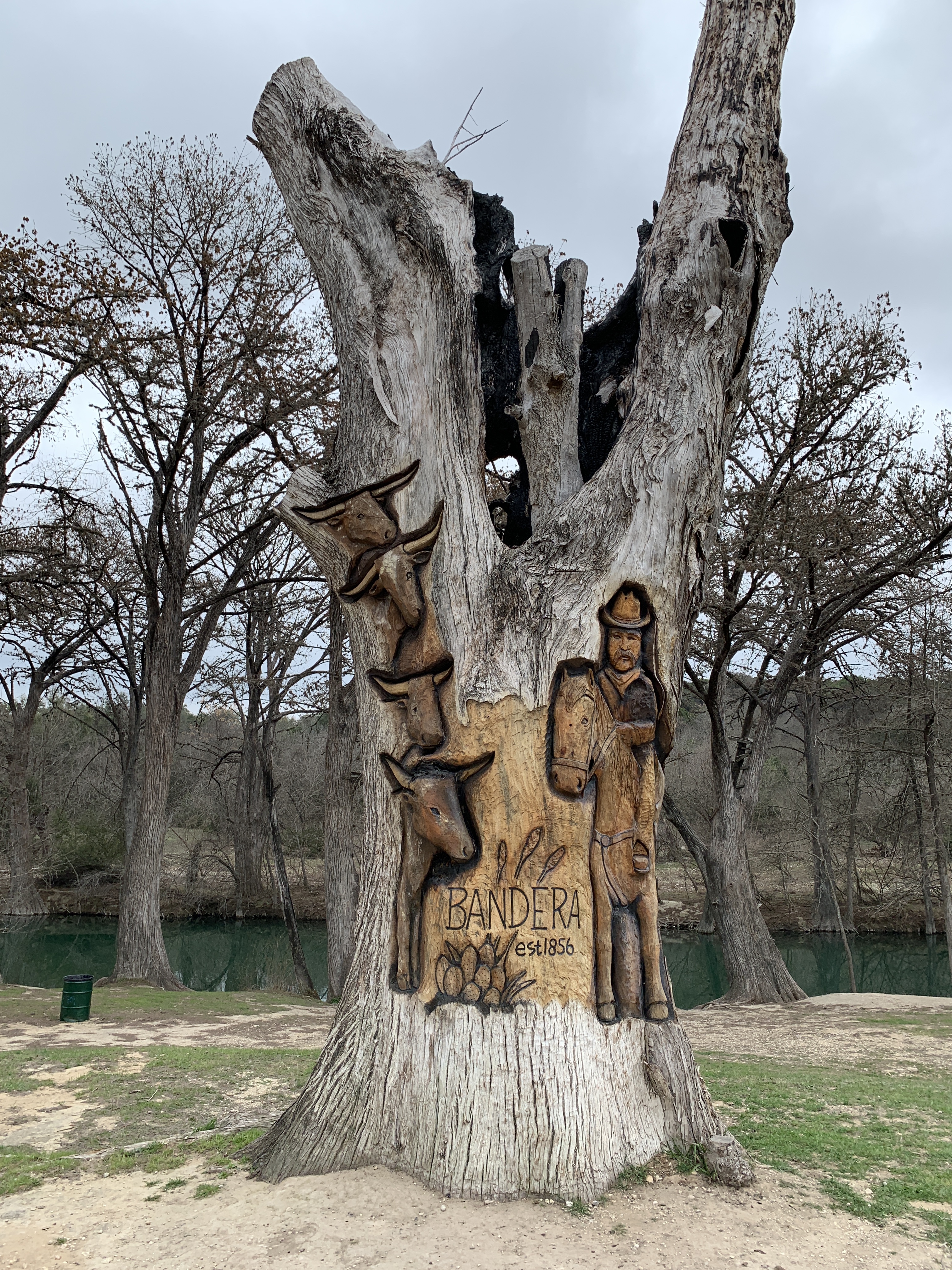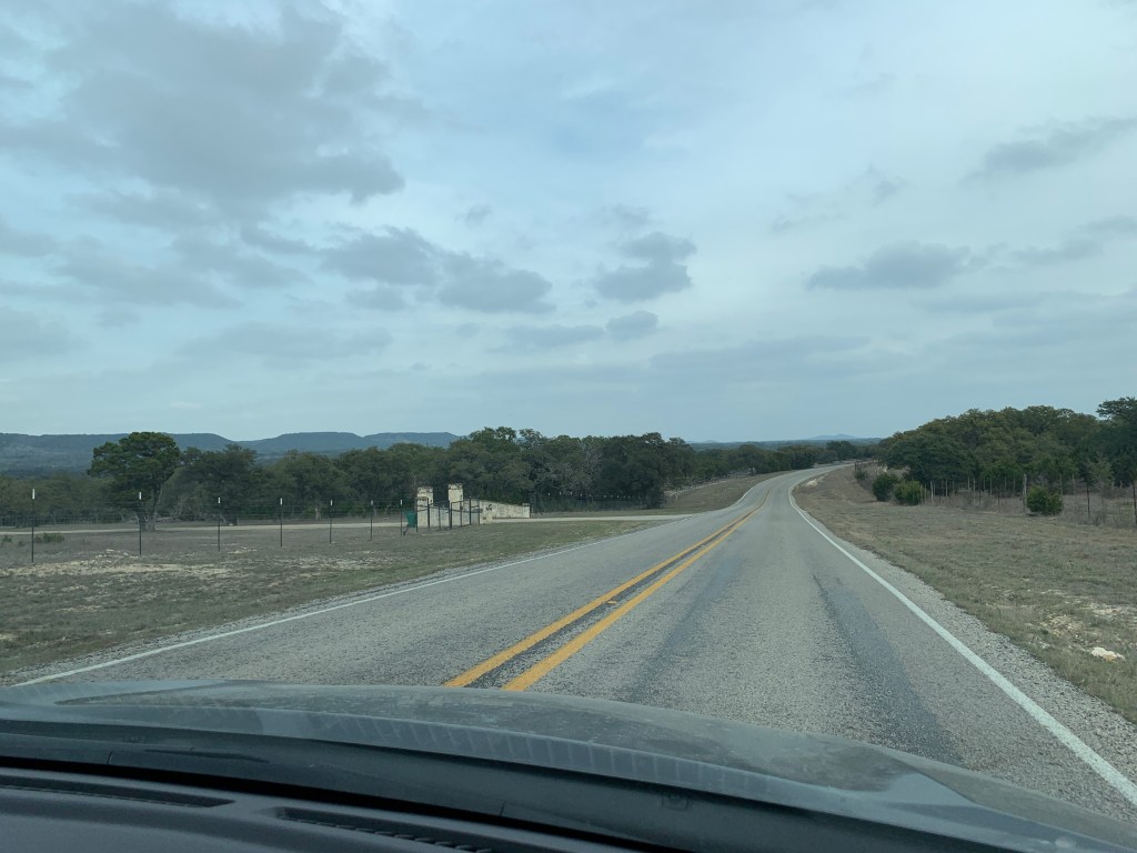 We rijden via het stadje Kerville over de Medina Highway naar Bandera. Vanaf Kerville is het een mooie route door de bergen. Het is nog bewolkt, maar de temperatuur noteert al 19 graden.