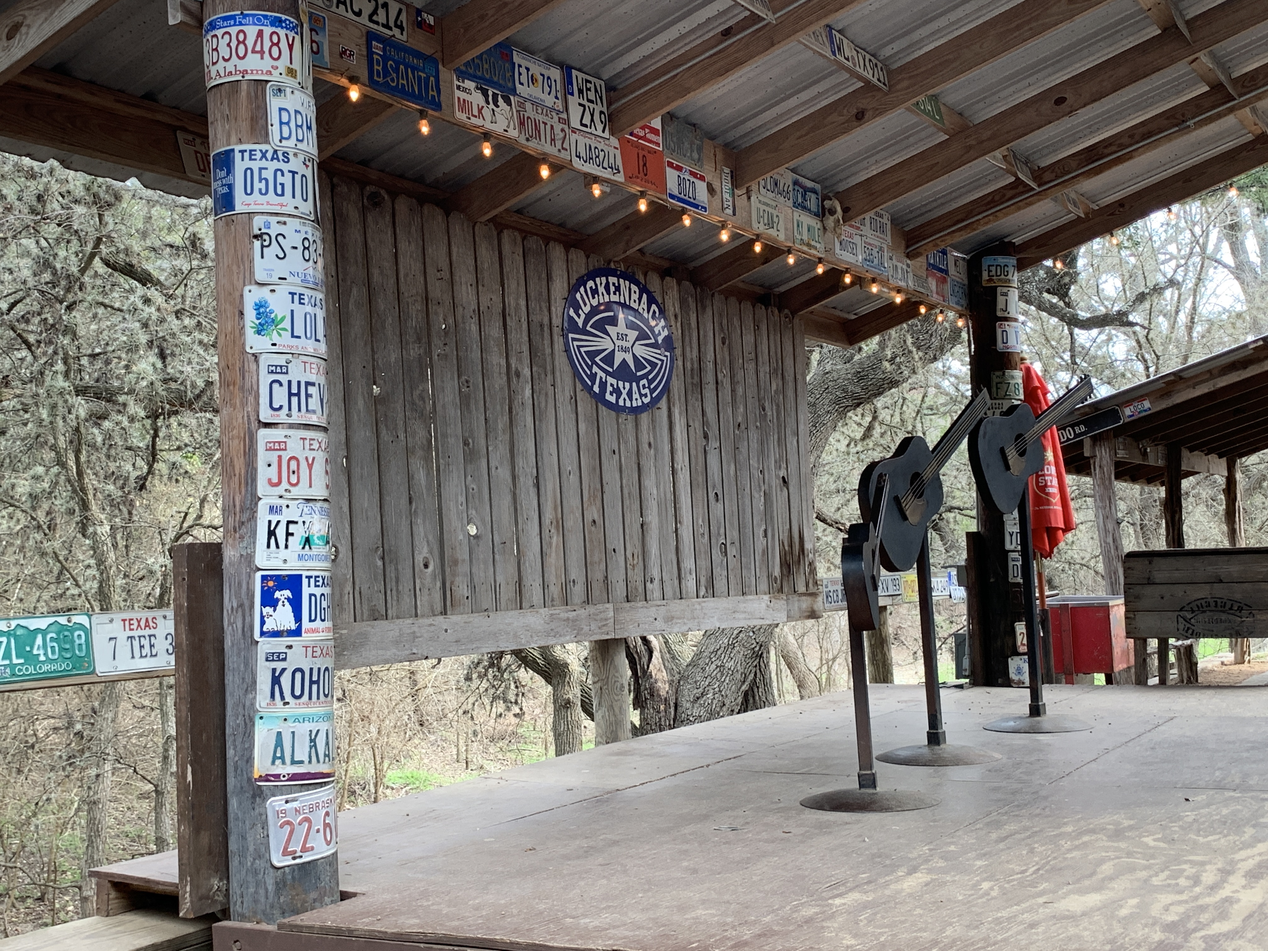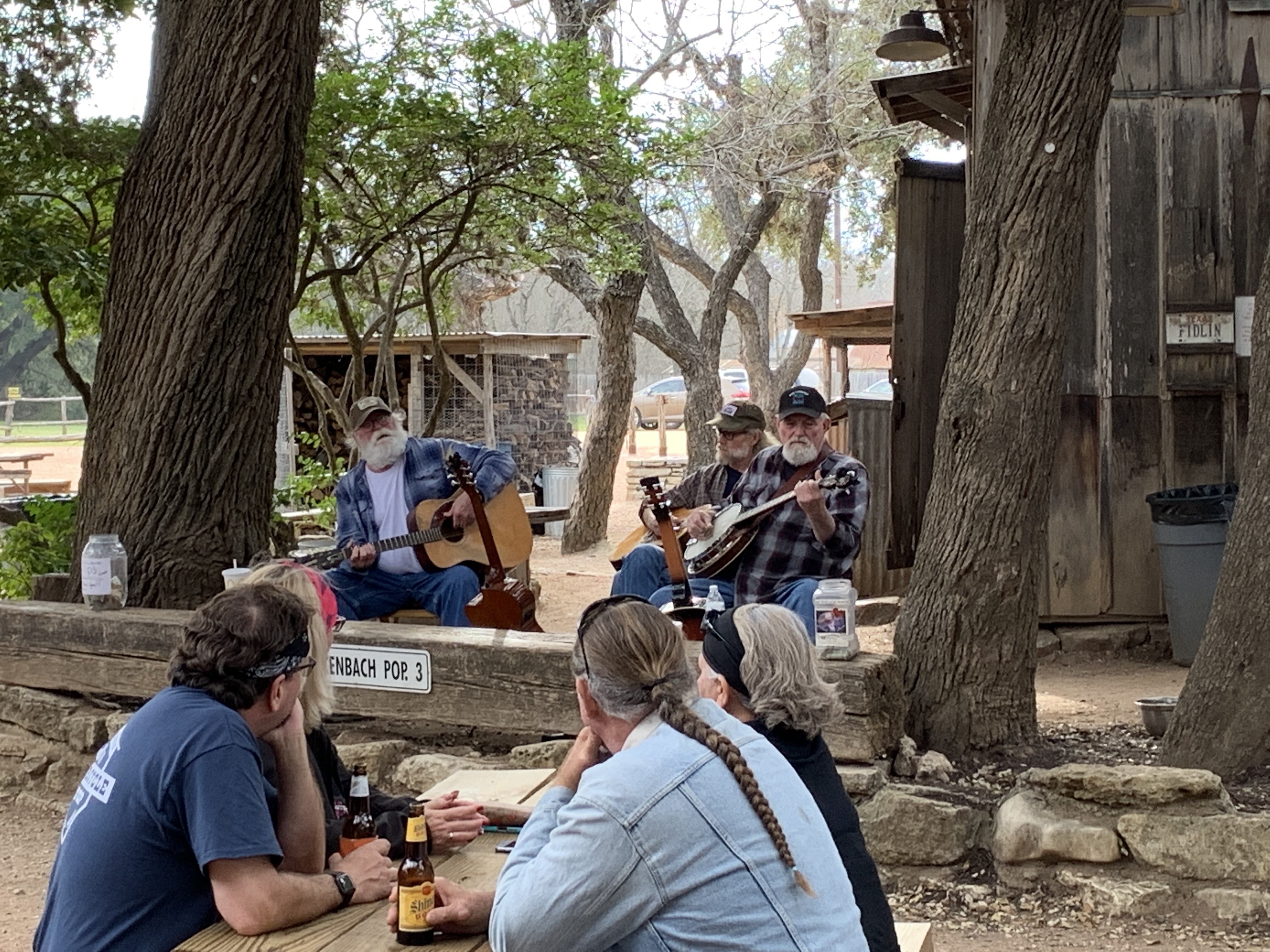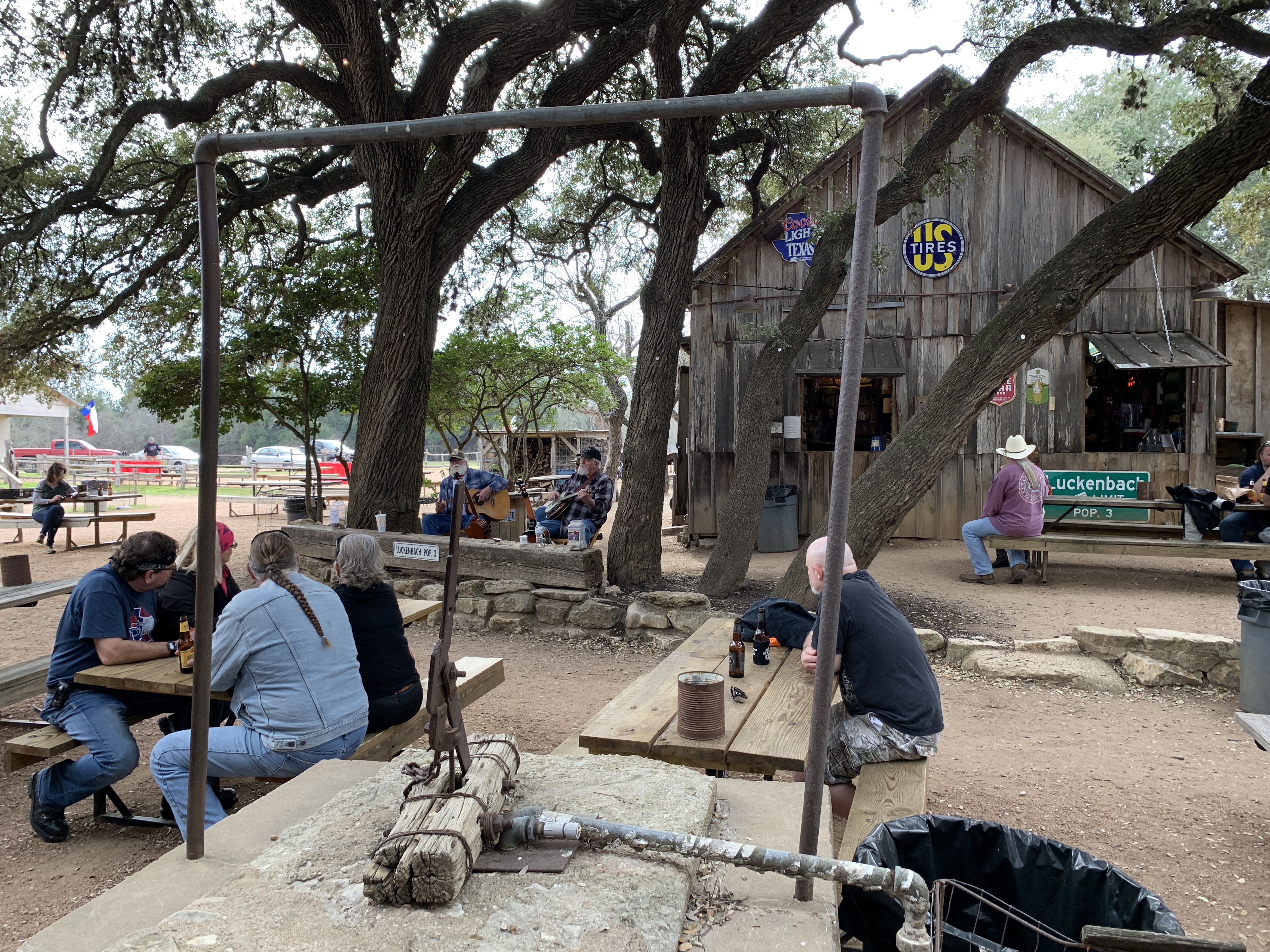 Nu is het een plek waar veel Country muziek gespeeld word. Als we aankomen zien we veel motoren en op het terras horen we de muziek al. Drie al op leeftijd zijnde muzikanten spelen oude Country nummers. Mensen drinken een biertje en zitten op de houten banken die er staan. Het is er heel gezellig. Zeker een tip bij een bezoek aan Texas dit plaatsje even bezoeken. Het is heel fotogeniek.