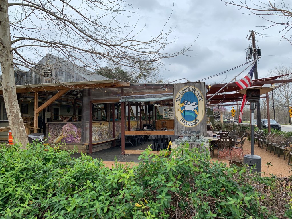Om 13.00 rijden we naar het plaatsje Boerne. Ook weer heel westernachtig. We rijden naar het River Road Park. Daar zien we een leuk restaurantje met veranda. Het restaurant heet The Dodging Duck Brewhaus & Restaurant.