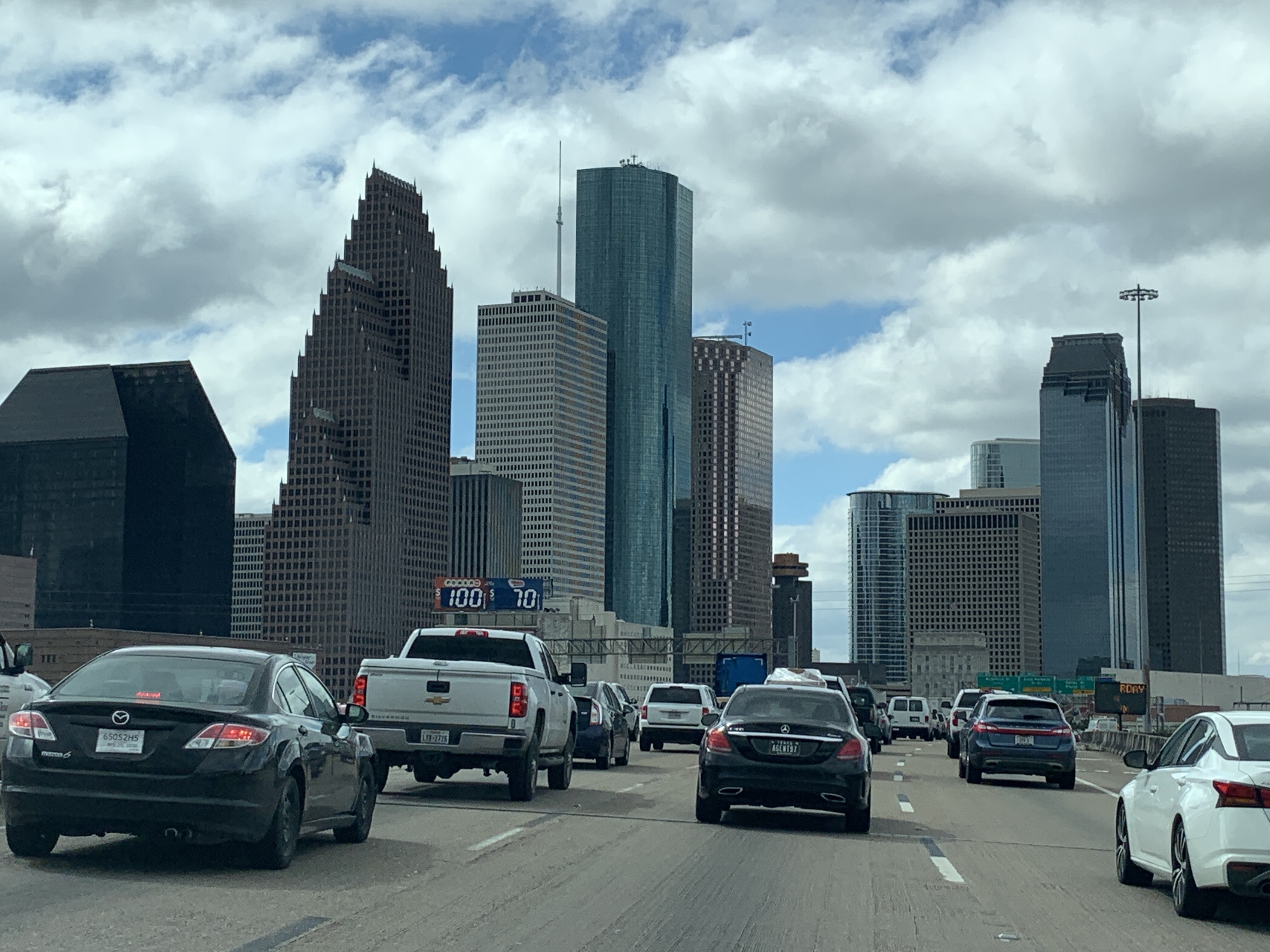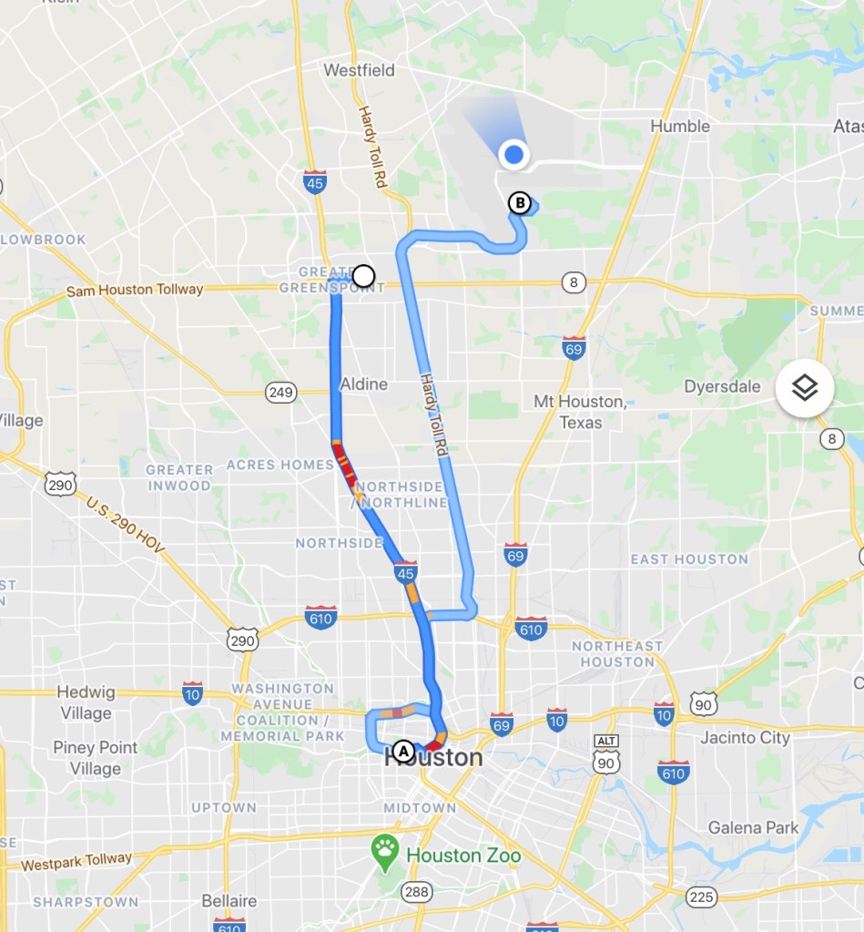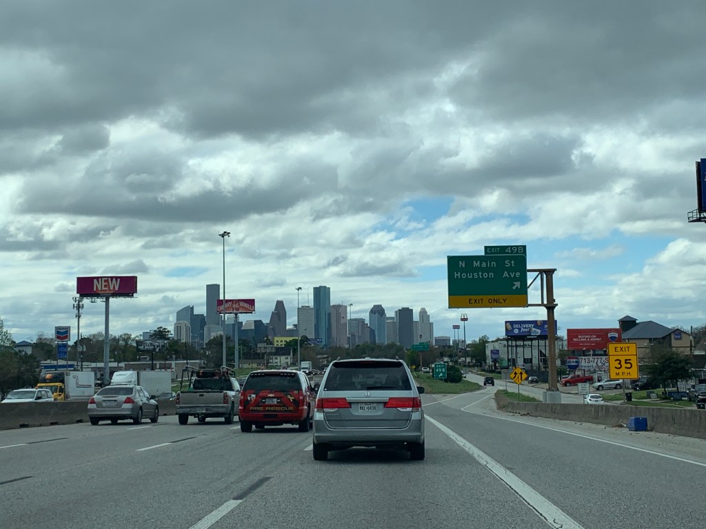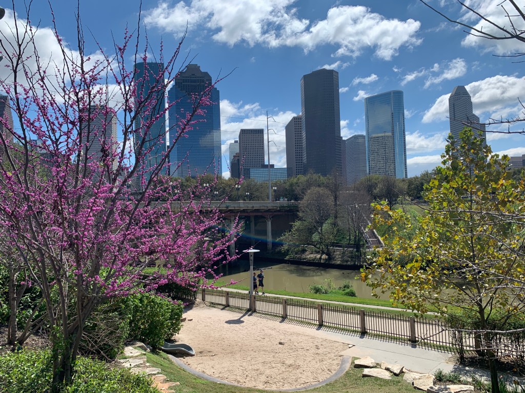 Om half 11 vertrekken we vanuit ons hotel en gaan nog even de indrukwekkende skyline van Houston bewonderen. Dat doen we bij Buffalo Bayou Park. Het is door het drukke verkeer van de grote stad nog ca. 30 minuten rijden vanaf ons hotel. We rijden nog een keer verkeerd, maar dankzij Tom Tom komen we er altijd wel.