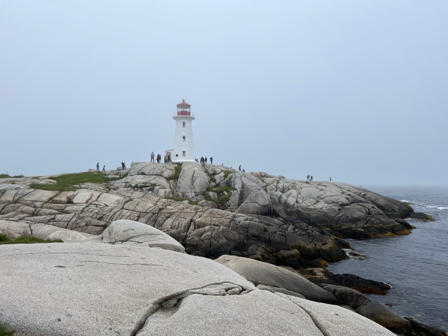 Peggy’s cove is 1 van de populairste vissersdorpjes van Canada. De Peggy’s Cove lighthouse, gebouwd op grote, gladde granietrotsen is 15 meter hoog. De vuurtoren behoort tot de meest gefotografeerde plekken van Atlantisch Canada. Dat bleek ook wel want er waren heel veel mensen die zichzelf met de vuurtoren op de achtergrond wilden vereeuwigen. Uiteraard doen wij net zo hard mee. De mist maakte het totaal plaatje nog mystieker.