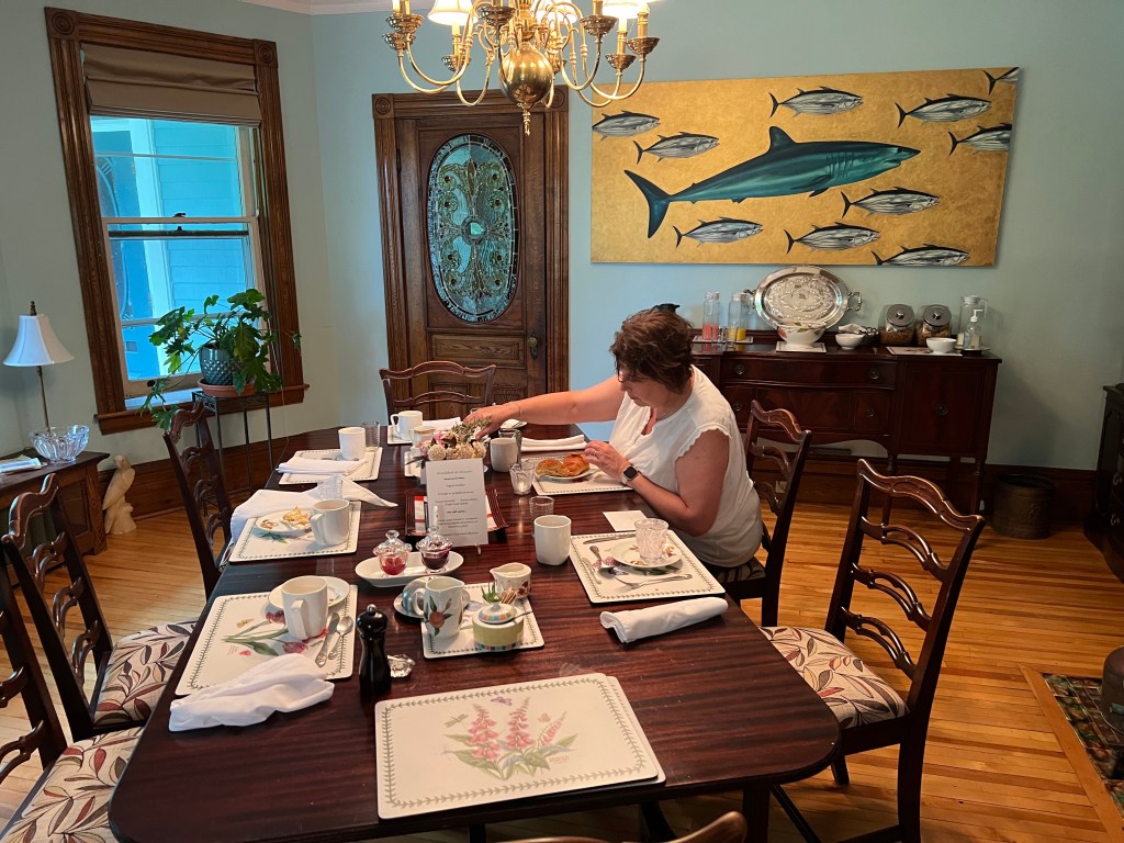 We beginnen de dag regenachtig. We willen eigenlijk vandaag een trail gaan lopen, maar of dat gaat lukken?? Dat zien we later wel. We gaan eerst om 9 uur ontbijten beneden bij onze gastheren Joe en Christofer. We zitten aan een grote tafel samen met een echtpaar uit Montréal. Dat was gezellig en gastheer Joe kwam ook regelmatig langs om ook weer gezellig mee te kletsen. Het ontbijt was voortreffelijk met eigengemaakte frittata en een heerlijk frisse parfait. We kunnen er weer even tegen.