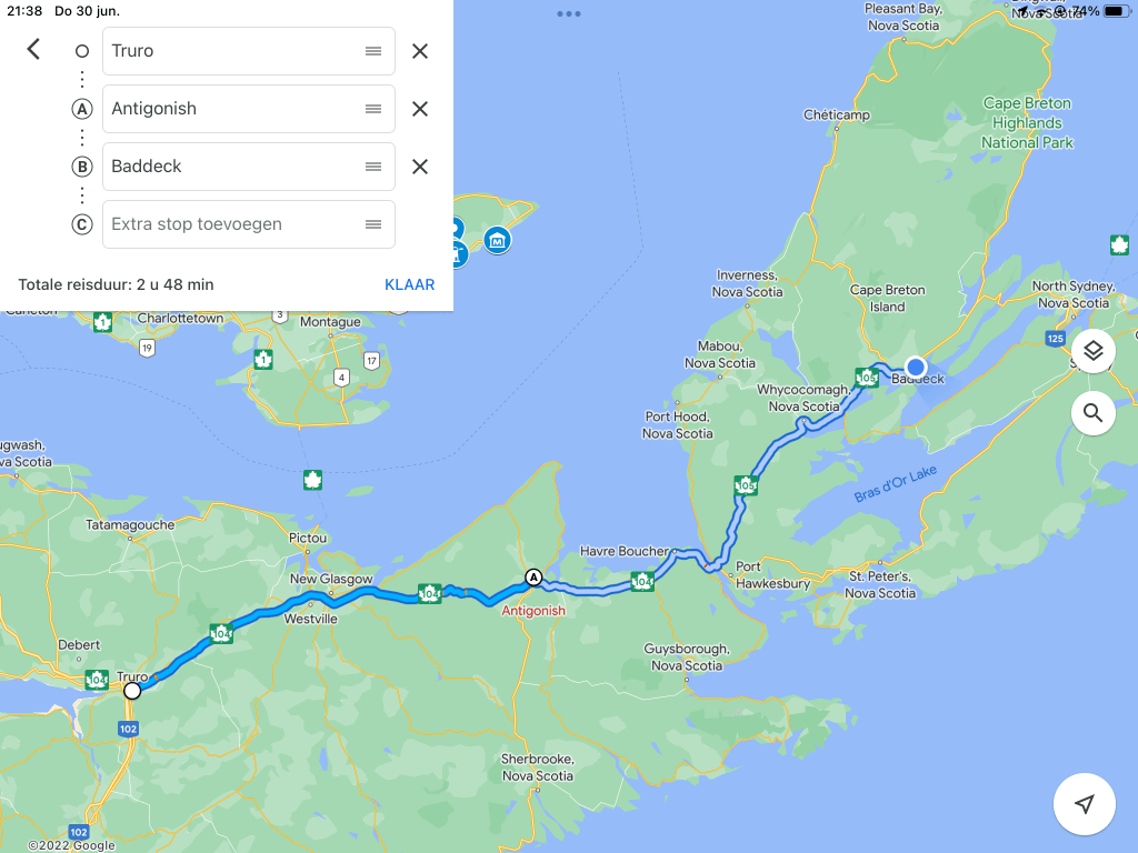 Deze dag is dan wel weer om. Morgen wacht een mooie rit, de Cabot Trail. We zijn benieuwd.