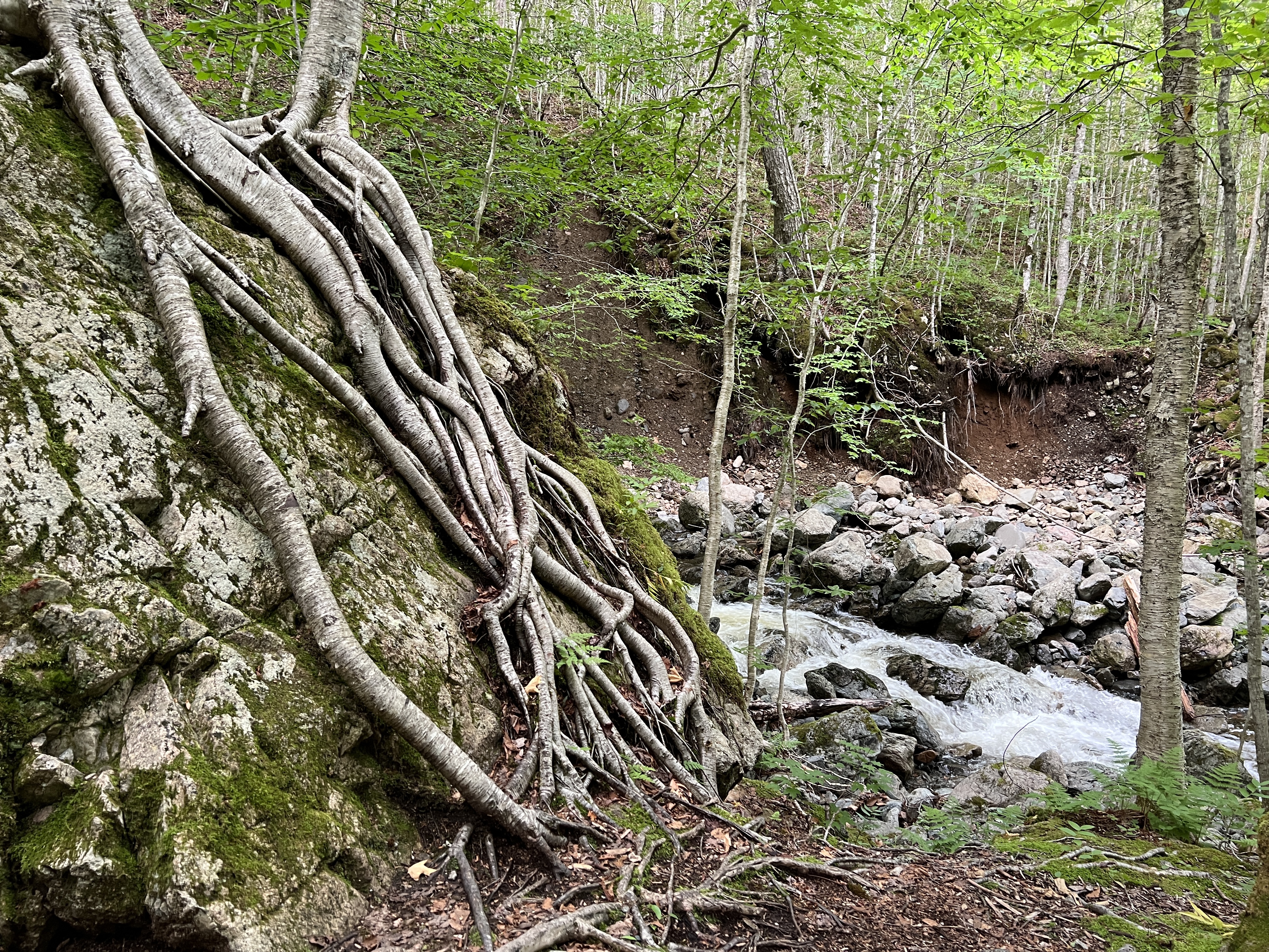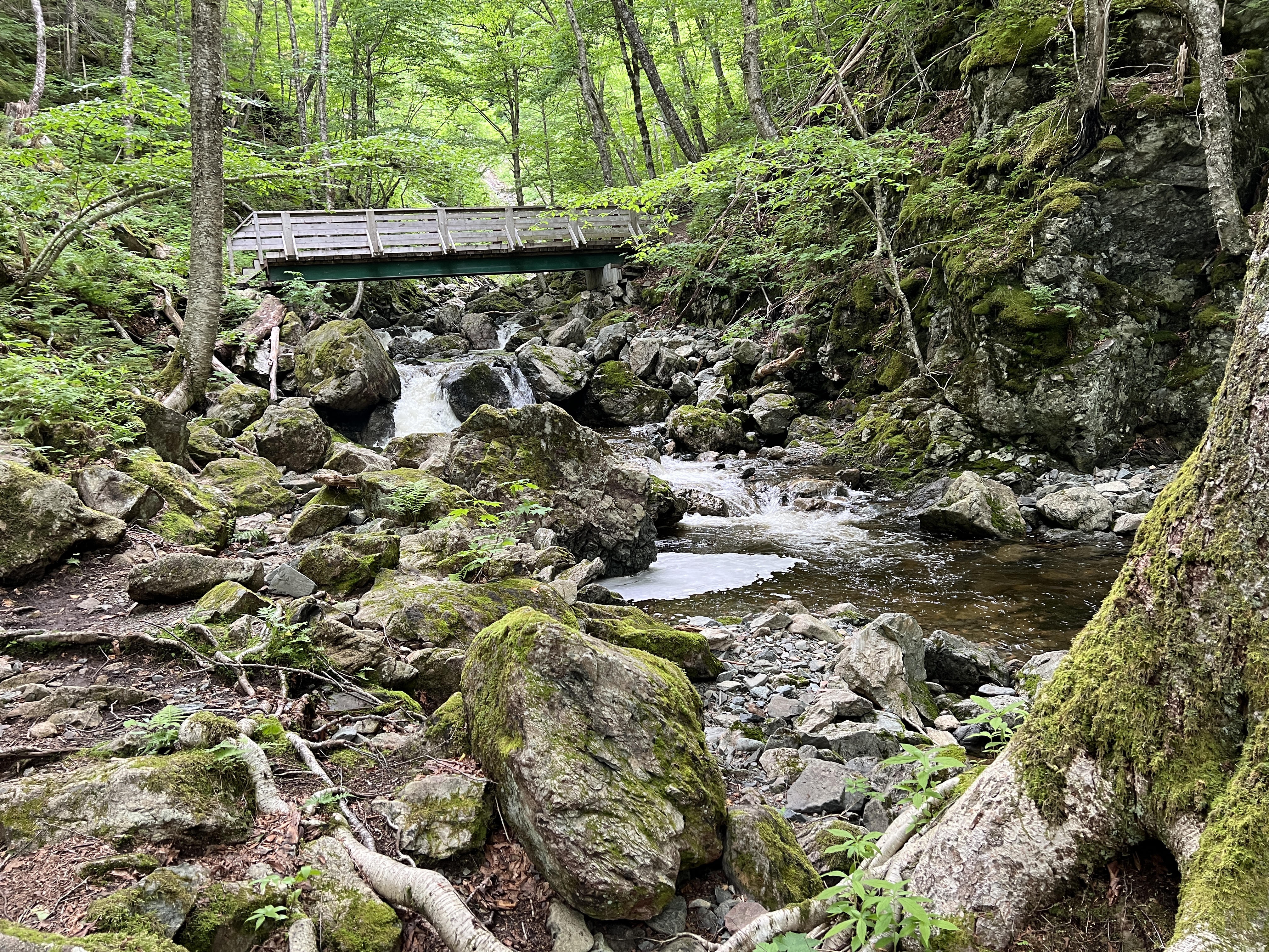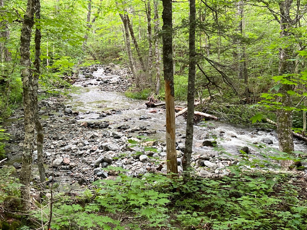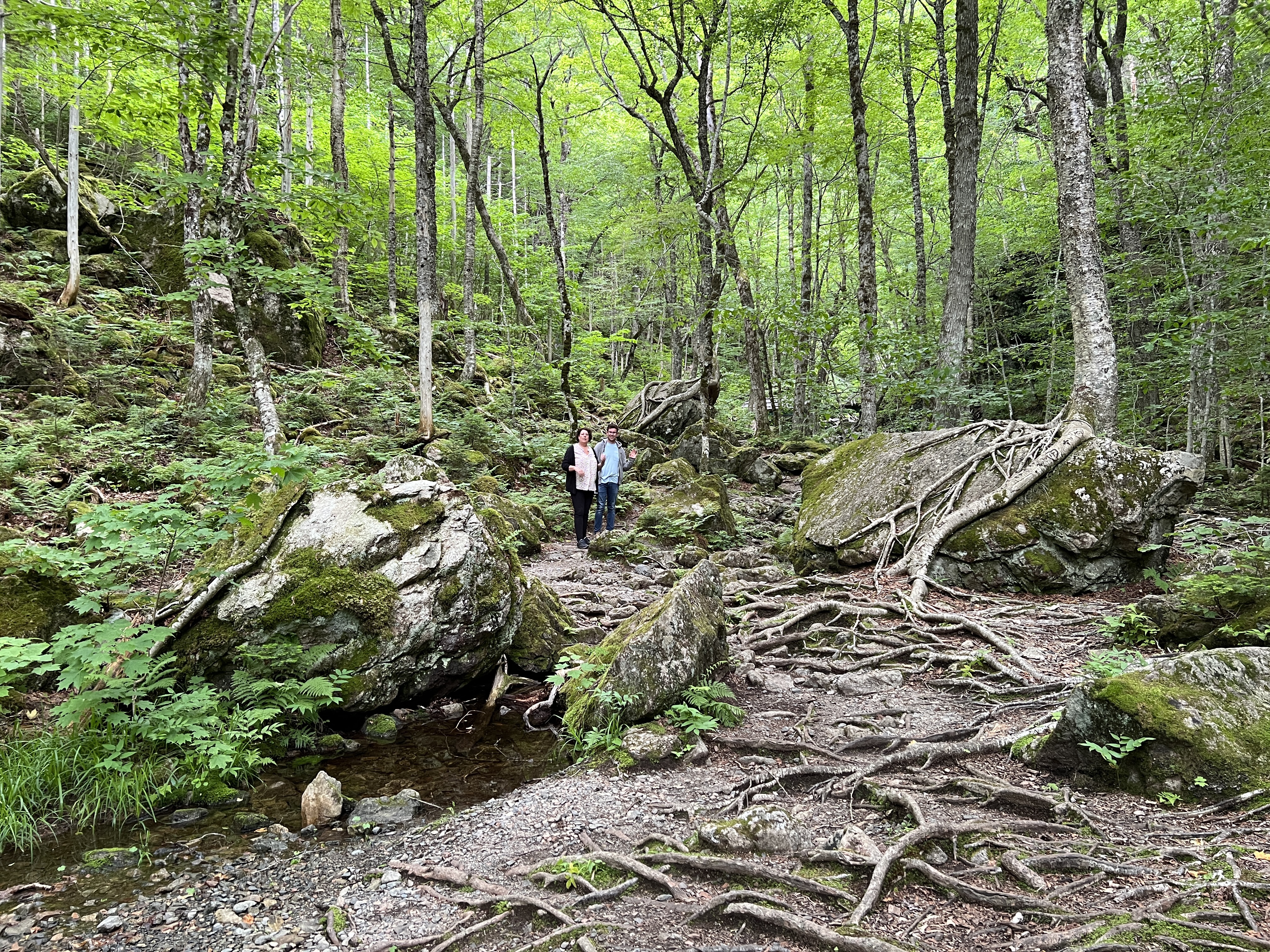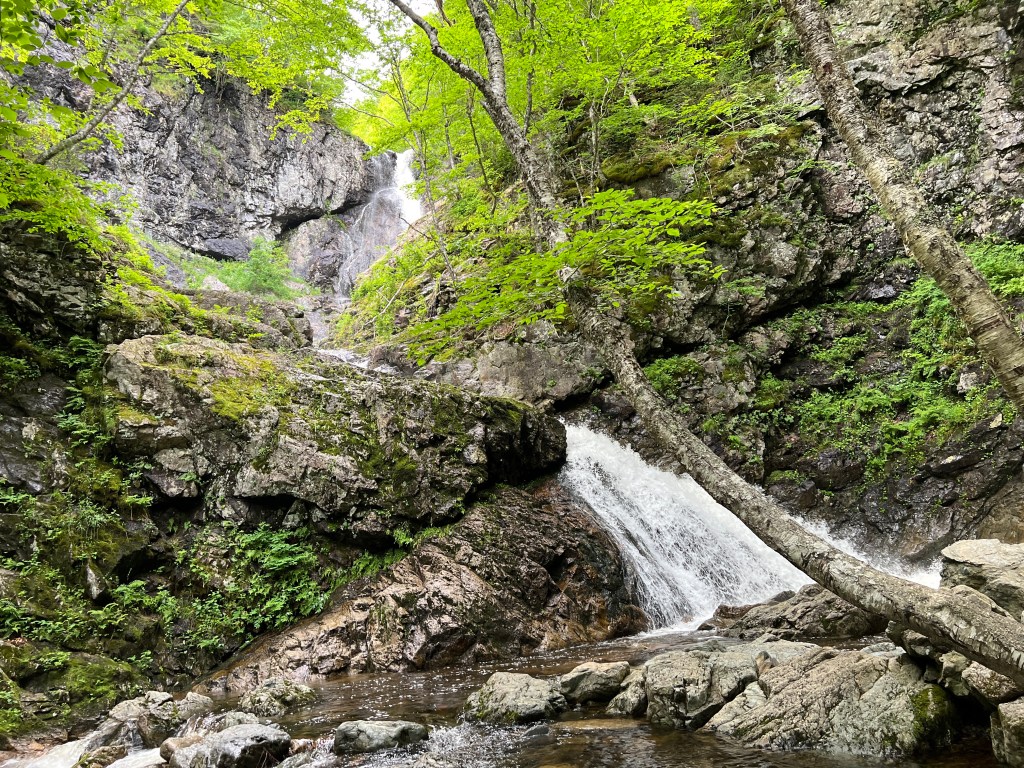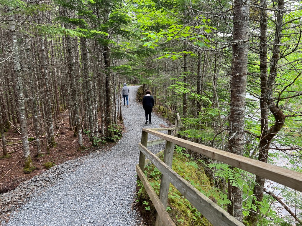 Vanaf Baddeck is het ca. 20 minuten rijden. Het grootste deel van de rit gaat over asfalt. De laatste 4 km gaan we een zijweg in en rijden over een grindpad. We parkeren de auto op de parkeerplaats en spuiten ons in met de muggendeet die we vanochtend gekocht hebben. Het pad naar de waterval is mooi aangelegd. Het is een grindpad. Onderweg lopen we langs een snelstromend riviertje.