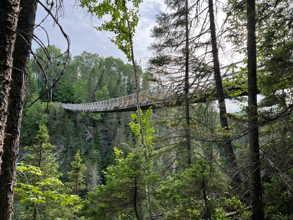 Na deze waterval goed bewonderd te hebben lopen we terug naar de auto en rijden 2 km verder. Hier parkeren we de auto. Er is een wandelroute naar een hangbrug die 63 meter boven de canyon hangt. Het is een mooie route er naar toe over een boardwalk en wat trappen. Onderweg wat uitkijkpunten. En dan zien we in de verte de hangbrug. Vanaf de brug kijk je zo ruim 60 meter naar beneden de canyon in.