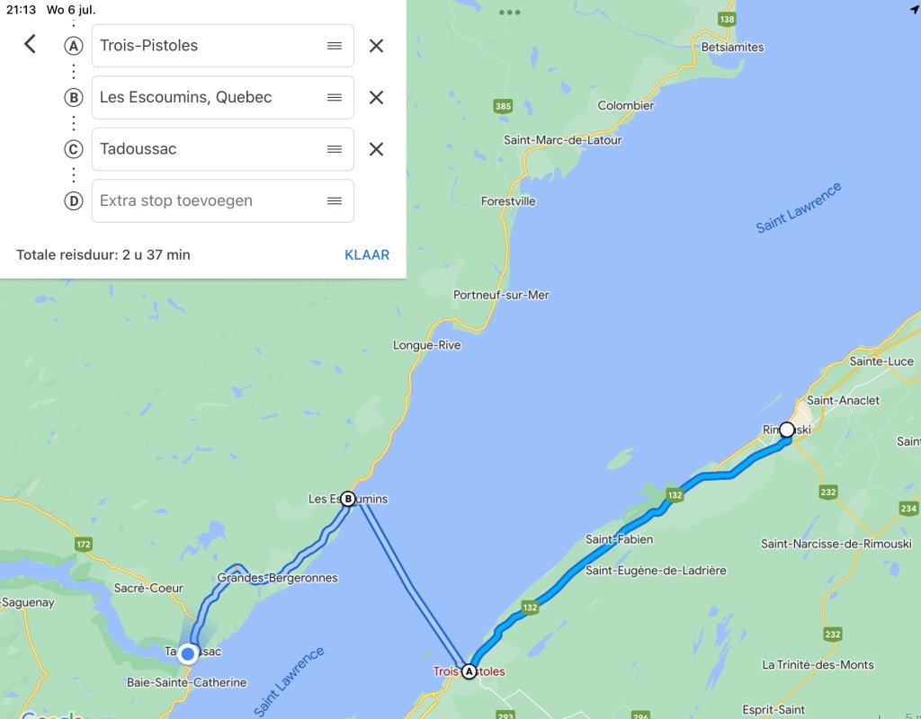 Hier vandaan vertrekt de Ferry over de Saint Lawrence River naar de overkant. De Ferry legt daar aan in Les Escoumins. We moeten een uur voordat de Ferry vertrekt in Trois-Pistoles aanwezig zijn.