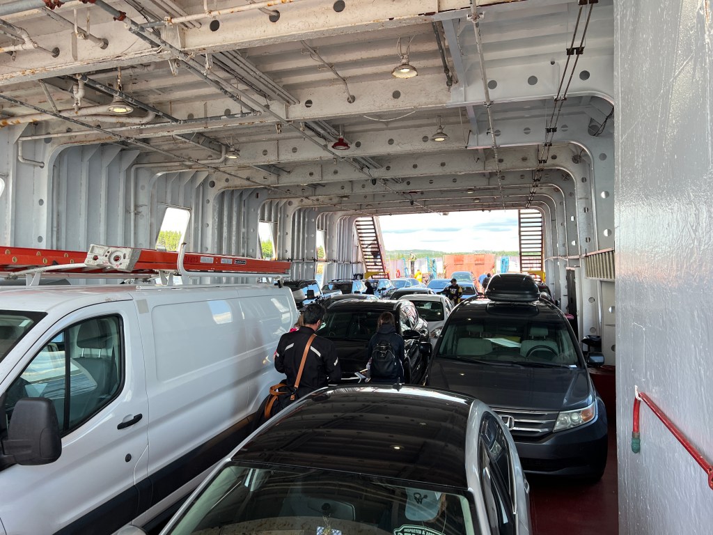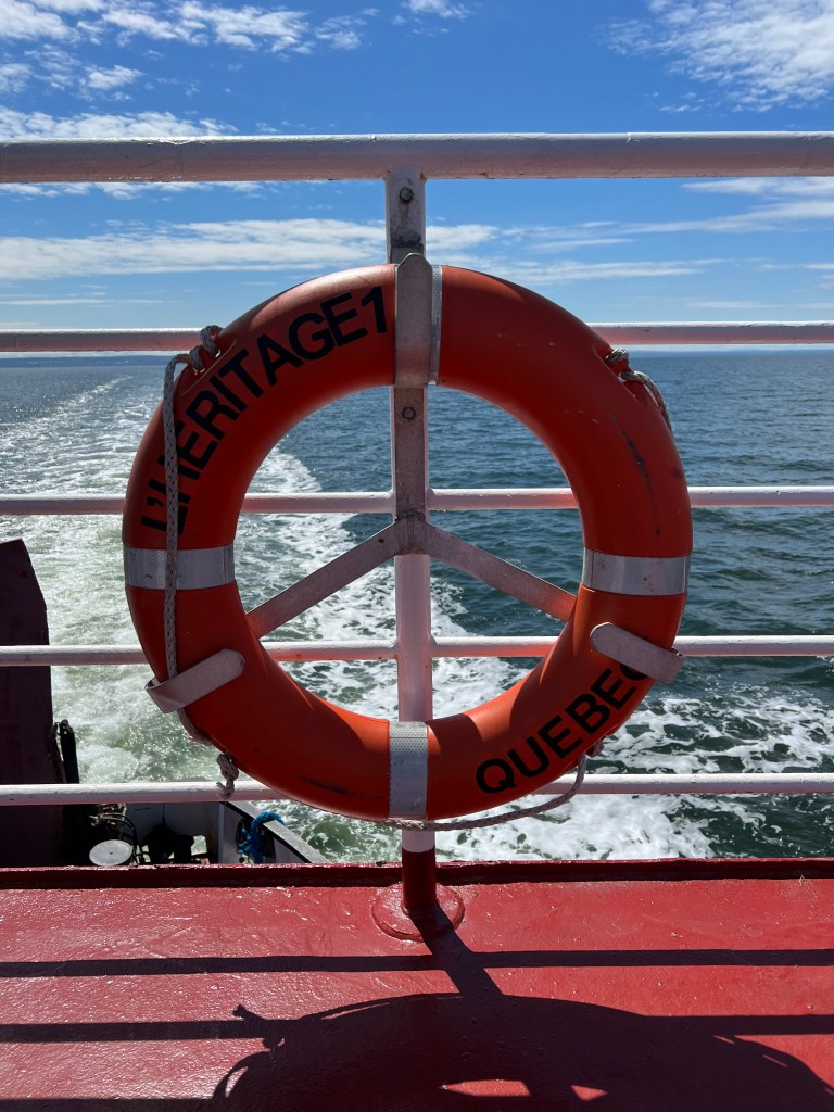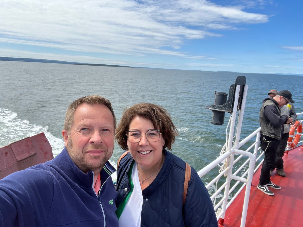 Om 10.15 rijden we de boot op. Deze vertrekt net voor half 11. We betalen binnen de tickets en nemen een koffie. Wat is de St. Lawrence River toch een immens brede rivier.