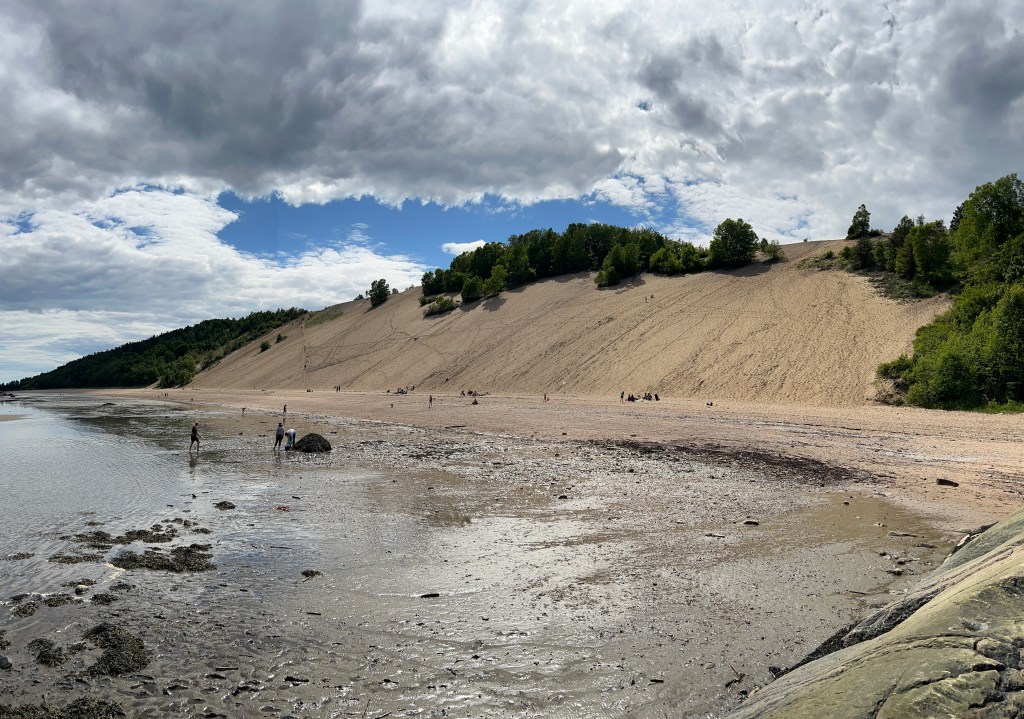 Na het eten rijden we met de auto naar de parkeerplaats van Les Dunes. Hier liggen meters hoge duinen langs de kust. We lopen naar een uitzichtpunt met zicht op de duinen. Harry loopt nog via een steil pad naar beneden om de duinen vanaf het strand te bekijken.