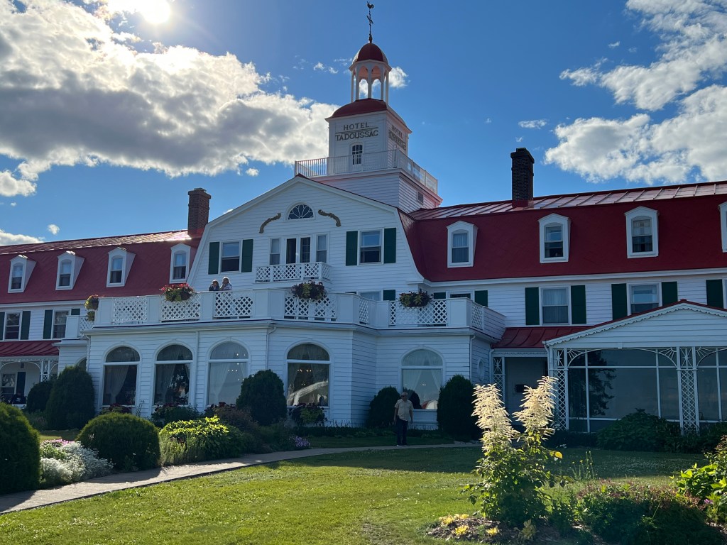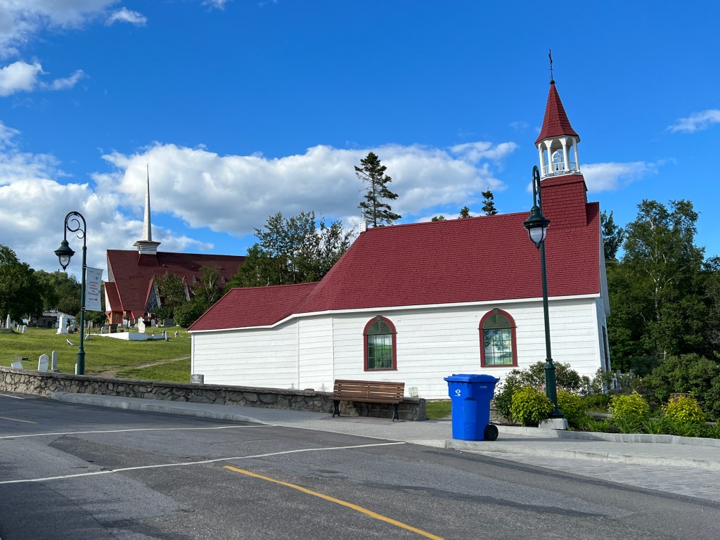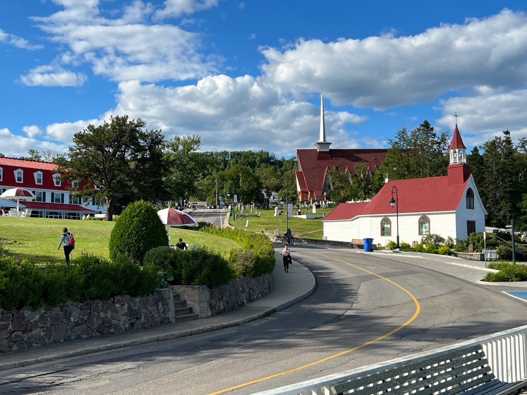 Om 17.15 uur lopen we nog naar de haven van Tadoussac. We nemen eerst een weggetje via het bos naar de strand/haven. We lopen terug naar het centrum. We lopen o.a. langs het prachtige rood wit gekleurde Tadoussac hotel.