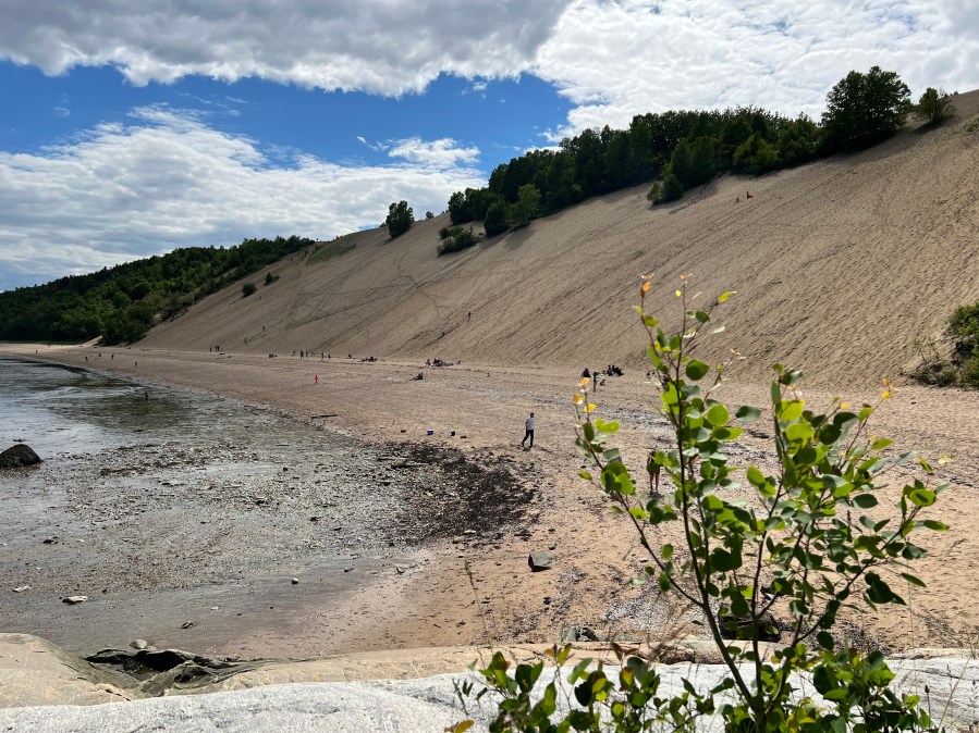 Na het eten rijden we met de auto naar de parkeerplaats van Les Dunes. Hier liggen meters hoge duinen langs de kust. We lopen naar een uitzichtpunt met zicht op de duinen. Harry loopt nog via een steil pad naar beneden om de duinen vanaf het strand te bekijken.