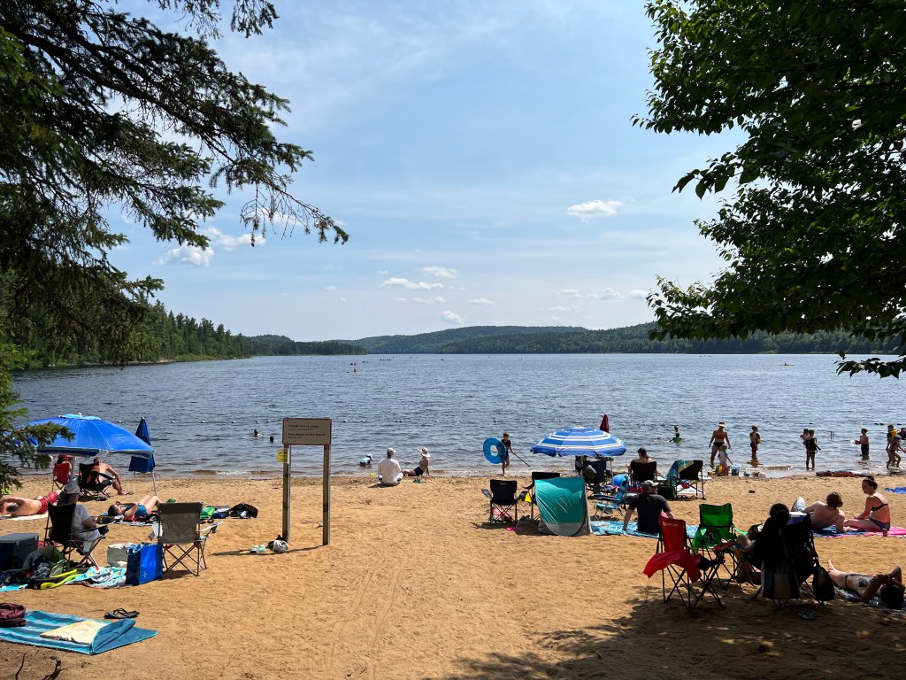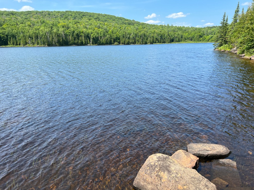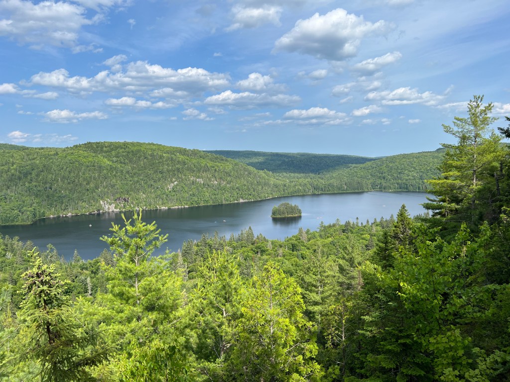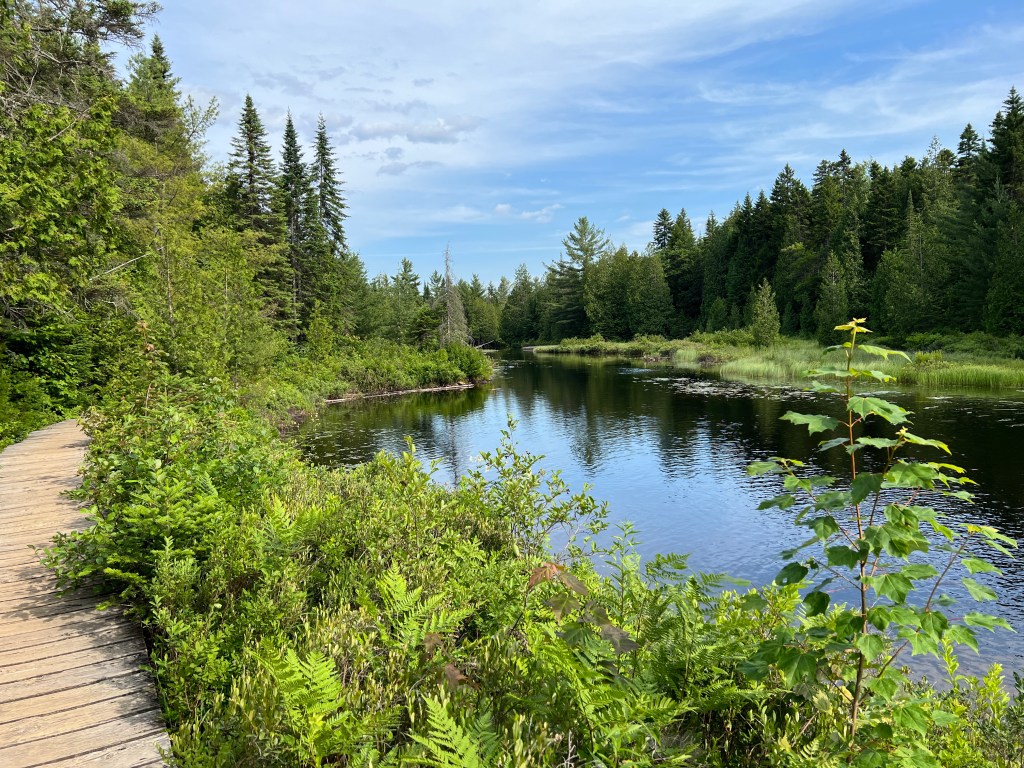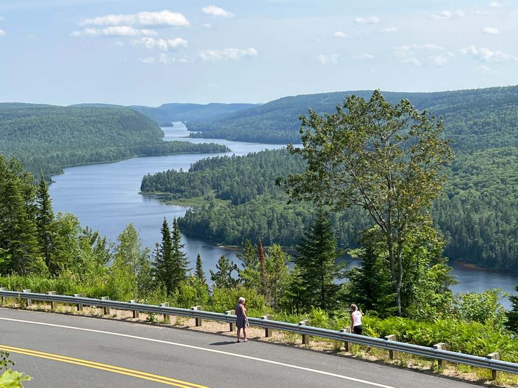 Bij afslag La Aux Pins lopen we een 200 pad met af en toe een paar houten trappen naar beneden naar een mooi uitzichtpunt over Lac Wapizagonke. Helaas moeten we daarna ook weer 200 meter terug klimmen. 😊