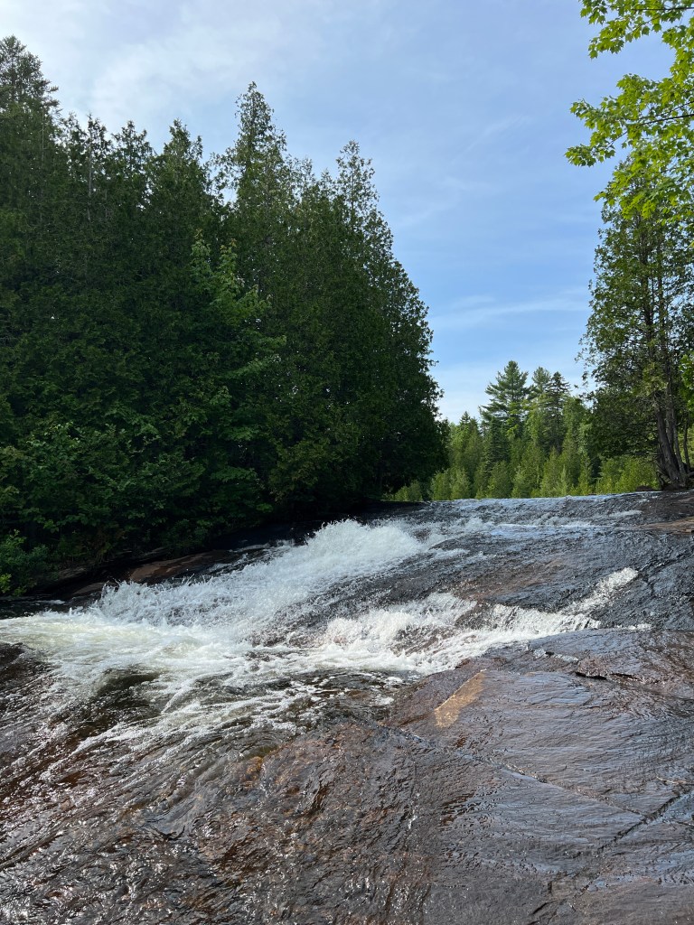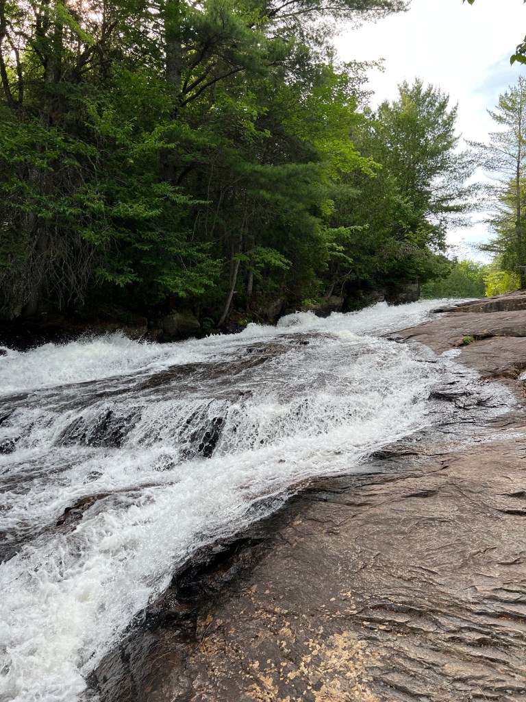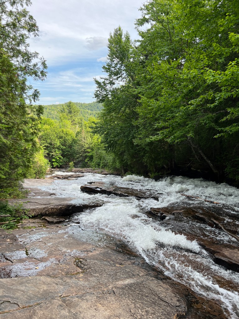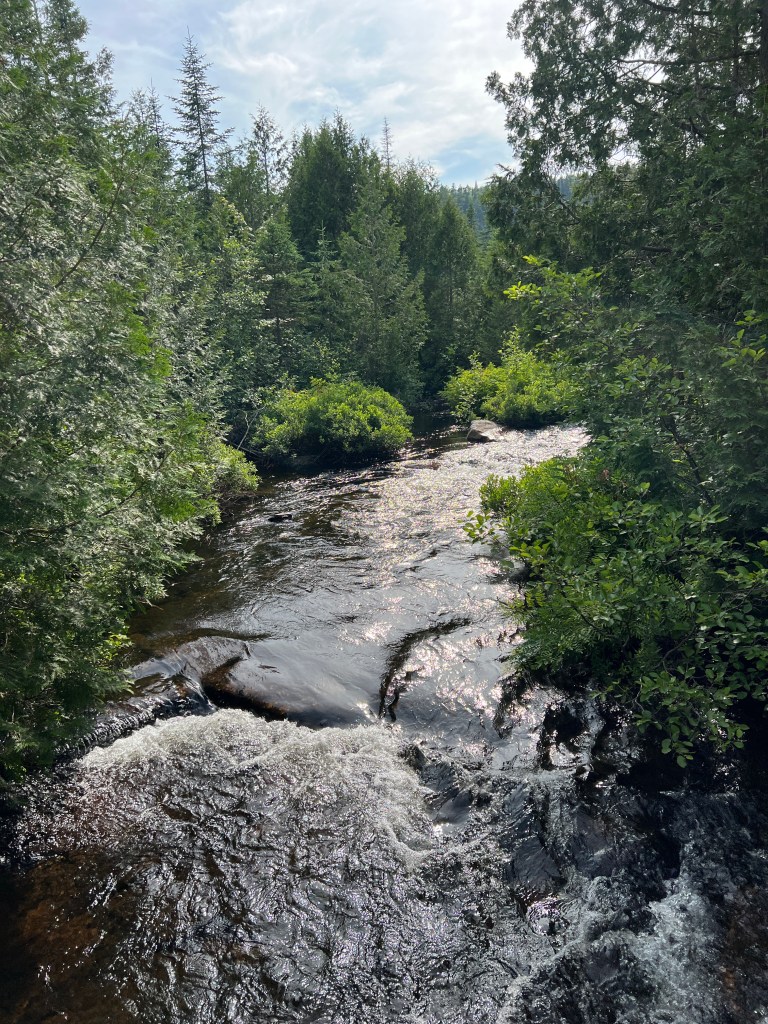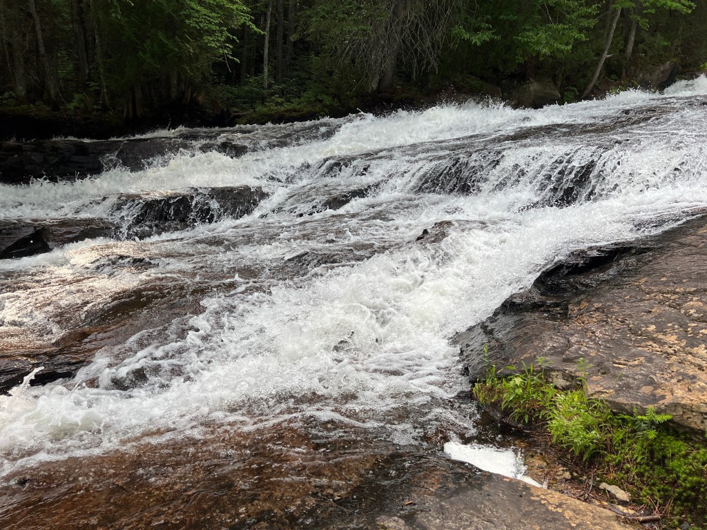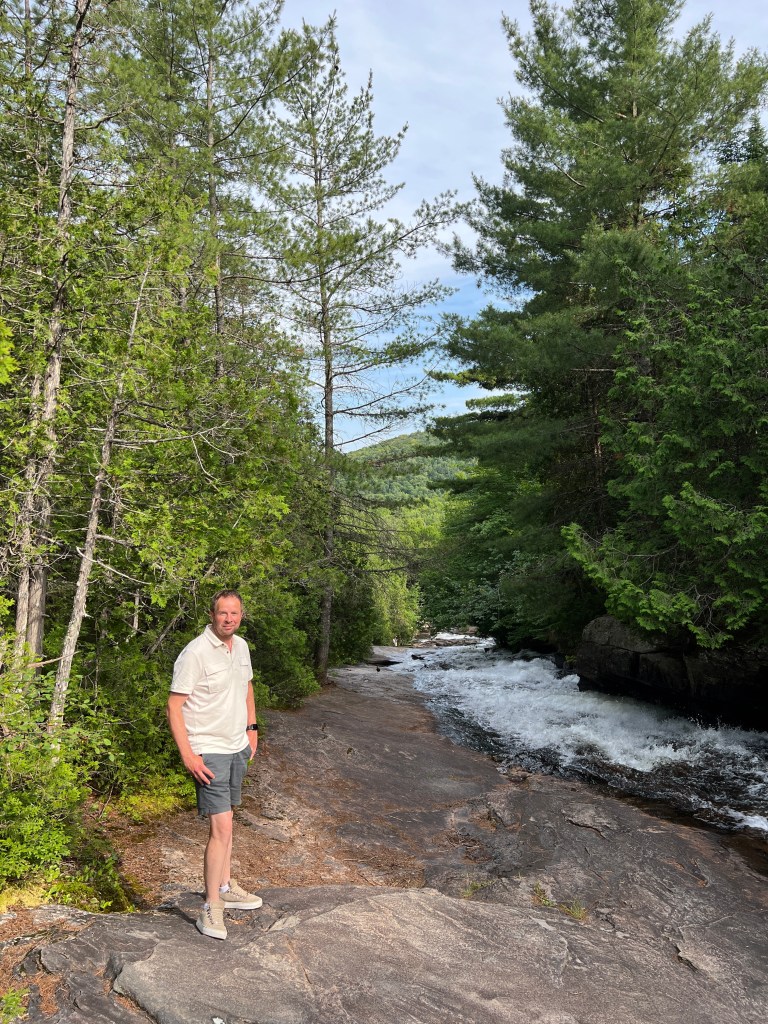 Bij afslag La Aux Pins lopen we een 200 pad met af en toe een paar houten trappen naar beneden naar een mooi uitzichtpunt over Lac Wapizagonke. Helaas moeten we daarna ook weer 200 meter terug klimmen. 😊