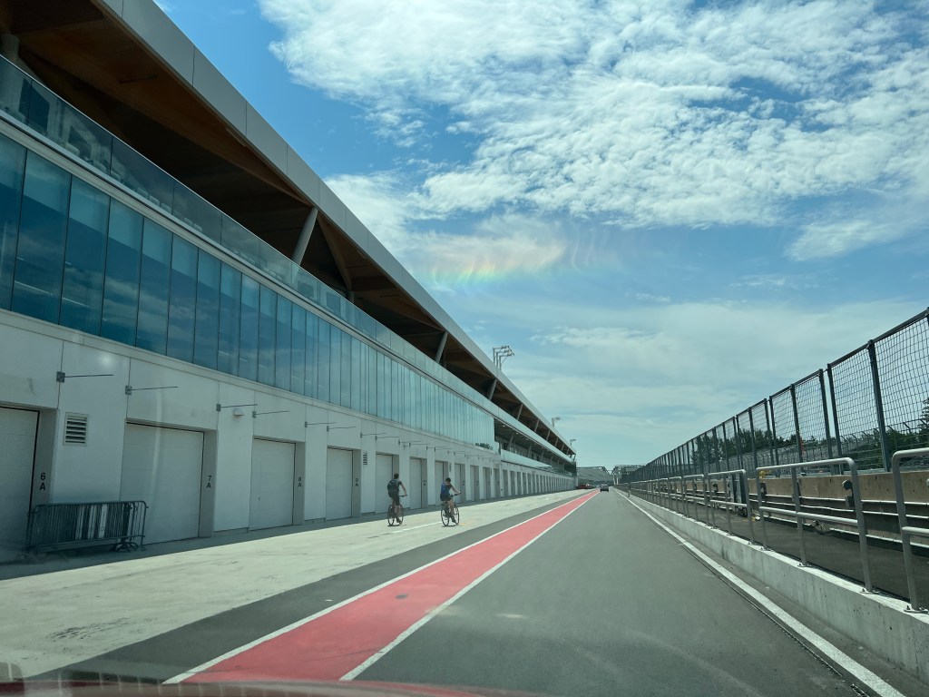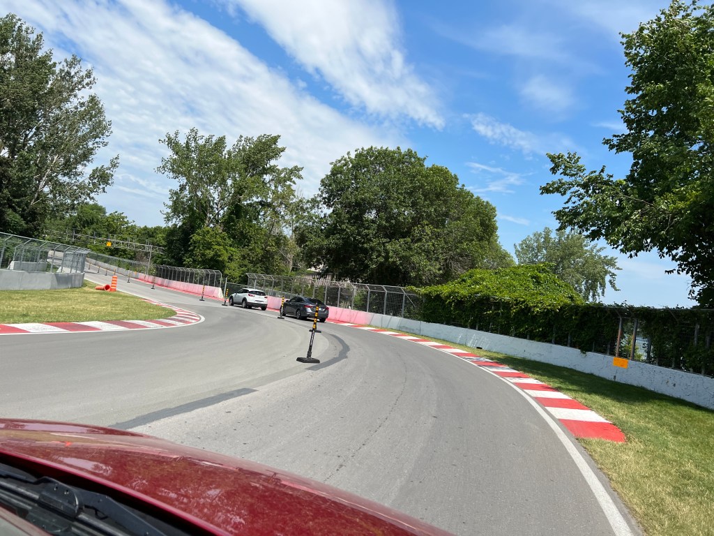 Via een andere brug rijden we Ile Notre-Dame op. Het eiland is in 1967 speciaal aangelegd voor de Expo met aarde opgegraven bij de aanleg van de metro. Nu rijden wij over het Formule 1 circuit dat hier ook aangelegd is. Ingrid kan los op het circuit.😄