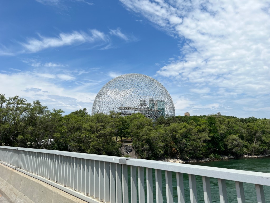 Het eerste wat we willen doen is over het Gilles Villeneuve Formule 1 circuit rijden. Verstappen won er enkele weken geleden nog. Via de Pont Jacques-Cartier brug rijden we eerst het eiland Ile Saint-Helene op waar in 1967 de wereldtentoonstelling gehouden werd. Het grote ronde gebouw was het paviljoen van de Verenigde Staten. Het biedt nu onderdak aan La Biosphere (een museum).
