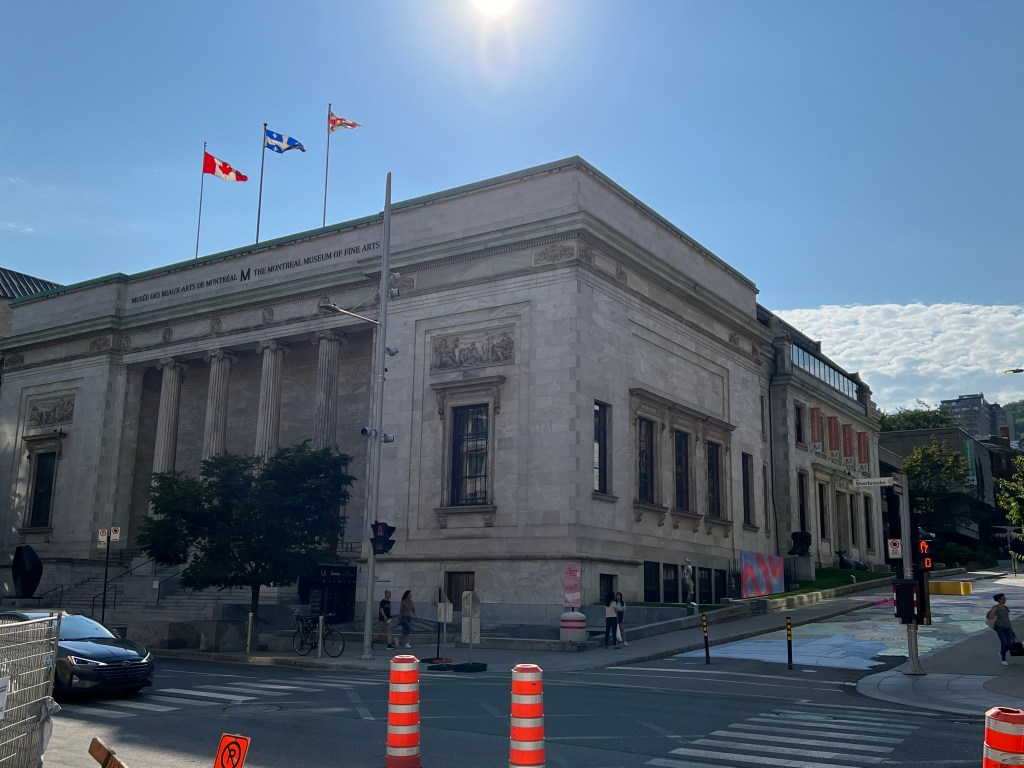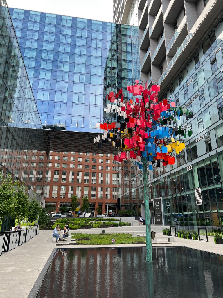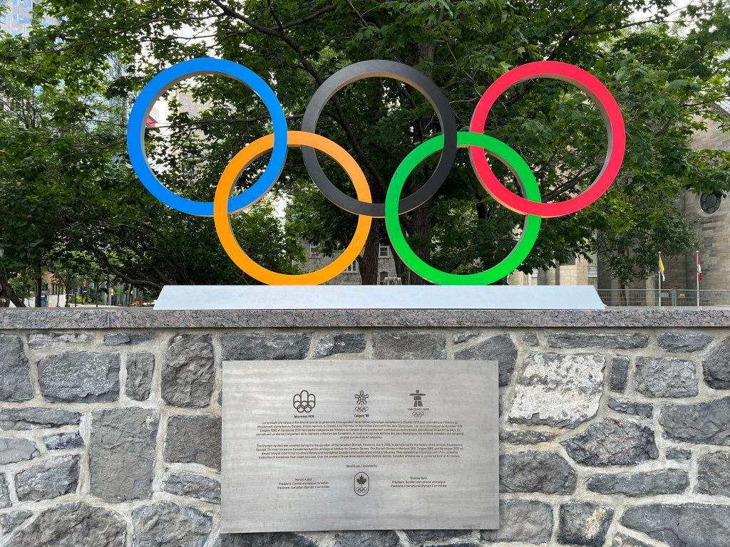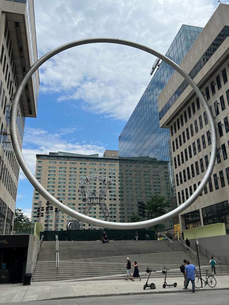 We besluiten eerst maar ergens te gaan lunchen in de stad. Het is warm buiten, maar het waait wel lekker. We eten wat op een terrasje aan de Avenue McGill College. We hebben hier uitzicht op L’Anneau, een rond kunstwerk.