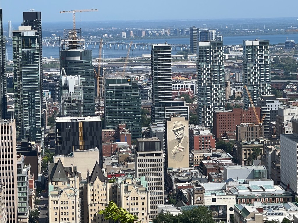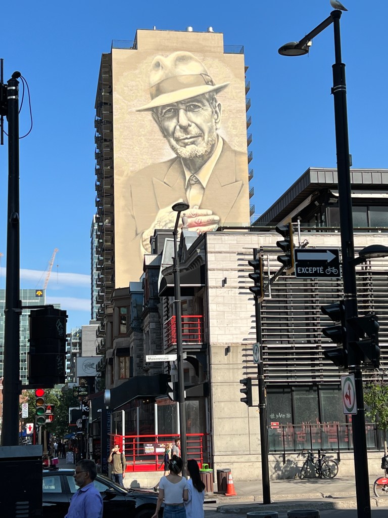 We nemen terug de snelle route via de trappen. We komen nog een marmot tegen. We lopen terug naar het centrum. We zien een prachtige mural van de in 2016 overleden Canadese zanger, dichter en schrijver, Leonard Cohen. Vanaf de Mont-Royal konden we deze al zien.