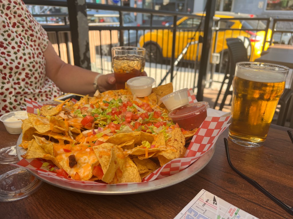 Van de flinke wandeling krijgen we wel dorst. Bij een Ierse pub drinken we op het terras een biertje en een ginger-ale en een flinke schaal met nachos wat een beetje teveel van het goede bleek. 😊