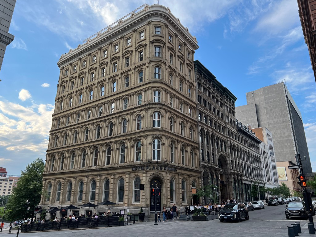 Het is inmiddels 12.45 uur als we via de Pont Victoria brug het centrum van Montreal inrijden. Ons hotel Le Square Philips ligt aan het gelijknamige plein. We zoeken een parkeergarage wat niet meevalt in het drukke centrum. Maar het lukt. Het is nog 500 meter lopen naar het hotel waar we inchecken. Maar dan blijkt dat er iets niet goed is. Ze kunnen onze naam niet vinden. Uiteindelijk blijkt dat de kamer geboekt is voor 11 juni i.p.v. 11 juli. Harry haalt de voucher, die nog in de auto ligt, op. Op de voucher staat wel 11 juli. Dan is er iets fout gegaan bij onze reisorganisatie. Gelukkig is er nog wel een kamer vrij. Als we thuis komen regelen we het wel met de reisorganisatie. We kunnen wel, voordat we de stad ingaan, de kamer al in.