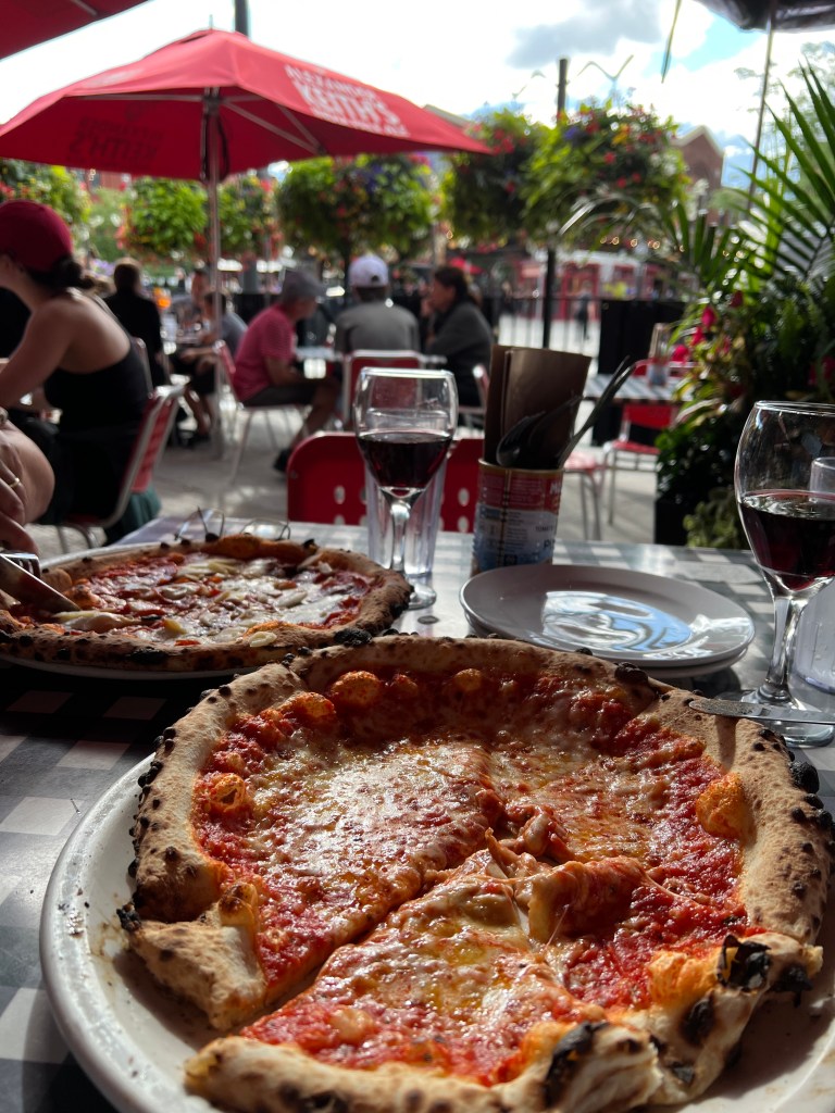 We gaan eten bij The Grand. Hier eten we een lekkere pizza. Gelukkig zitten we droog onder grote parasols want er trekt nog een kortstondige bui over.