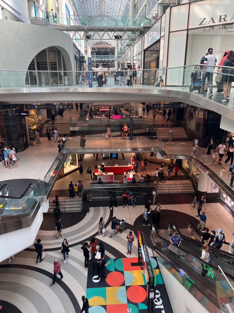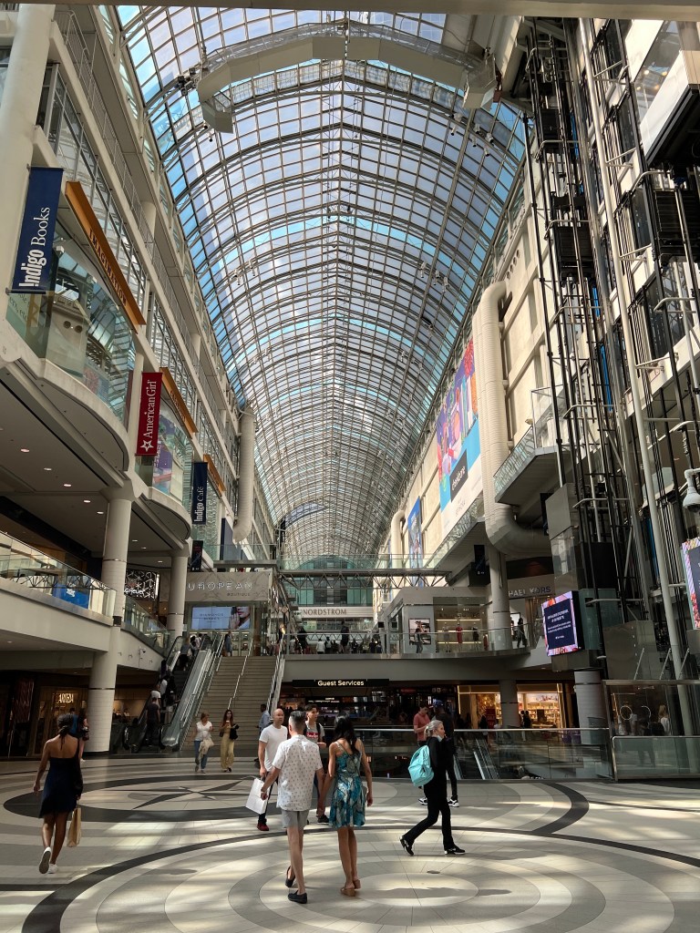 Bij het grote overdekte winkelcentrum Toronto Eaton Centre kopen we een smoothie met een broodje erbij.