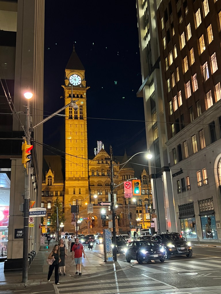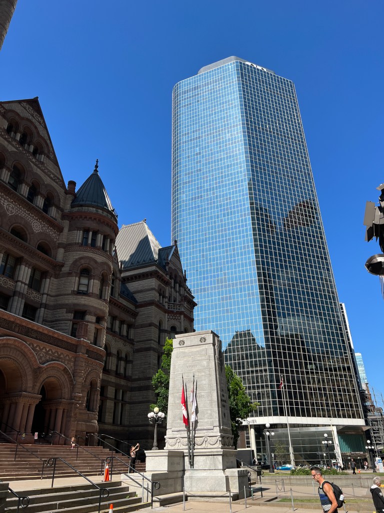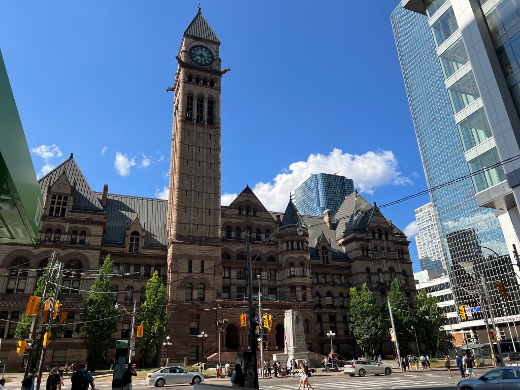 Verderop gaan we rechtsaf Queen Street in. Hier staat de Toronto Old City Hall. Hier zetelt het stadsbestuur van Toronto. Het is gebouwd in 1899. Een al oud gebouw tussen de wolkenkrabbers.
