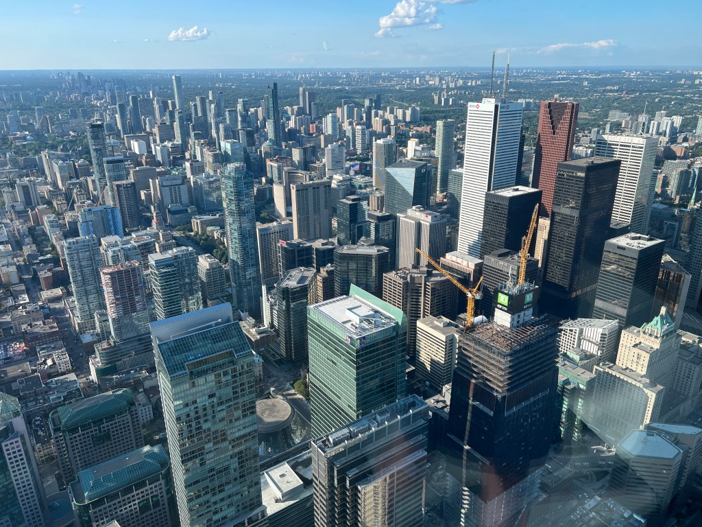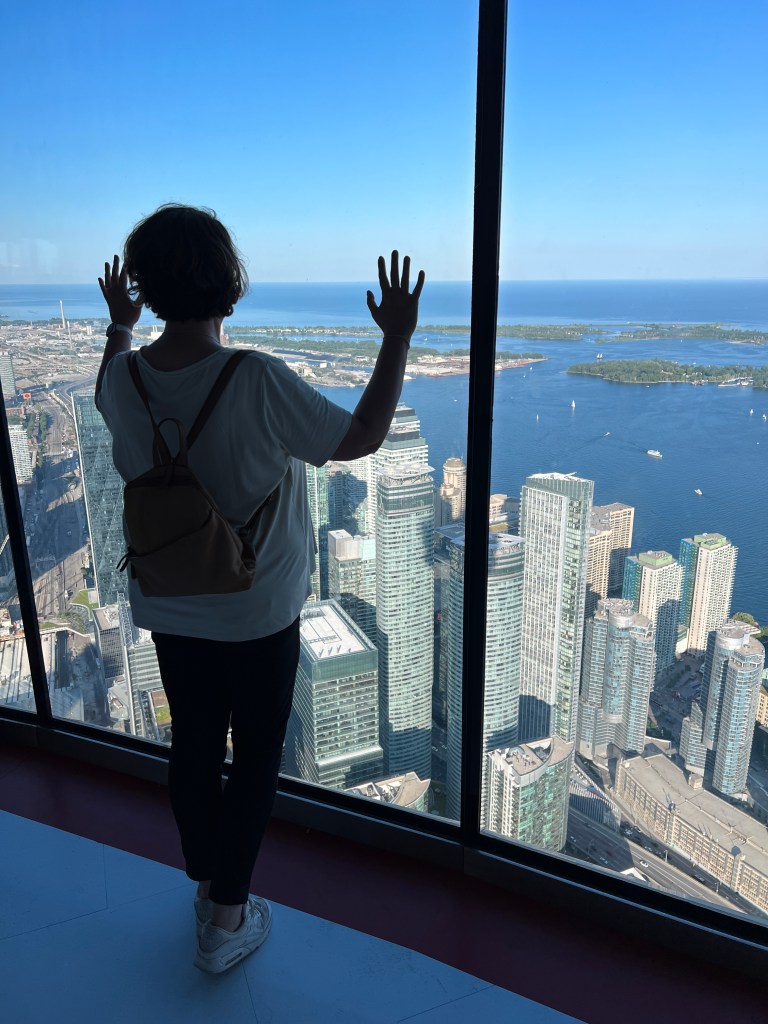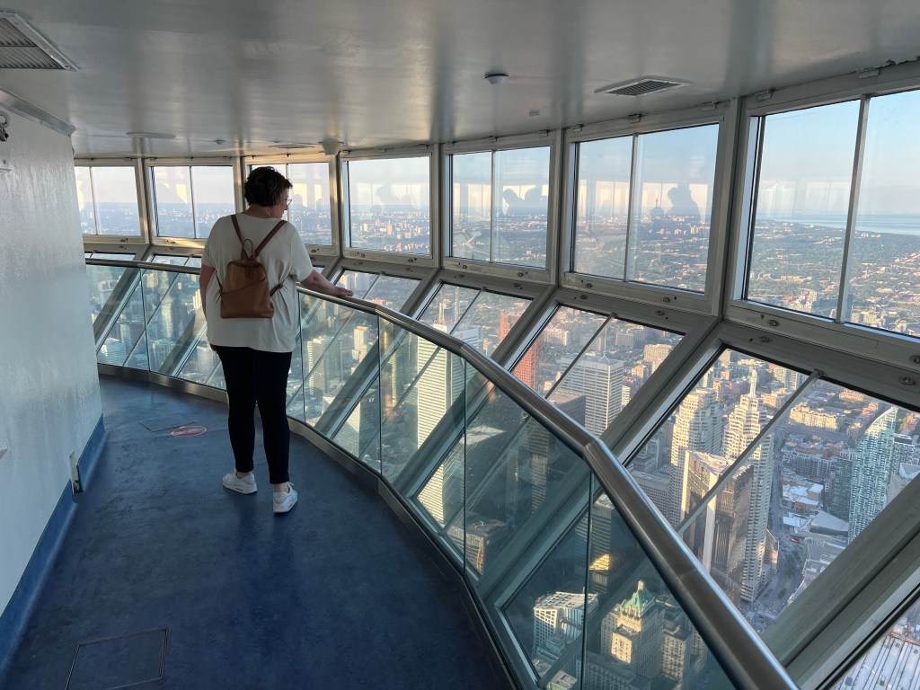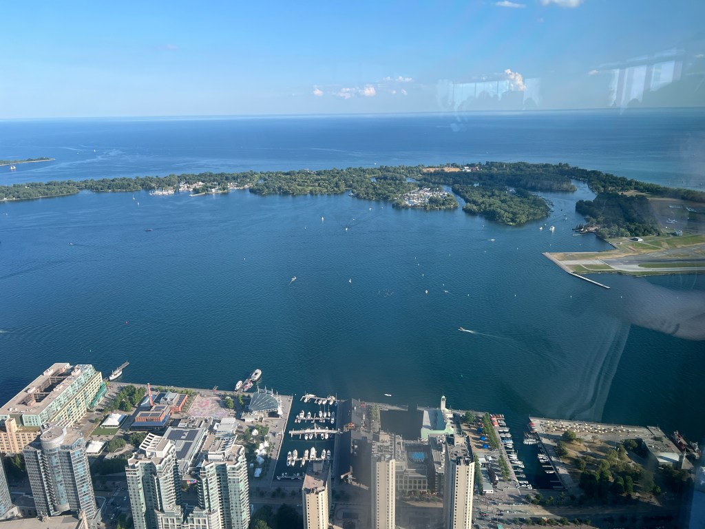 Met razende snelheid gaan we naar het observatiedek op 346 meter hoogte. We kunnen hier rondlopen en over de indrukwekkende skyline van Toronto kijken. Het uitzicht op Lake Ontario en de Toronto Islands is erg mooi.