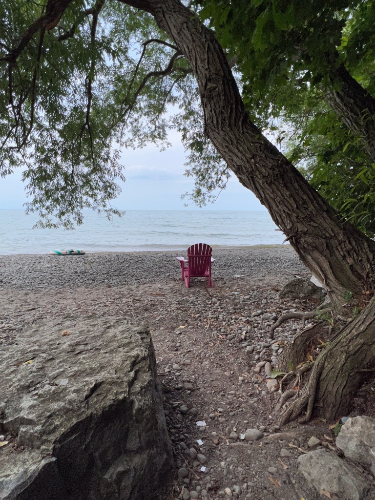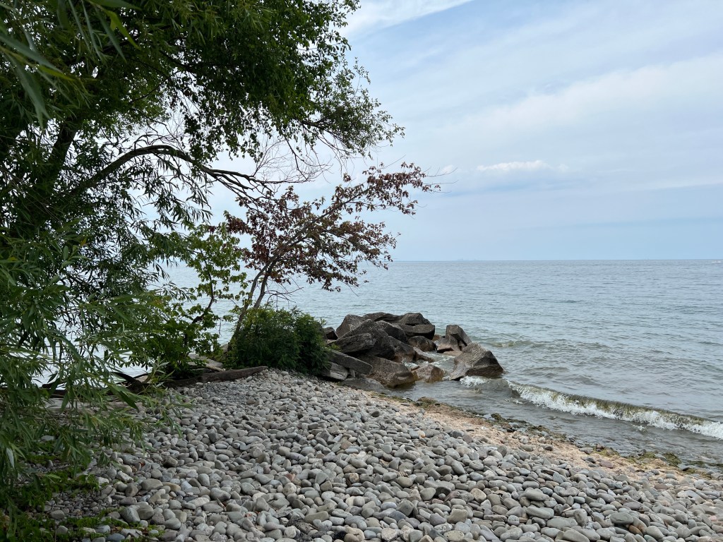 Er is ook nog een toegangsweg naar het kleine strand. In de verte zien we over het Lake Ontario de skyline van Toronto.