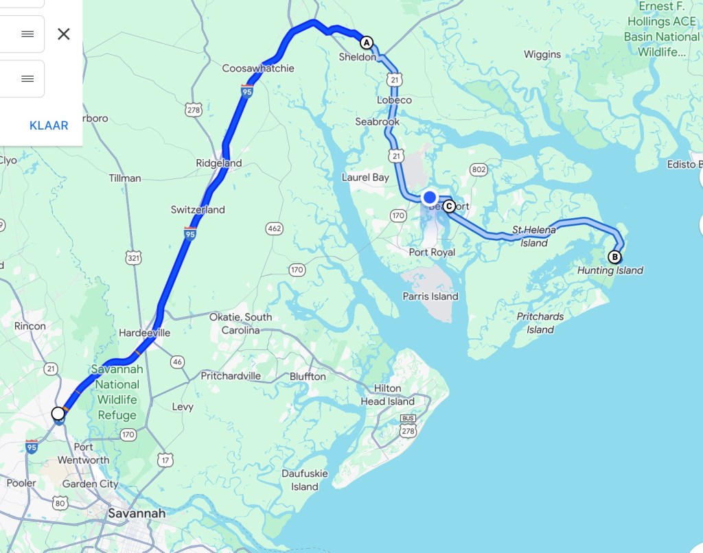 Vandaag willen we naar Hunting Island State Park. Het is een mooi park met mooie wandelpaden, een oude vuurtoren en veel palmbomen. In de moerassen van dit park zijn de Vietnam-scènes voor de film Forrest Gump opgenomen.