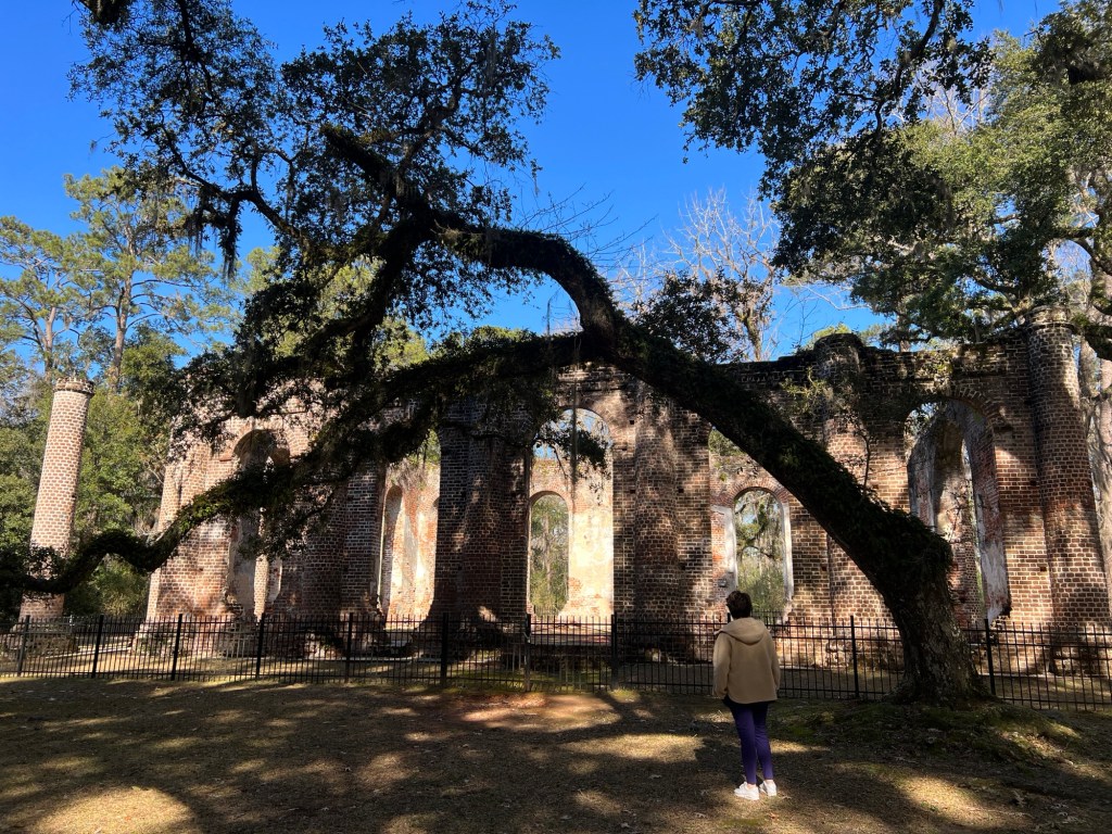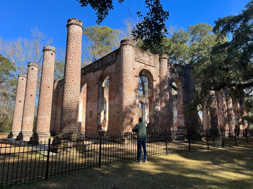 Maar eerst willen we langs Sheldon. Vlakbij ligt de Old Sheldon Church. Het is nu een ruïne, maar daardoor heel fotogeniek. Alhoewel er hier vroeger verschrikkelijke dingen zijn gebeurd. De kerk is in 1751-1757 gebouwd en in 1779 in brand gestoken. Het is daarna heropgebouwd en in de Civil War nog een keer in brand gestoken en daarna niet weer opnieuw opgebouwd.