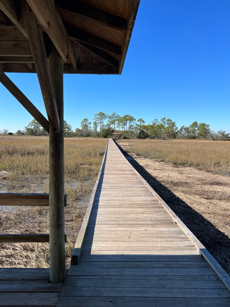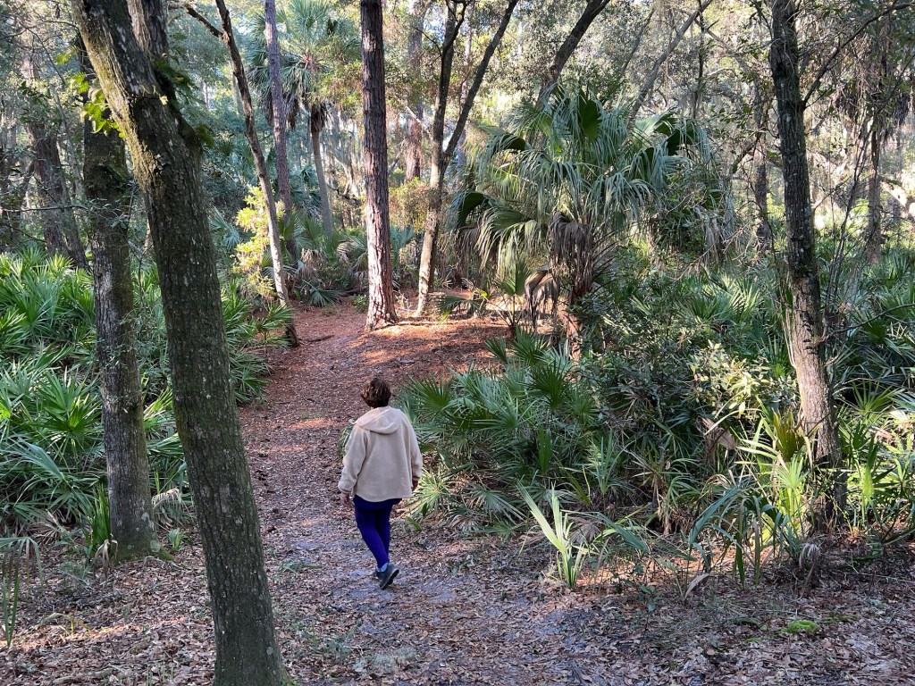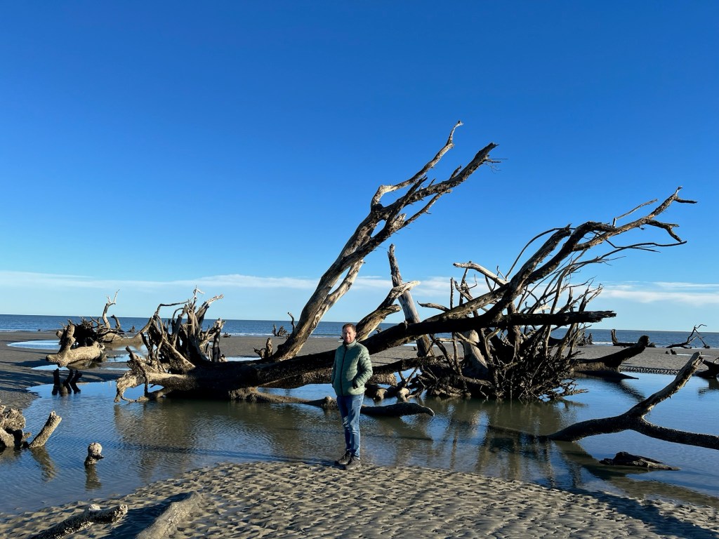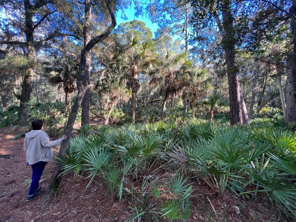 We rijden het park weer uit en gaan linksaf en rijden naar Hunting Island State Park Nature Center. Hier parkeren we de auto. We starten hier met onze wandeling. We doen verschillende trails. Eerst een stuk van de Maritime Forest trail, daarna pakken we de Marsh Boardwalk trail. Deze lopen we terug en gaan verder via de wat zwaardere maar veel mooiere Diamondback Rattlesnake trail. We lopen via de Lagoon trail weer terug en nog een laatste stuk van het strand. Hier liggen ook heel veel dode bomen. Al met al lopen we 9,5 km. Maar wat een prachtige gevarieerde route. Het was, ondanks dat het maar 12 graden was, ideaal wandelweer met veel zon.