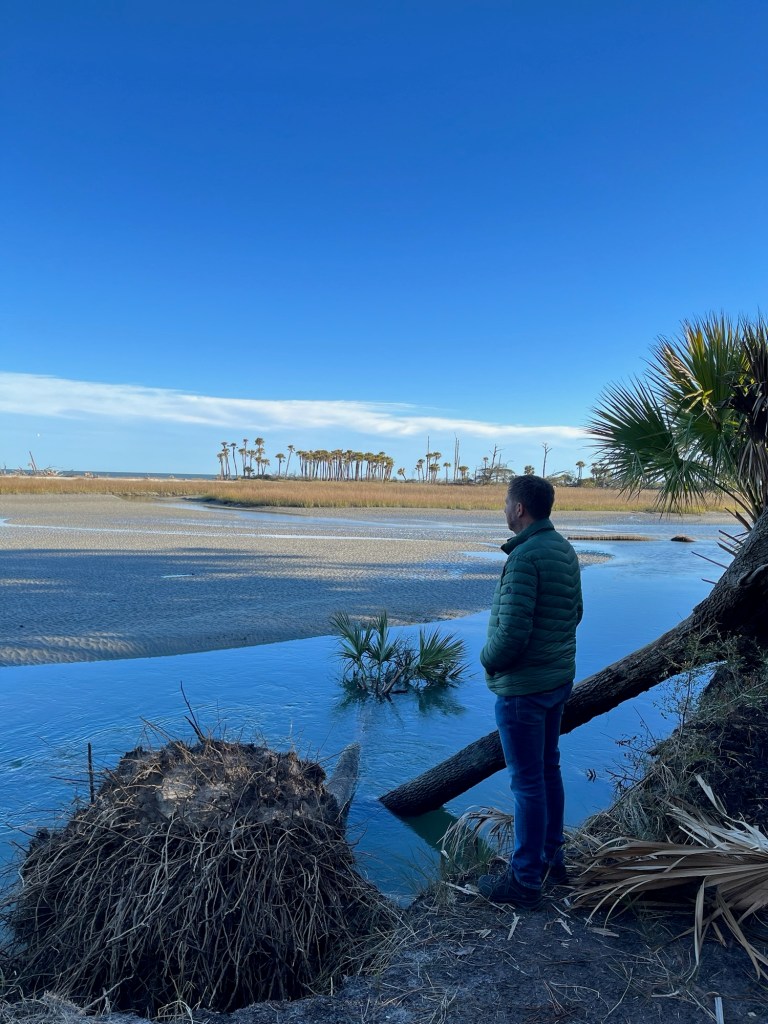 Het is een leuke stop. We rijden verder naar Hunting Island State Park. We komen langs het mooie stadje Beaufort en rijden via Lady’s Island en Santa Helena Island over een grote brug Hunting Island op. Het is een heel groen eiland. Met veel eiken- en palmbomen. Even later rijden we naar de ingang van het park waar we een entree betalen van 8 dollar p/p. Bij het mooie Visitor Centre vragen we informatie over de trails die we kunnen gaan wandelen. Voordat we gaan wandelen rijden we in het park naar de parkeerplaats bij de vuurtoren van het eiland. We nemen de route via het strand naar de vuurtoren. Op de vuurtoren zelf kun je niet meer, omdat het niet veilig is.